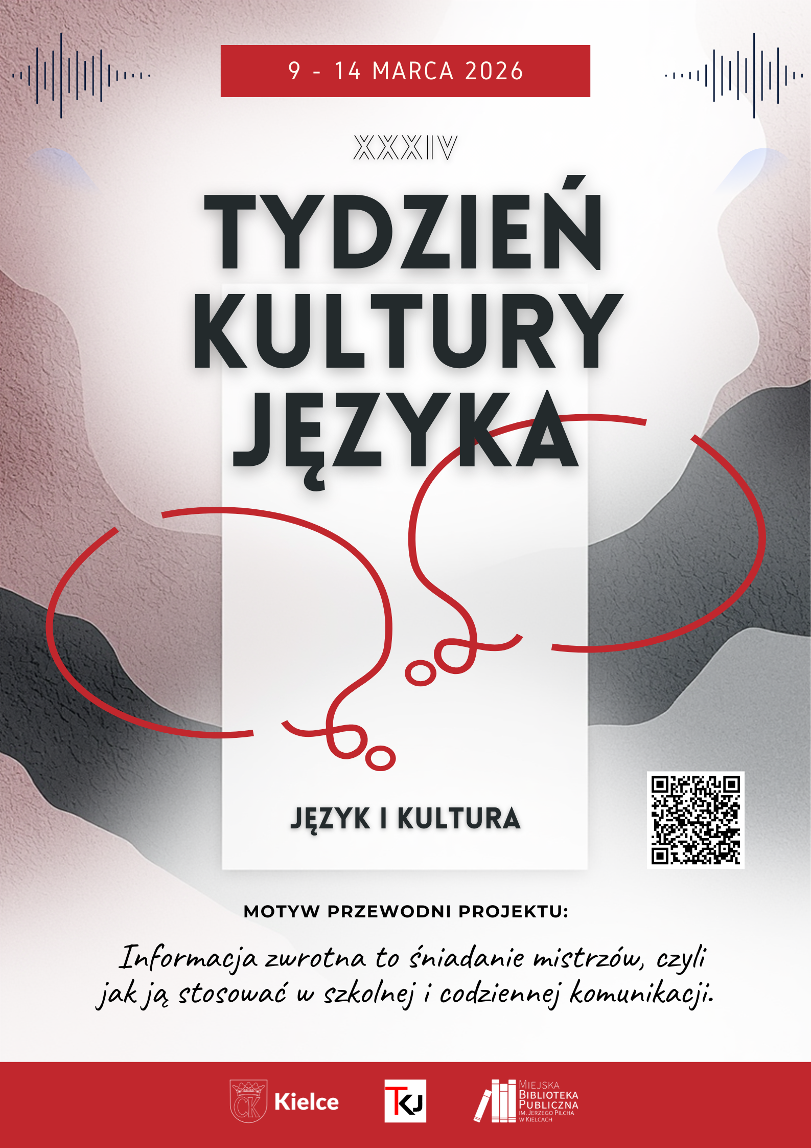 W dniach 9-14 marca 2026 r. będziemy obchodzić XXXIV Tydzień Kultury Języka. Motyw przewodni projektu: Informacja zwrotna to śniadanie mistrzów, czyli jak ją stosować w szkolnej i codziennej komunikacji. Zapraszamy dzieci, młodzież i dorosłych na spotkania z autorytetami i językiem polskim w MBP im. Jerzego Pilcha w Kielcach. W…