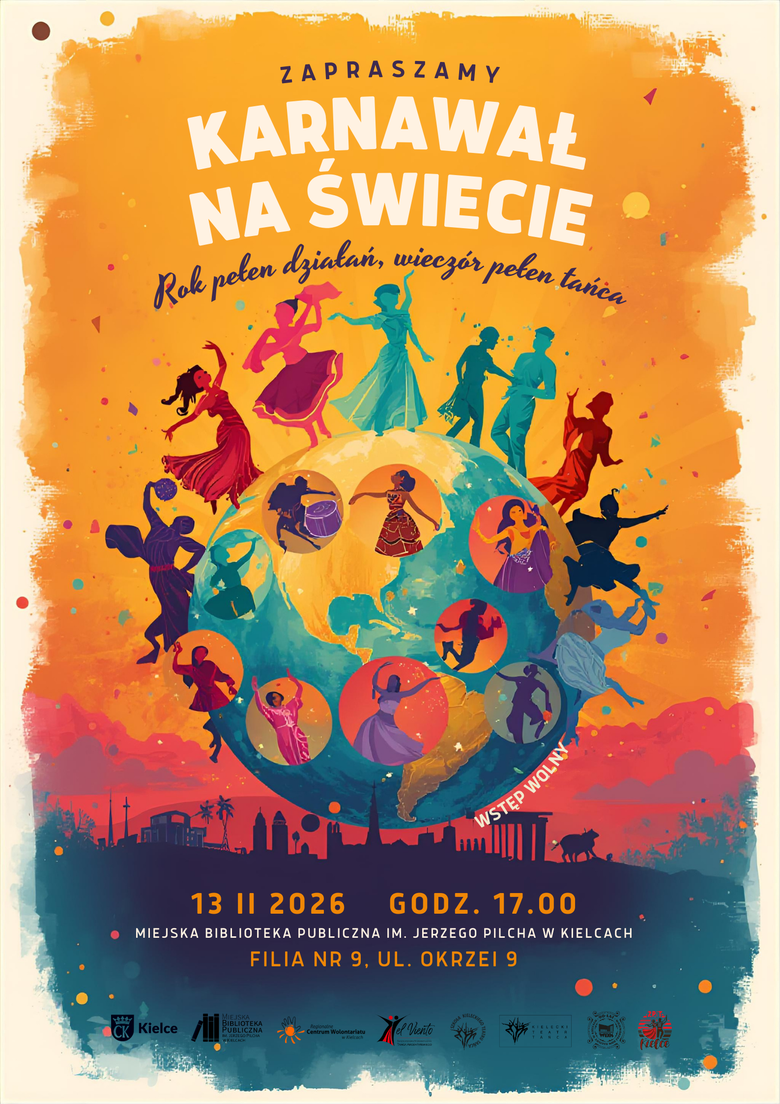Czas na karnawałowe szaleństwo i pożegnanie wolontariuszy, którzy wspierali przez cały rok pracę bibliotekarzy w Filii nr 9 MBP im. Jerzego Pilcha w Kielcach. Zapraszamy 13 lutego 2026 r. o godz. 17:00 do biblioteki przy ul. Okrzei 9. Radosny wieczór w rytmach całego świata wypełnią pokazy taneczne, występy wokalne, przegląd zw…