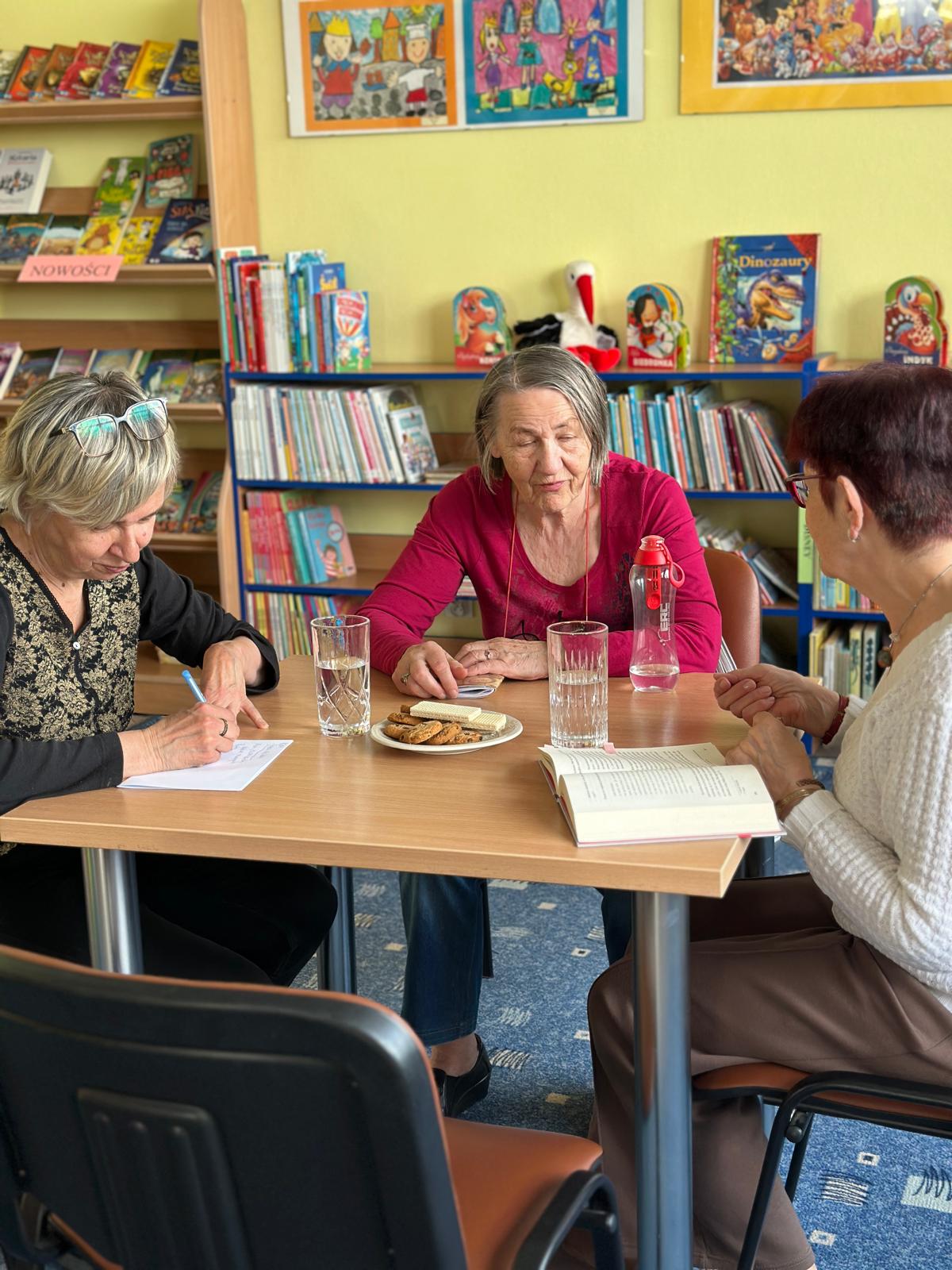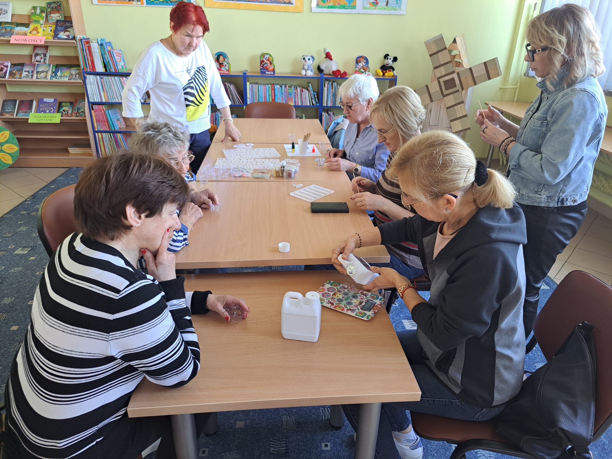 Filia nr 5 gościła panie z Klubu Seniora przy ulicy Warszawskiej w Kielcach. Panie wzięły udział w warsztatach z żywicy epoksydowej, uczyły się odmierzania proporcji żywicy i utwardzacza, mieszania składników, barwienia pigmentami oraz odpowietrzania żywicy, z której powstały breloczki w kształcie książek, zakładek i in.