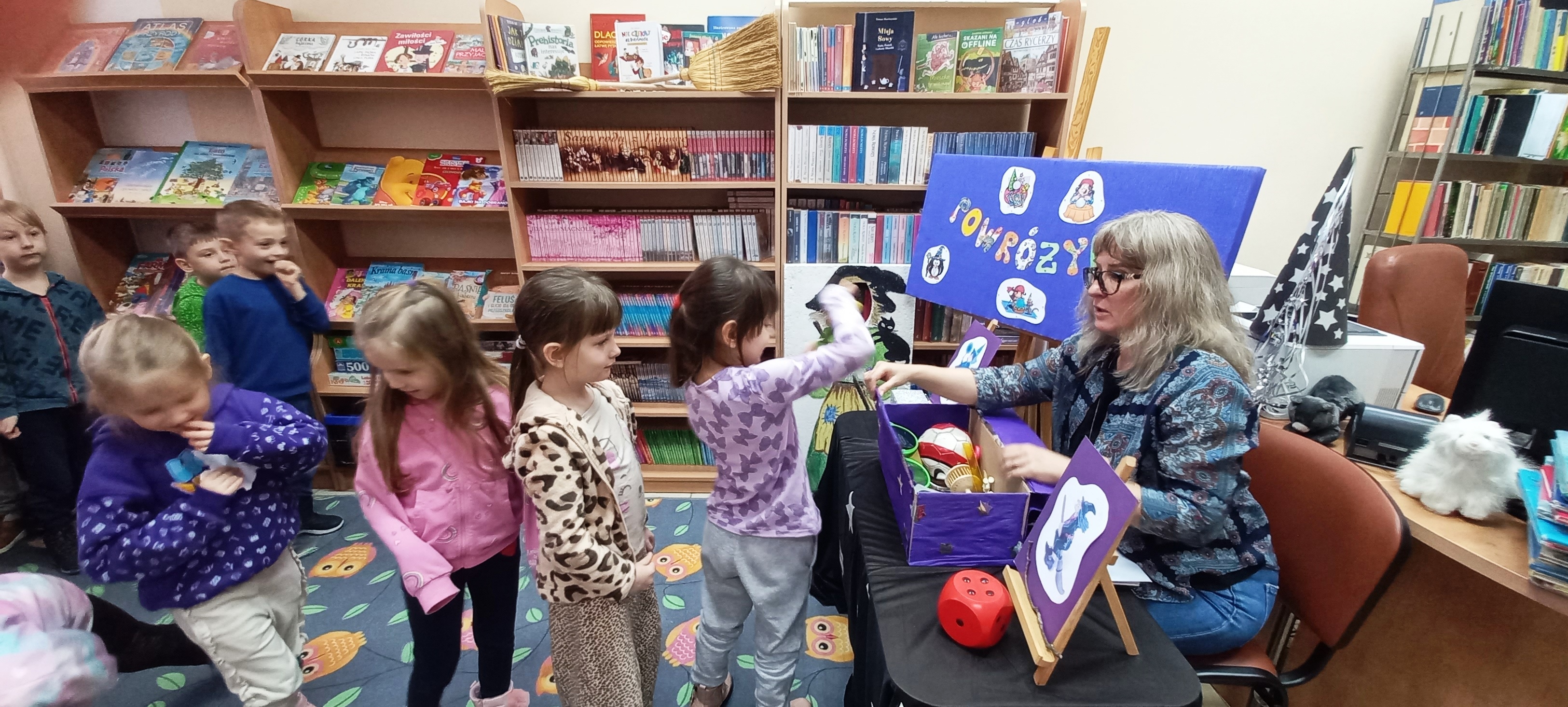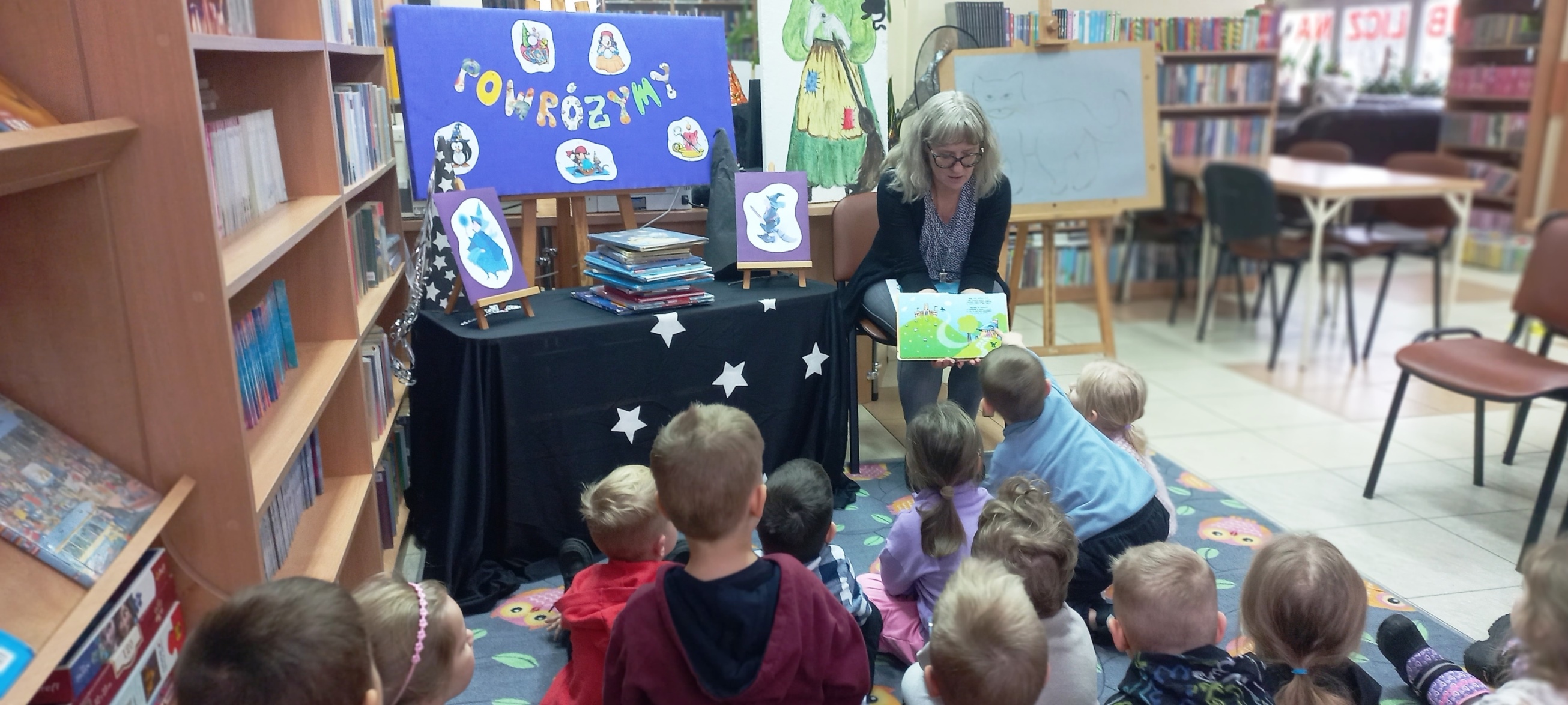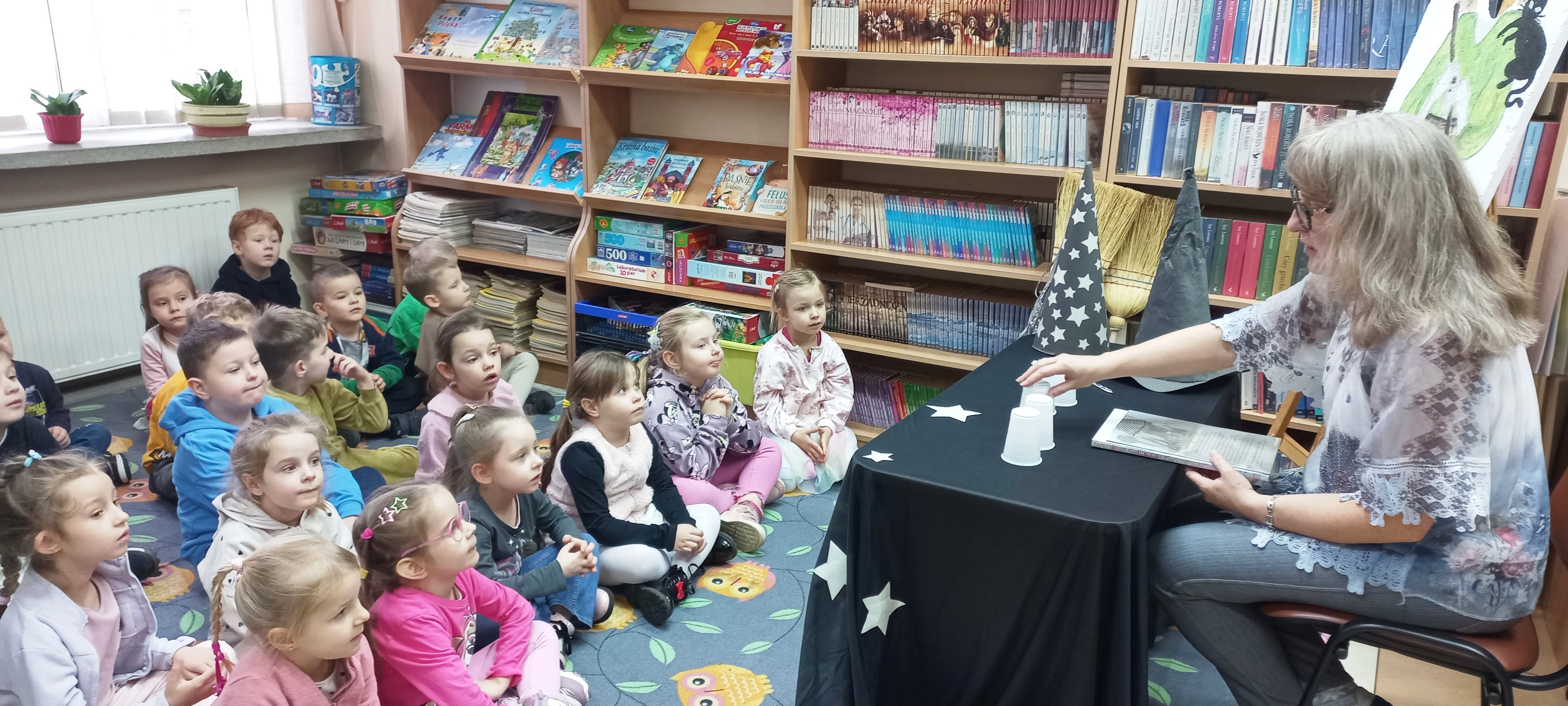 We wtorkowe przedpołudnie u nas czary! Czterolatki z PS nr 39 w Kielcach wysłuchały wiersza „Mała Wiedźma”, a następnie segregowaliśmy książki na te z bohaterkami Wróżkami i Czarownicami. Przyszła też pora na wróżby - z kolorowych karteczek i wycelowanych plastelinowymi kulkami części ciała kota - częstego towarzysza Czarownicy…