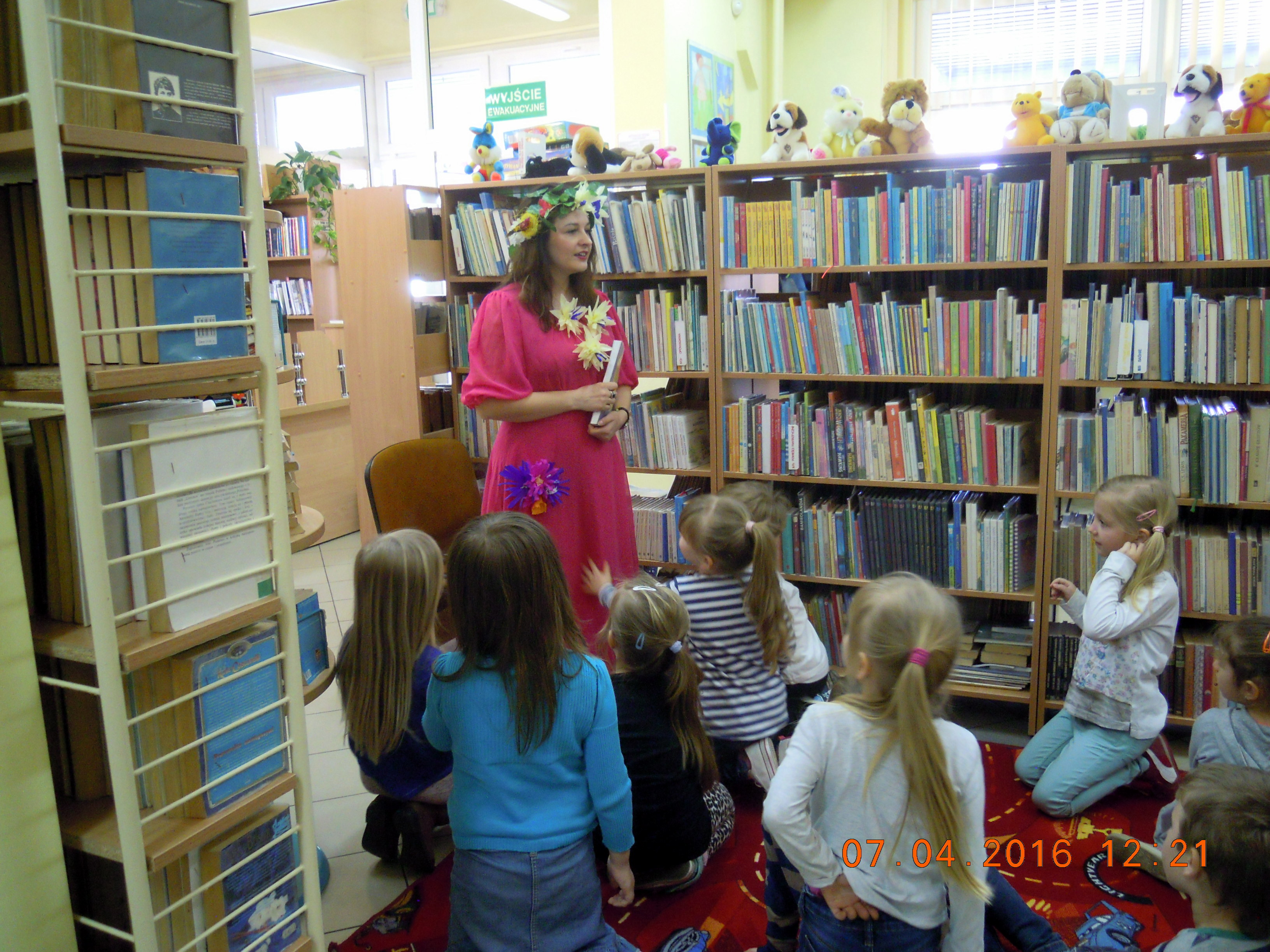 7 kwietnia dzieci z IV grupy z PS nr 13 powitały w naszej bibliotece specjalnego gościa. Była to Pani Wiosna, która opowiedziała przedszkolakom wiosenną historię o jeżyku Kolczatku. Zapoznała również maluchy z gatunkami przynoszonych przez siebie kwiatów. Ogromną przyjemność sprawiły dzieciom zagadki kończące spotkanie.