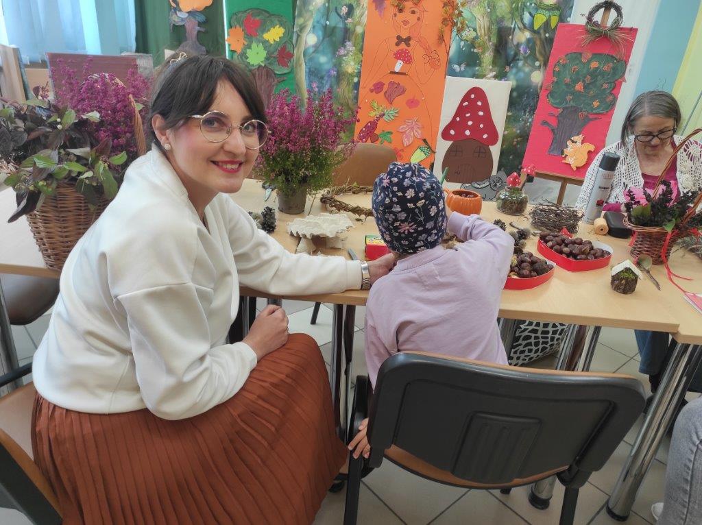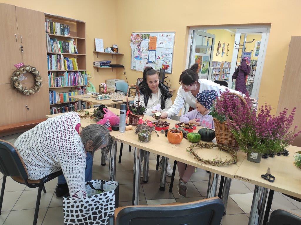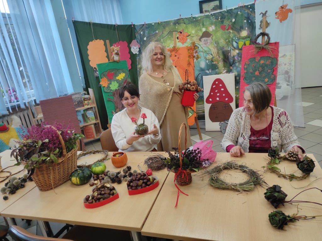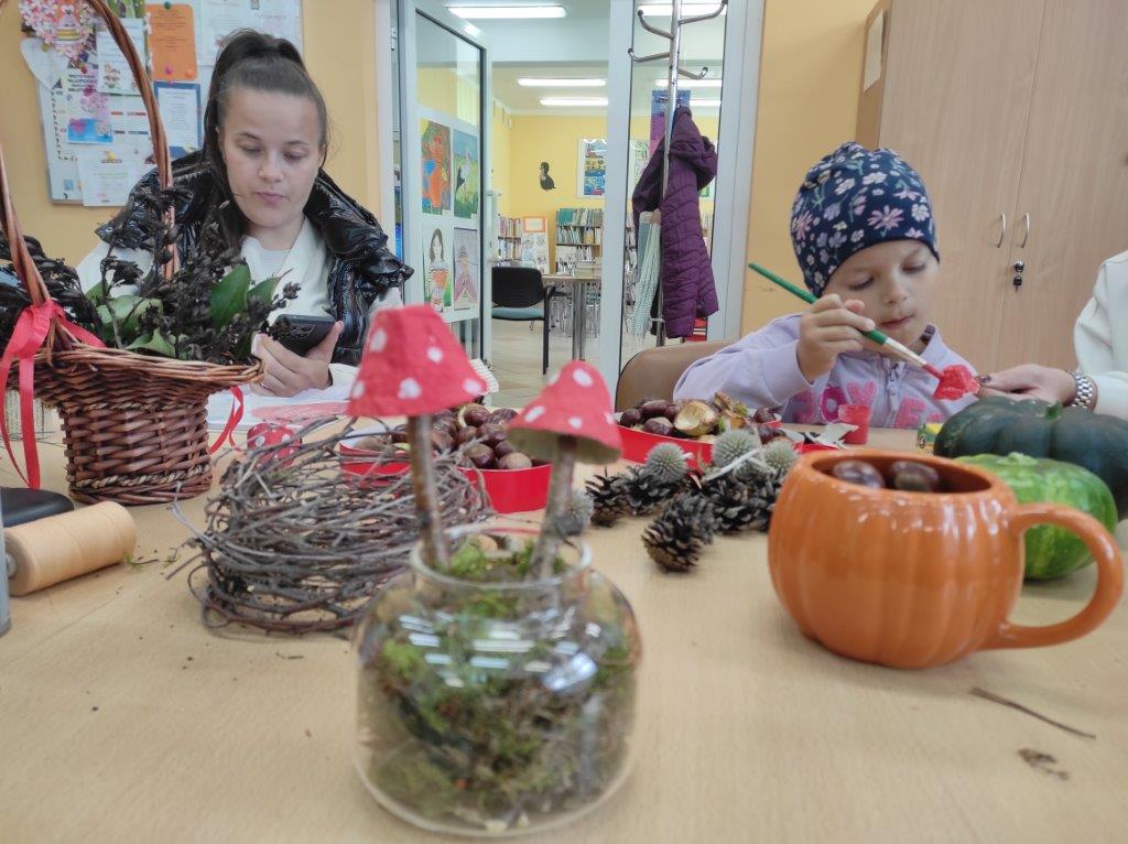 1 października 2025 r. w Filii nr 11 odbyły się jesienne warsztaty. Uczestniczyły w nich dzieci, rodzice i nasza czytelniczka pani Kazimiera, której pasją jest tworzenie małych arcydzieł z różnych materiałów. Na spotkaniu przy herbatce i ciastku tworzyliśmy jesienne stroiki: domki i grzybki z papieru, róże z żywych liści i wiele innych ozdób. Uczestnicy warsztatów poznali nowe techniki, dzięki czemu mogli wykorzystać własną kreatywność i rozwinąć sprawność manualną. Do tego celu wykorzystali artykuły papiernicze, pasmanteryjne oraz „dary jesieni” – liście, kasztany, gałązki. W ramach kreatywnej pracy i ciekawych pomysłów powstały niemalże profesjonalne jesienne inspiracje, a spotkanie przyniosło radość i satysfakcję ze wspólnie wykonanej pracy. Na koniec zachęciłyśmy uczestników do zapisania się do biblioteki, ponieważ czytanie to słodka przyjemność, szczególnie z kubkiem pysznej jesiennej czekolady.