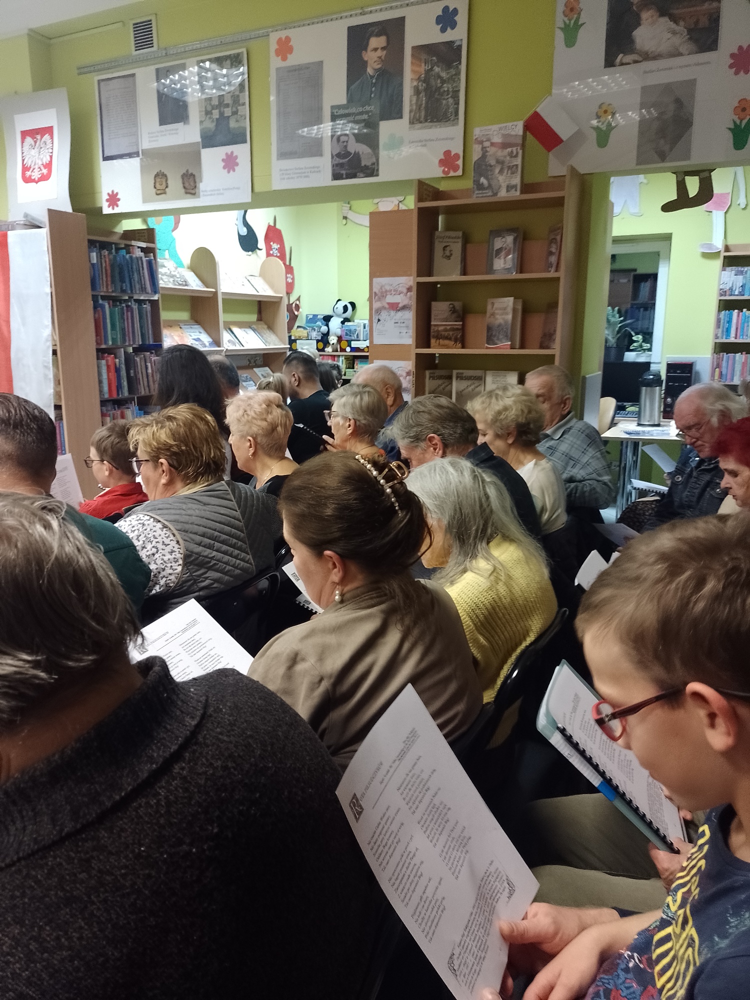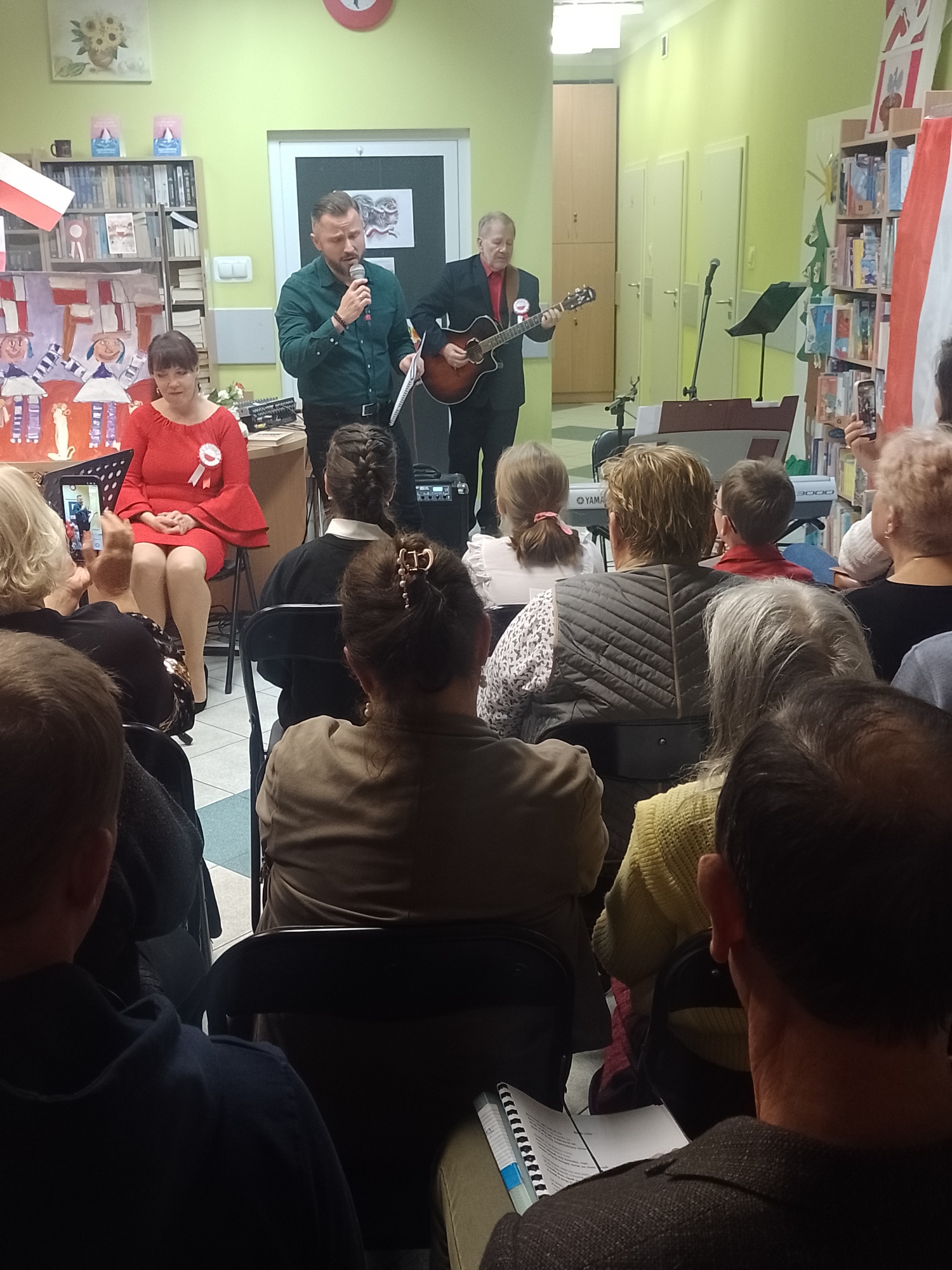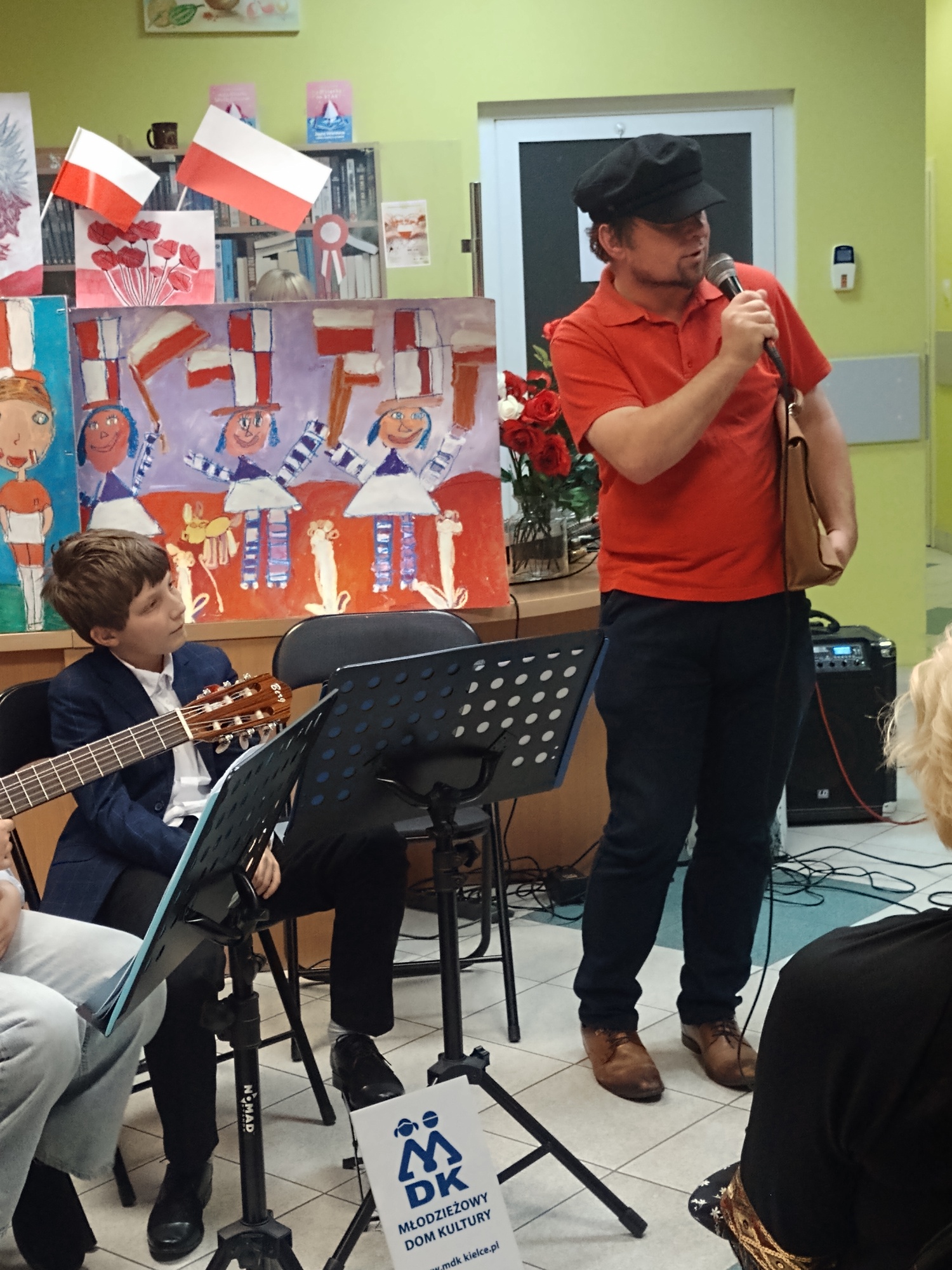 15 listopada 2025 r. biblioteka na Herbach, pięknie przystrojona, czekała na gości. W sobotnie popołudnie świętowaliśmy 107. rocznicę odzyskania niepodległości przez Polskę. Dekoracje i rysunki na spotkanie przygotowały dzieci i młodzież z Pracowni Plastycznych działających przy MDK w Kielcach, Zuzanny Starzyńskiej, Joanny Biskup-Brykczyńskiej oraz Przemysława Suligi. To listopadowe święto po raz kolejny uczciliśmy muzycznie i literacko. Pogoda nas trochę zawiodła, było szaro i deszczowo, natomiast publiczność, jak zawsze niezawodna, swoim licznym przybyciem rozjaśniła ten pochmurny dzień. Kolejne już wydarzenie z cyklu śpiewogranie i czytanie zostało przygotowane, przeprowadzone oraz muzycznie i literacko uatrakcyjnione przez Zespół Consonans, czyli Anetę i Stanisława Bętkowskich w towarzystwie Bogusława Capierzyńskiego.