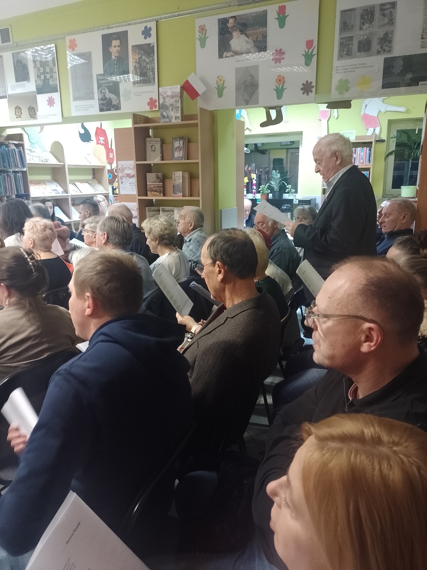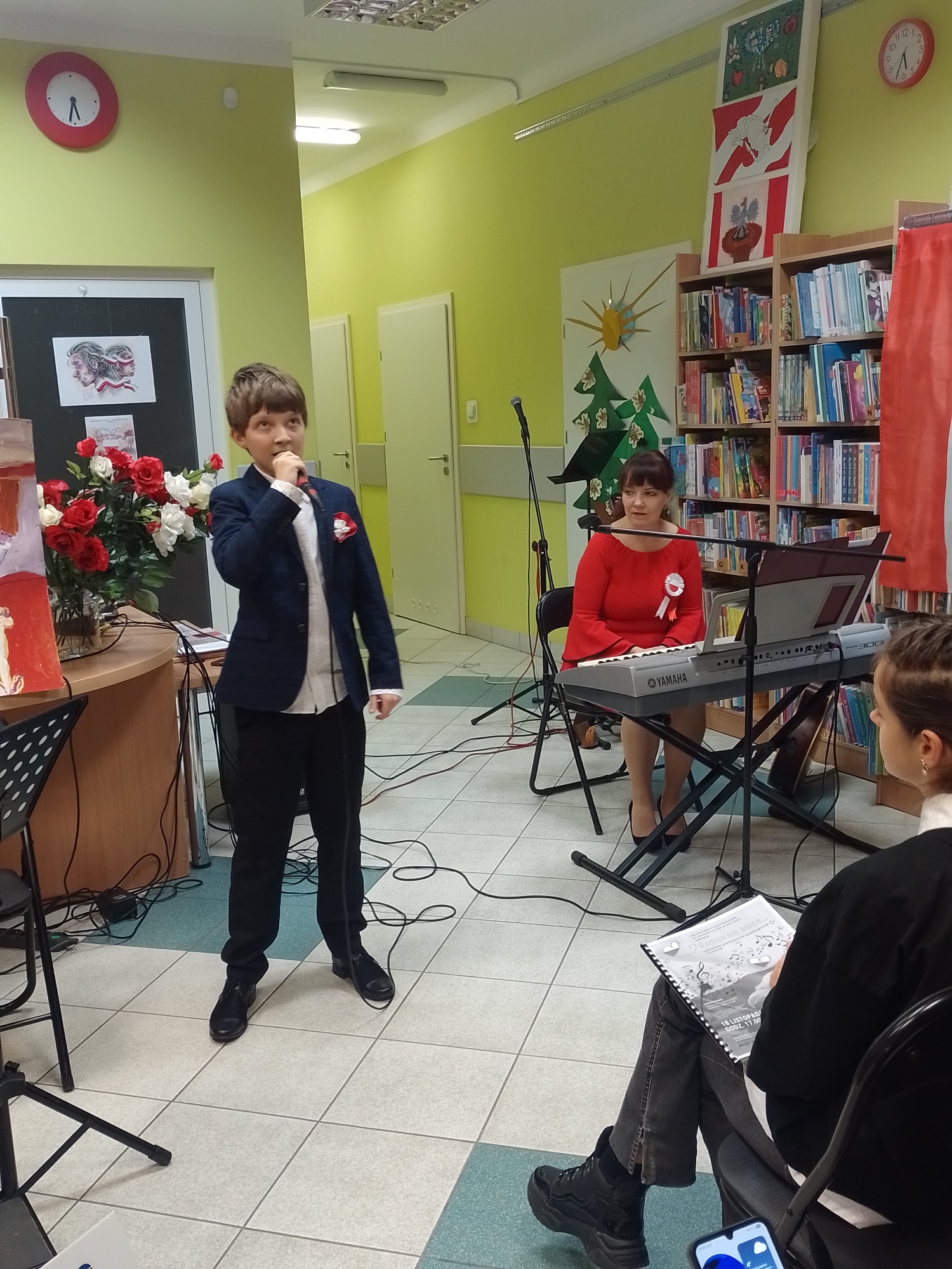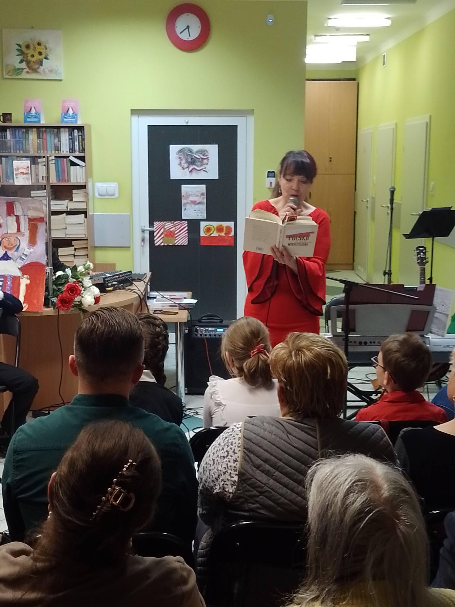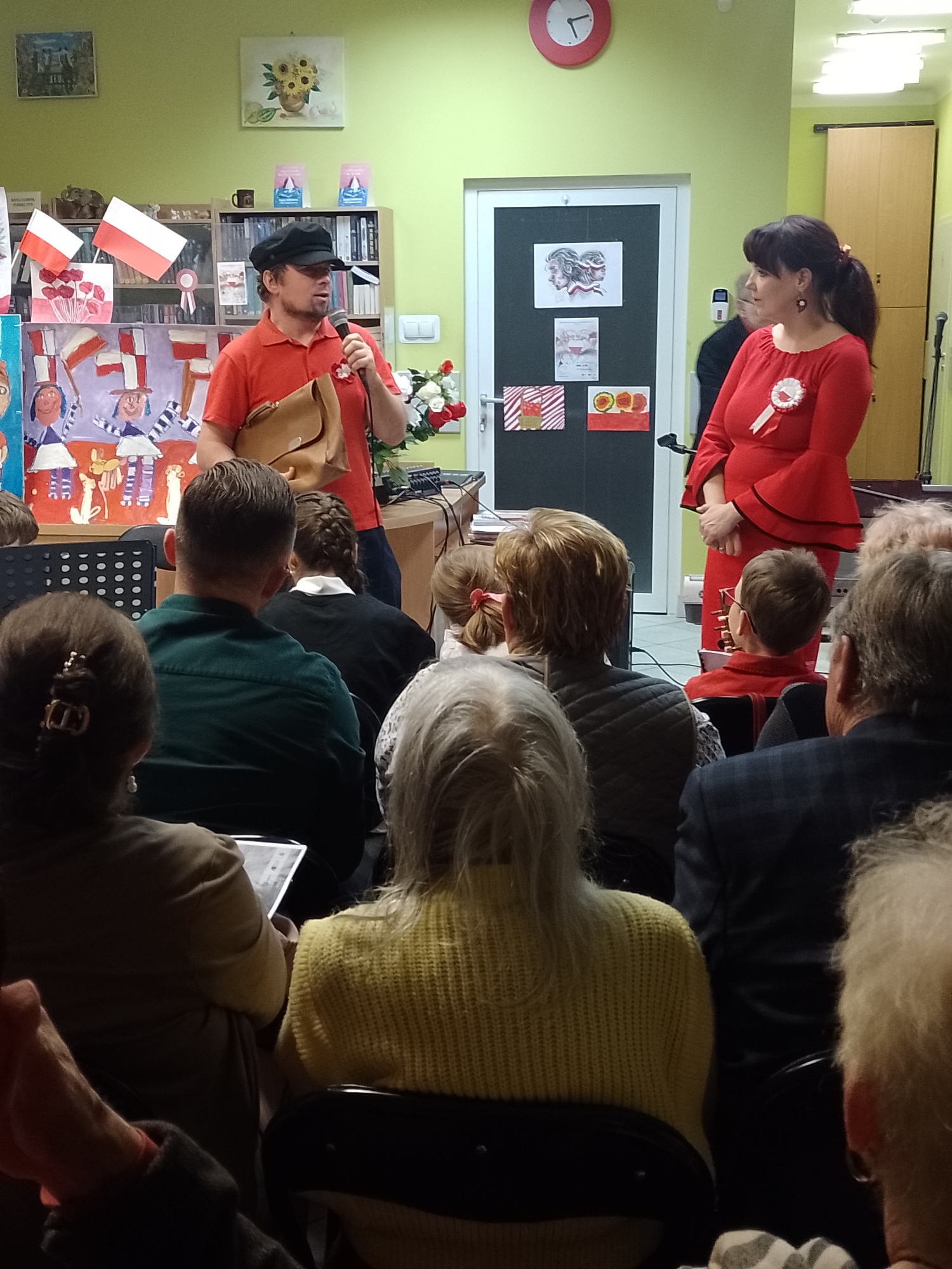 15 listopada 2025 r. biblioteka na Herbach, pięknie przystrojona, czekała na gości. W sobotnie popołudnie świętowaliśmy 107. rocznicę odzyskania niepodległości przez Polskę. Dekoracje i rysunki na spotkanie przygotowały dzieci i młodzież z Pracowni Plastycznych działających przy MDK w Kielcach, Zuzanny Starzyńskiej, Joanny Biskup-Brykczyńskiej oraz Przemysława Suligi. To listopadowe święto po raz kolejny uczciliśmy muzycznie i literacko. Pogoda nas trochę zawiodła, było szaro i deszczowo, natomiast publiczność, jak zawsze niezawodna, swoim licznym przybyciem rozjaśniła ten pochmurny dzień. Kolejne już wydarzenie z cyklu śpiewogranie i czytanie zostało przygotowane, przeprowadzone oraz muzycznie i literacko uatrakcyjnione przez Zespół Consonans, czyli Anetę i Stanisława Bętkowskich w towarzystwie Bogusława Capierzyńskiego.