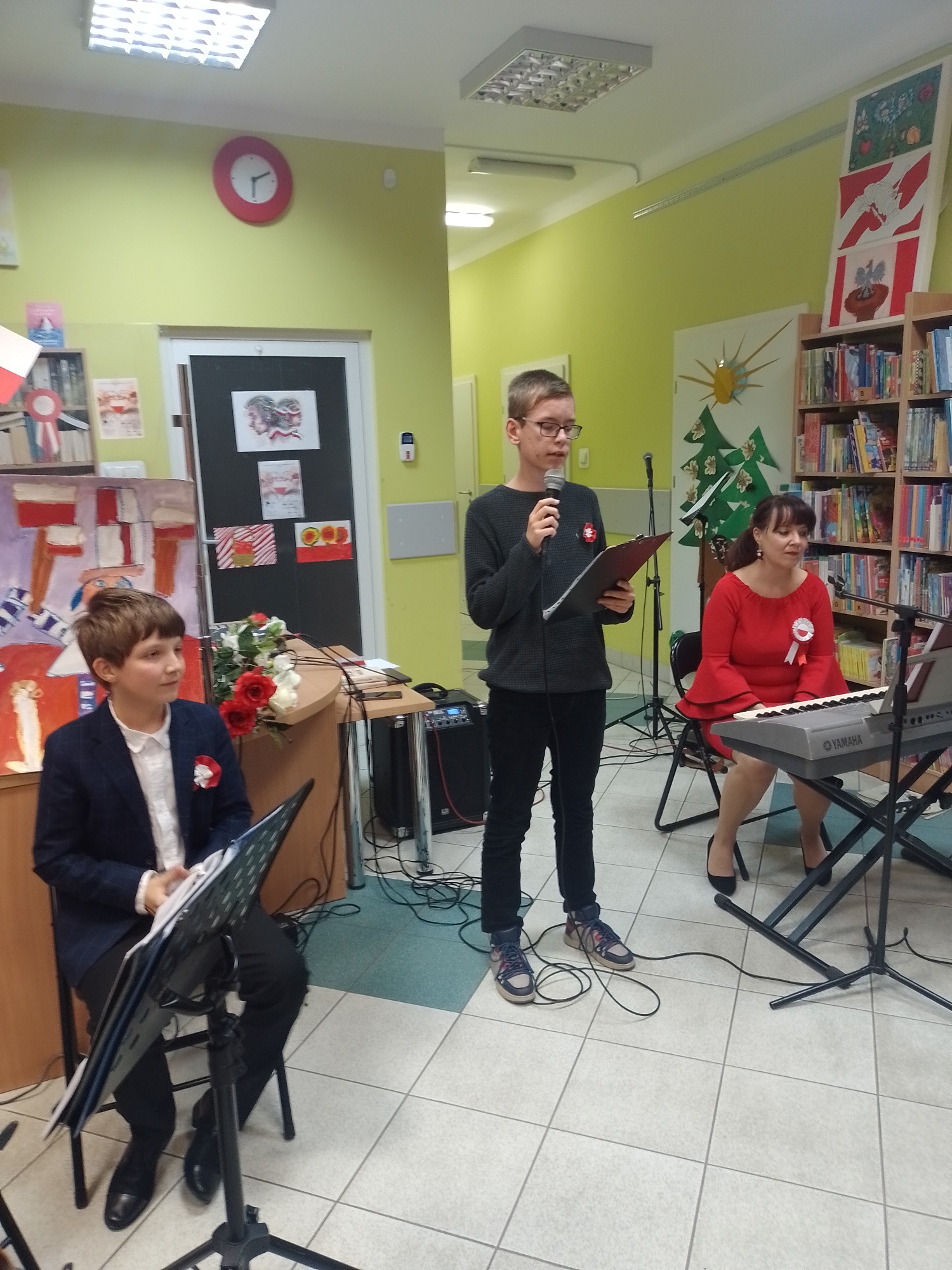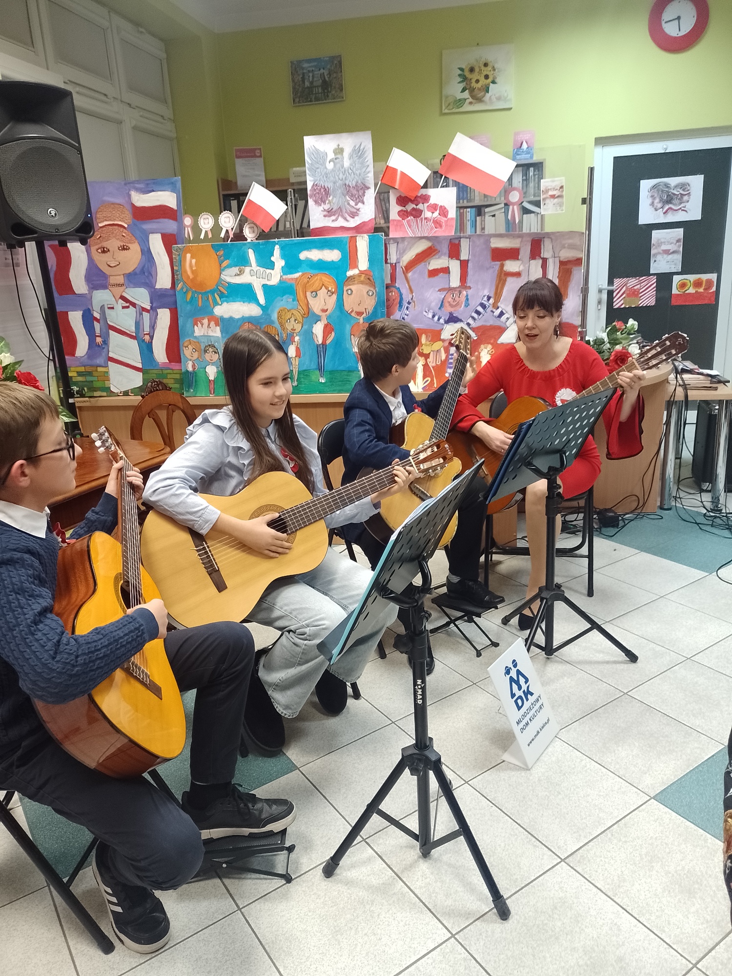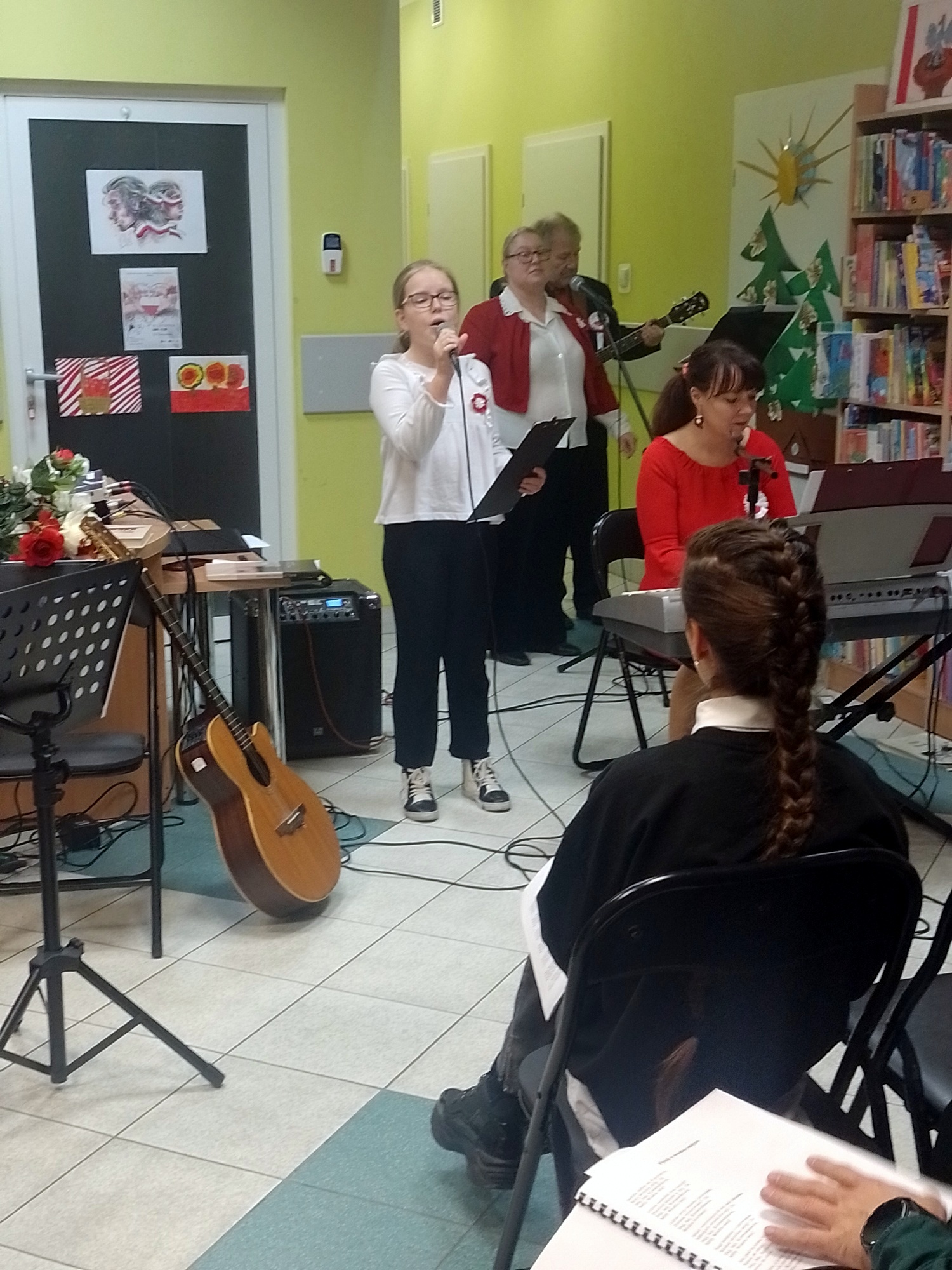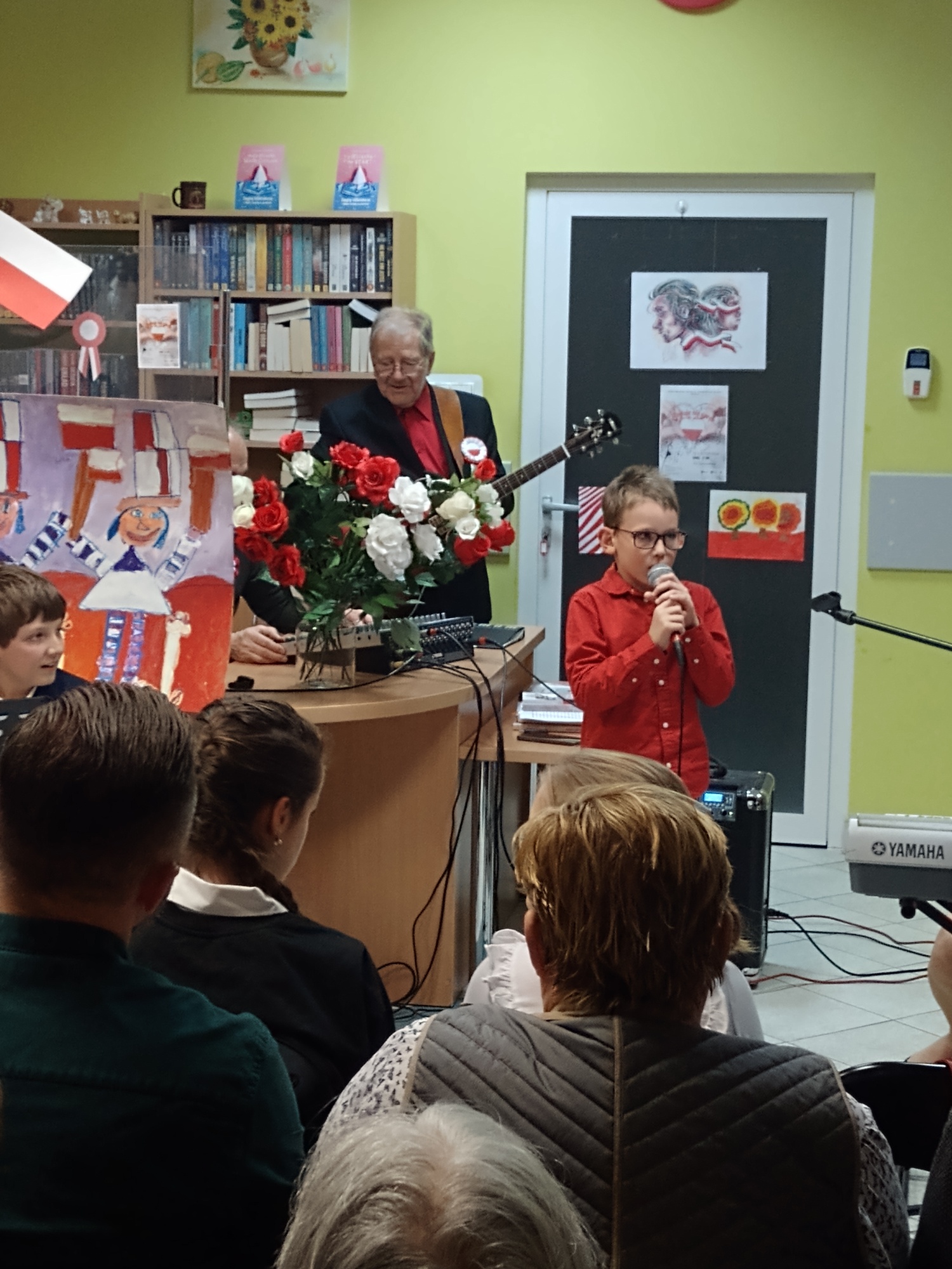 Publiczność wysłuchała granych i śpiewanych utworów patriotycznych przeplatanych fragmentami poezji i prozy. Występowali młodzi artyści: Maja i Franek ze Studia Piosenki „Marzenie” Marzeny Trzebińskiej, Janek, Wiktor, Marysia, Wojtek grający na akordeonie przepiękną „Etiudę”, również Kornelia i Ksawery. Młodzi wykonawcy to również uczniowie Anety Lech-Bętkowskiej z Pracowni Muzycznej MDK w Kielcach. W klimat spotkania wprowadziła widownię wyśpiewana przez Franka nastrojowa piosenka „Co to jest niepodległość?”. Wysłuchano również przejmującej "Pieśni obozowej” w wykonaniu Marysi. Wiersze o 11 listopada recytowali Kornelia i Ksawery, Janek wyrecytował wiersz „Znak” M. Łaszczuka.
