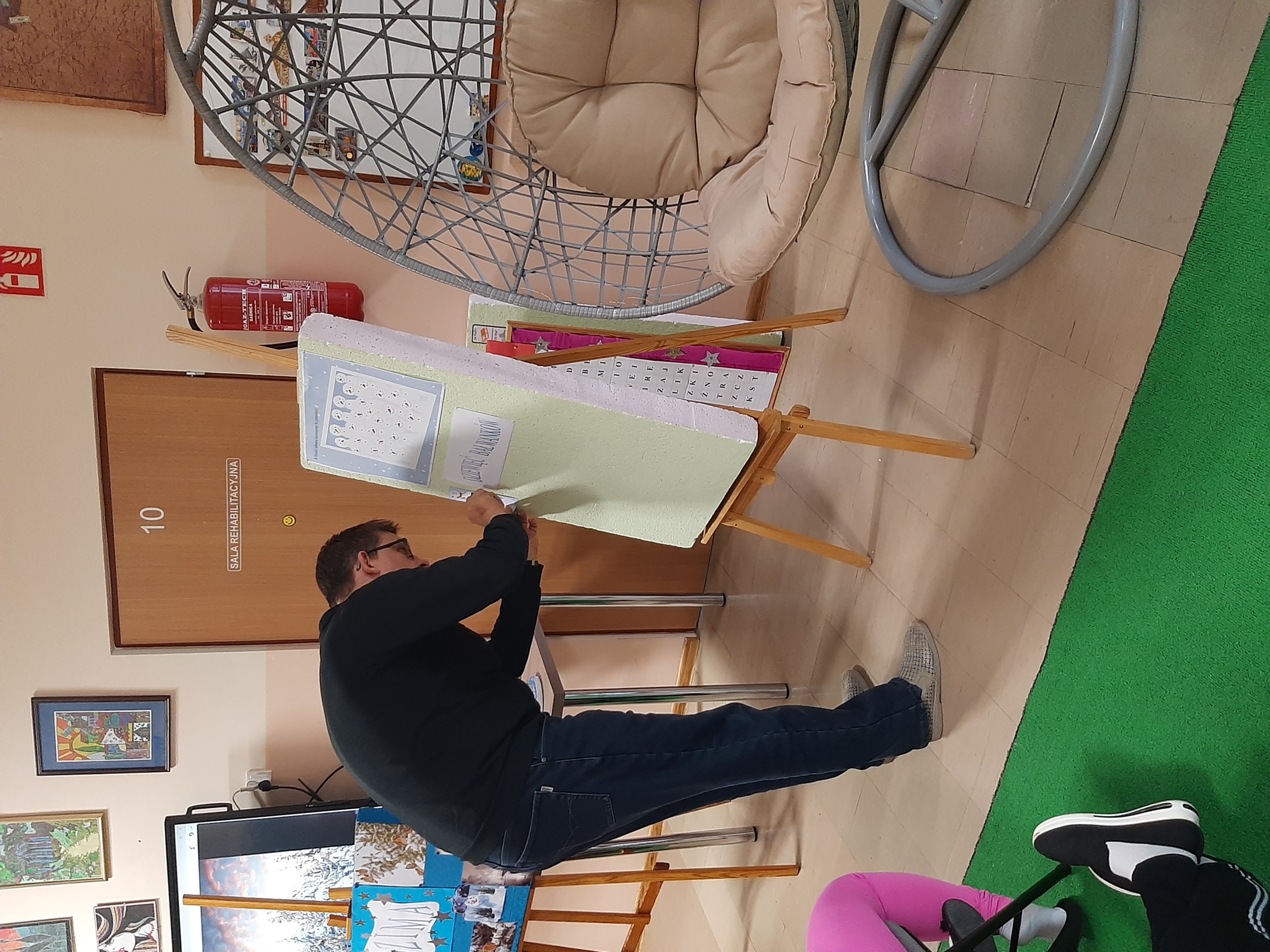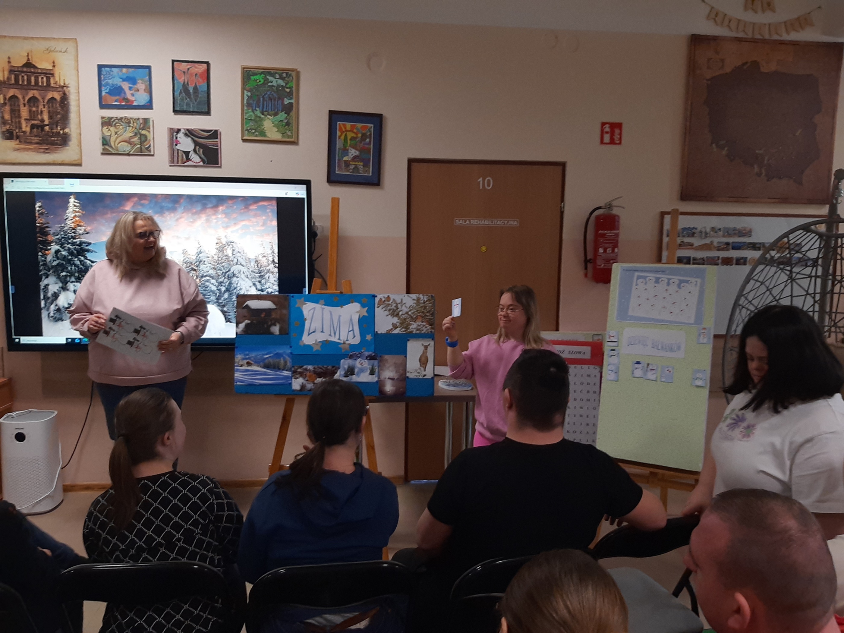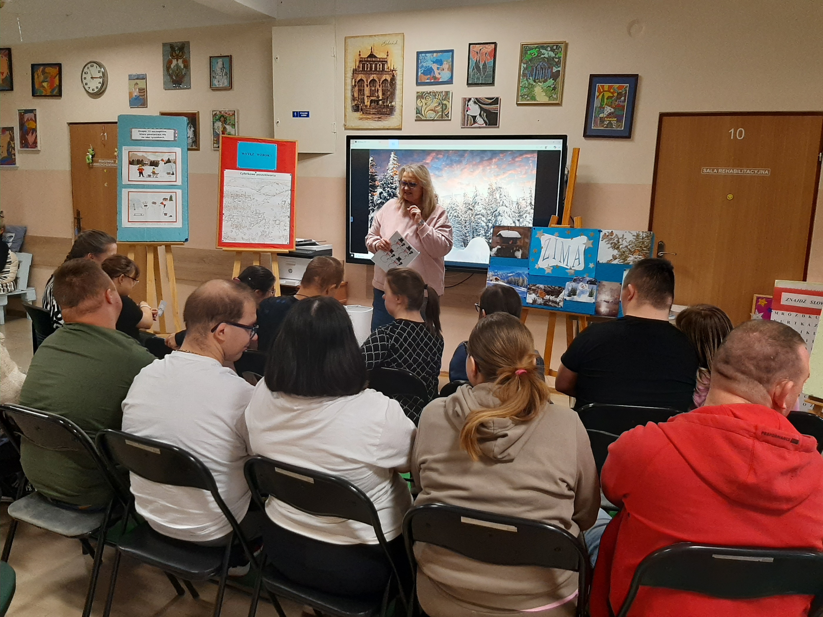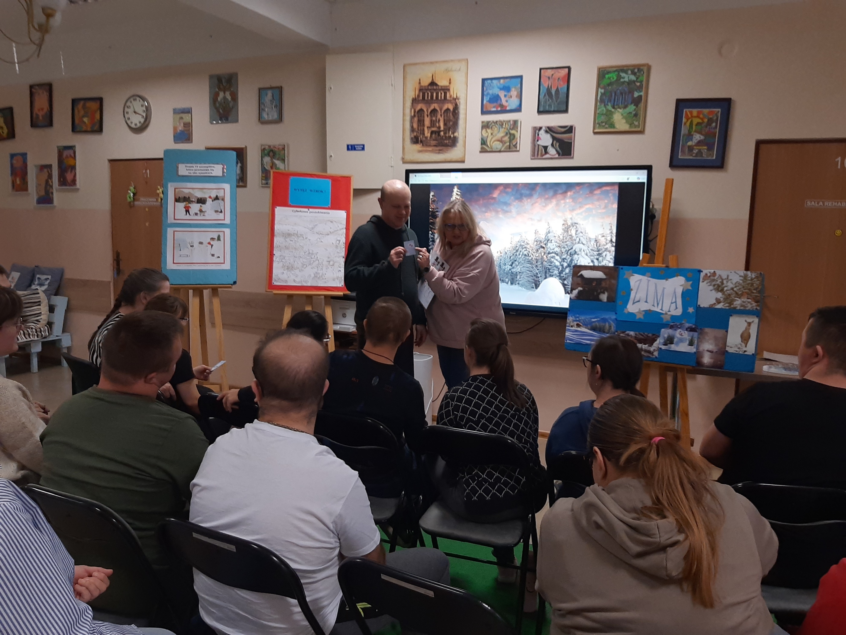 Wtorkowe spotkanie z młodzieżą z WTZ upłynęło na grach i zabawach, oczywiście tych w klimacie jeszcze zimowym. Każdy z uczestników chętnie i z wielkim zaangażowaniem brał udział w zaproponowanych konkurencjach. Były quizy, gra „Ja mam…, kto ma”, poszukiwania ukrytych symboli zimowych, ponadto wszyscy wytężali wzrok za zagubionymi cyframi, by wreszcie zweryfikować swoją zimową wiedzę w przygotowanym teście. Zaproponowana zabawa z kulami śnieżnymi spotkała się wielkim entuzjazmem. Każdy chciał się sprawdzić. Byli świetni!
