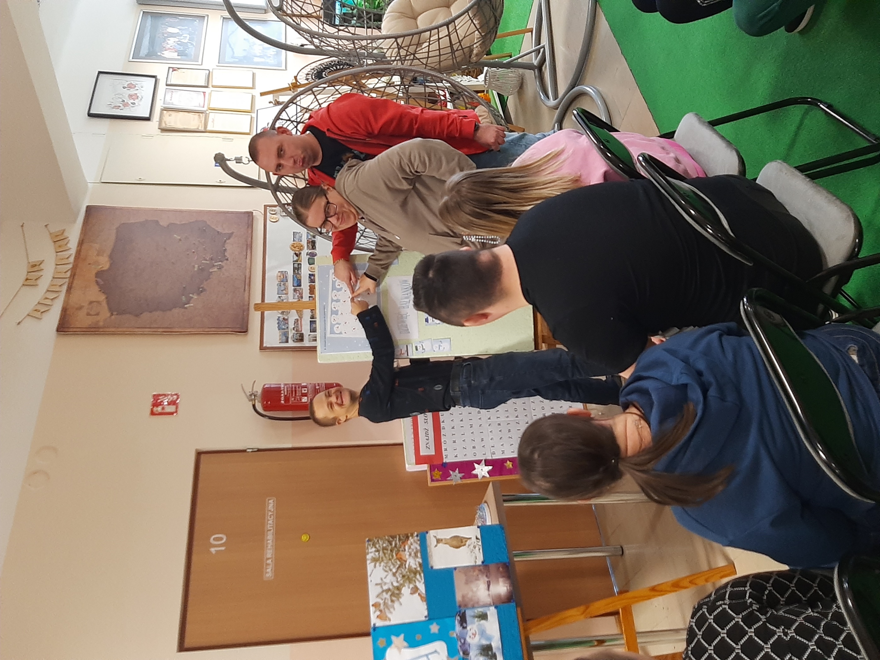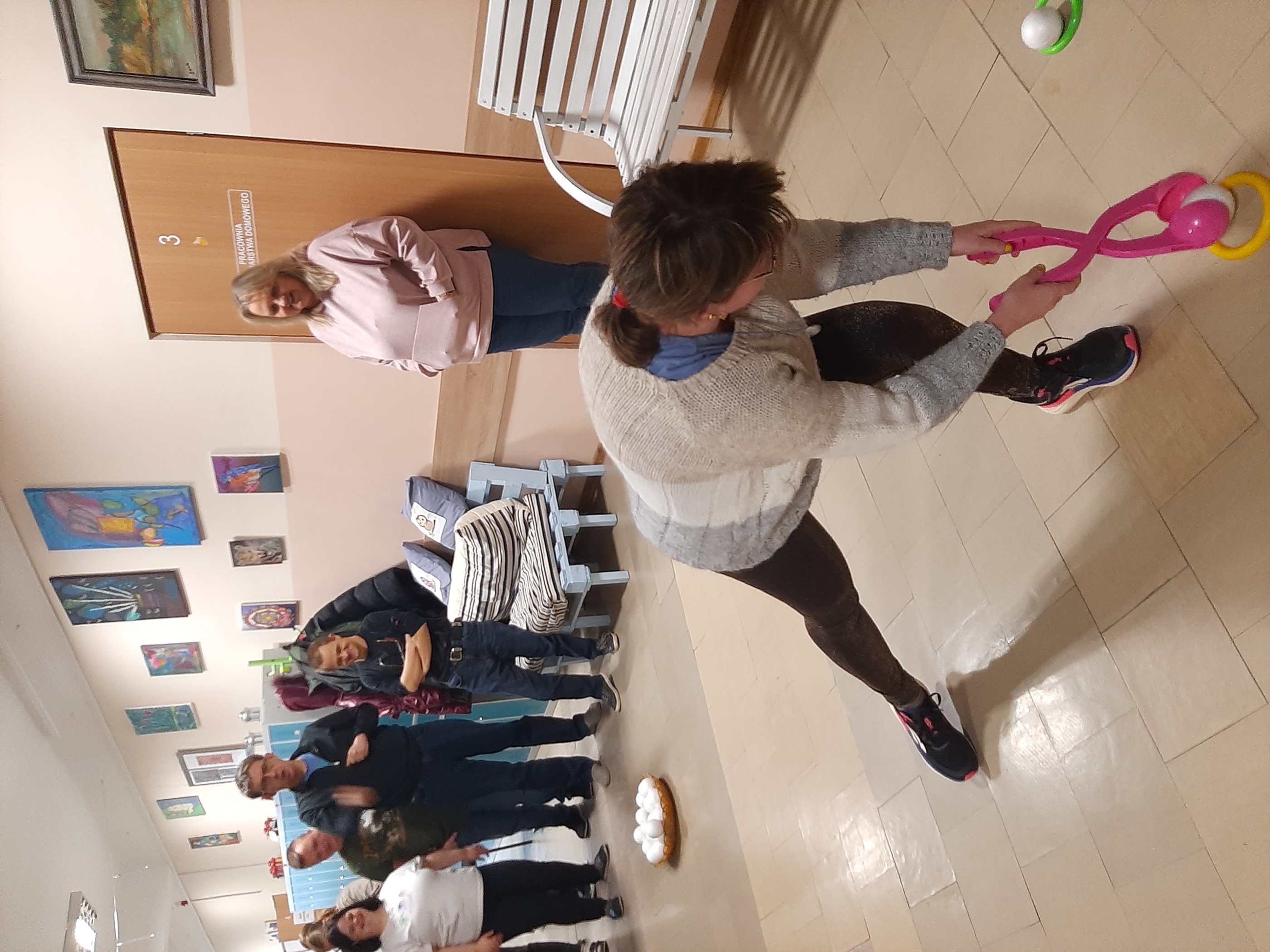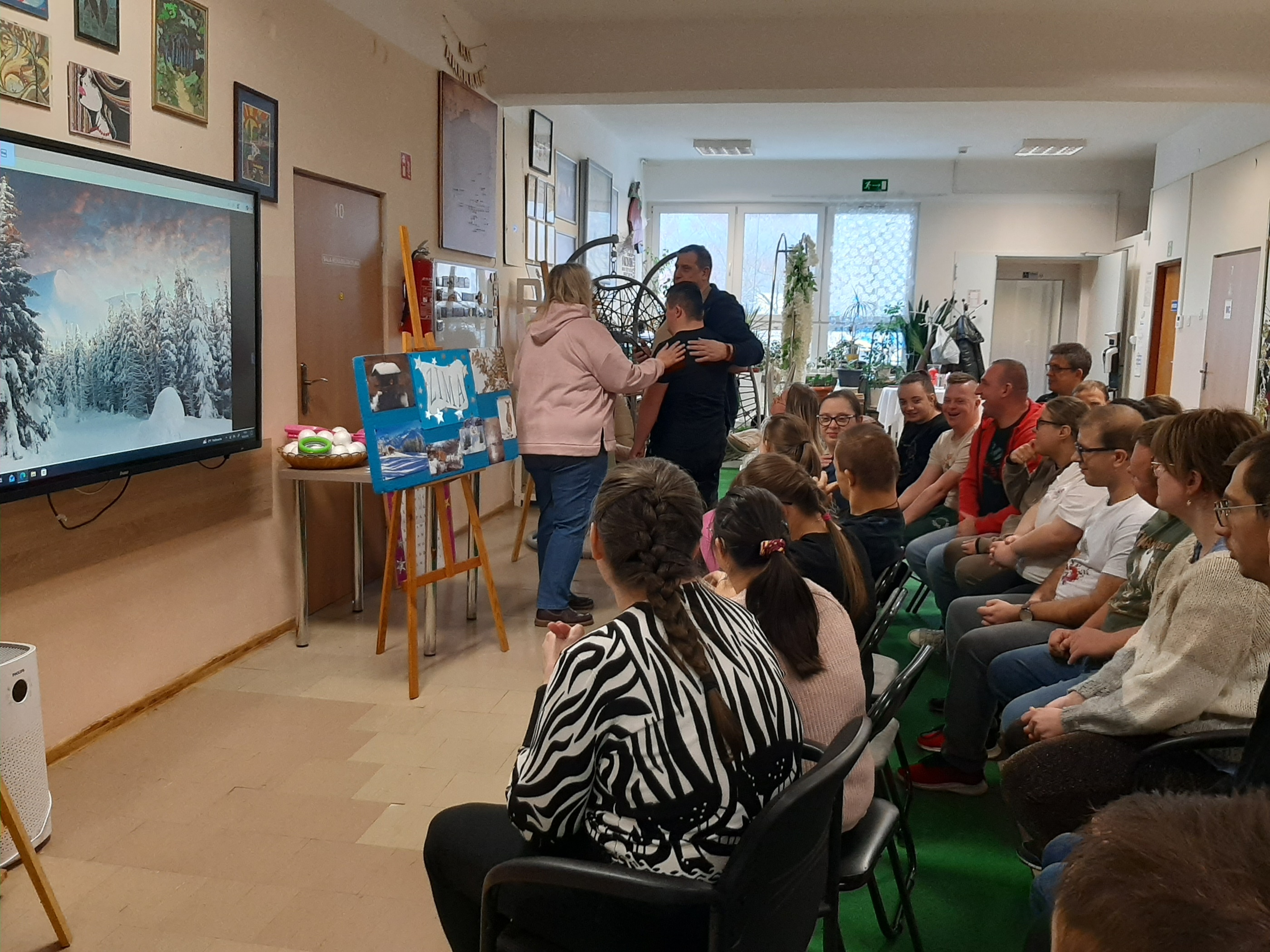Wtorkowe spotkanie z młodzieżą z WTZ upłynęło na grach i zabawach, oczywiście tych w klimacie jeszcze zimowym. Każdy z uczestników chętnie i z wielkim zaangażowaniem brał udział w zaproponowanych konkurencjach. Były quizy, gra „Ja mam…, kto ma”, poszukiwania ukrytych symboli zimowych, ponadto wszyscy wytężali wzrok za zagubionymi cyframi, by wreszcie zweryfikować swoją zimową wiedzę w przygotowanym teście. Zaproponowana zabawa z kulami śnieżnymi spotkała się wielkim entuzjazmem. Każdy chciał się sprawdzić. Byli świetni!