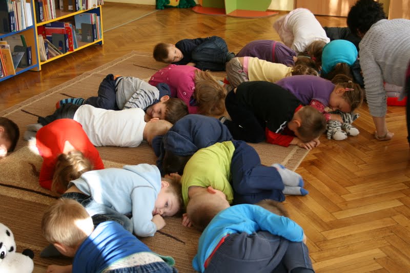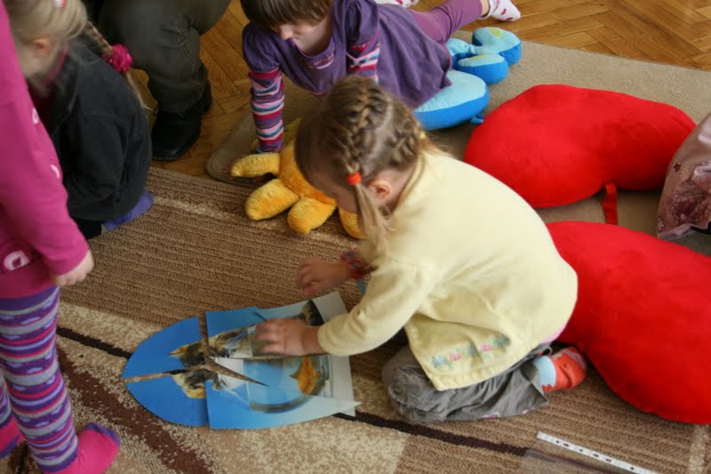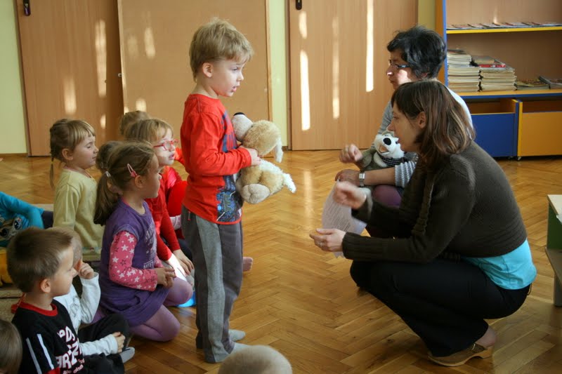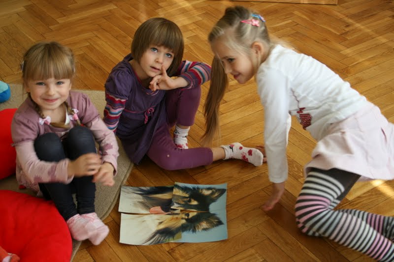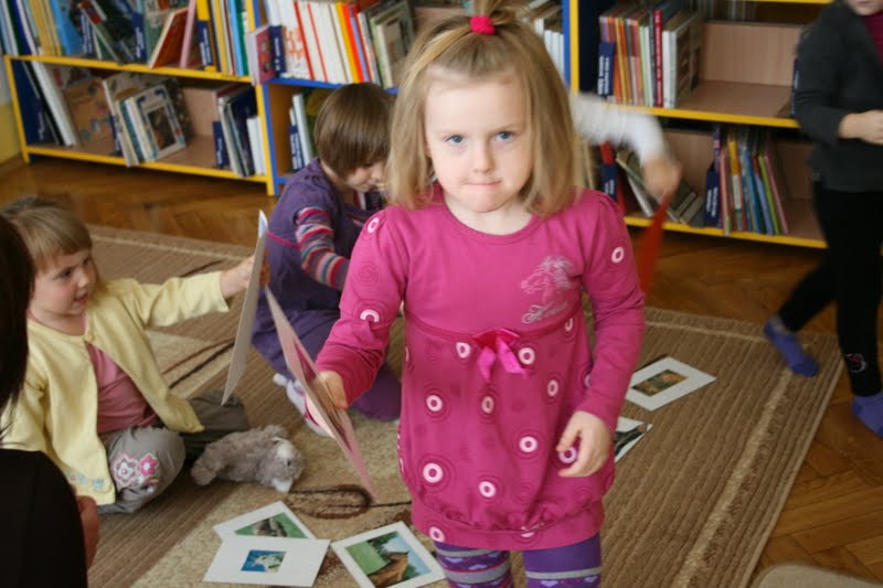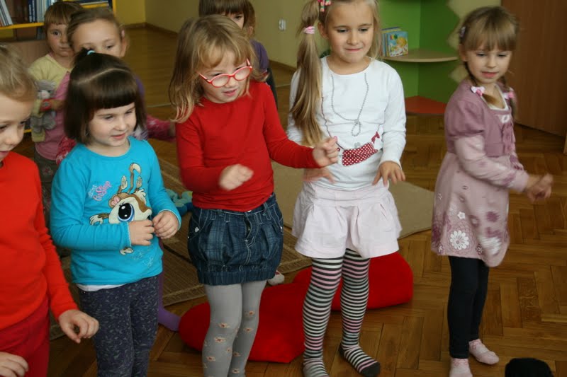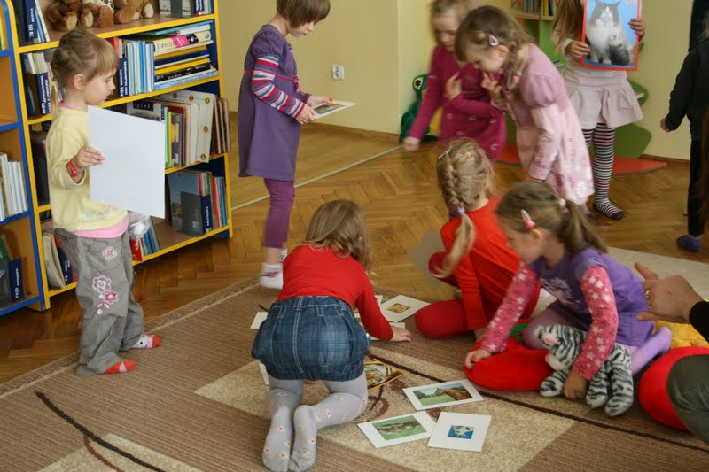 13 listopada odwiedziła nas kolejna grupa przedszkolaków z Przedszkola Integracyjnego nr 27. Tym razem tematem spotkania byli czworonożni przyjaciele człowieka - pies i kot. Po raz kolejny okazało się, że dzieci najbardziej lubią zabawy ruchowe. Nie znaczy to wcale, że radości nie sprawia im również zabawa wymagająca myślenia, np. ułożenie puzzli, przyporządkowanie zwierząt przedstawionych na obrazkach do odpowiedniej zwierzęcej rodziny. Takie zadania to dla nich pestka.