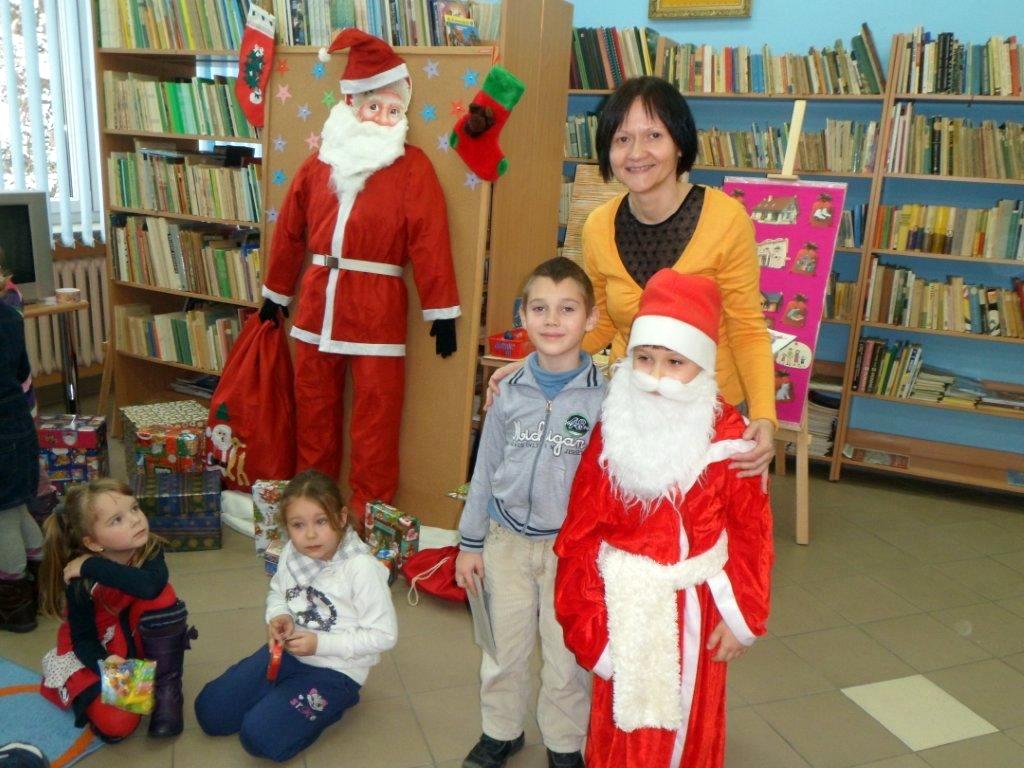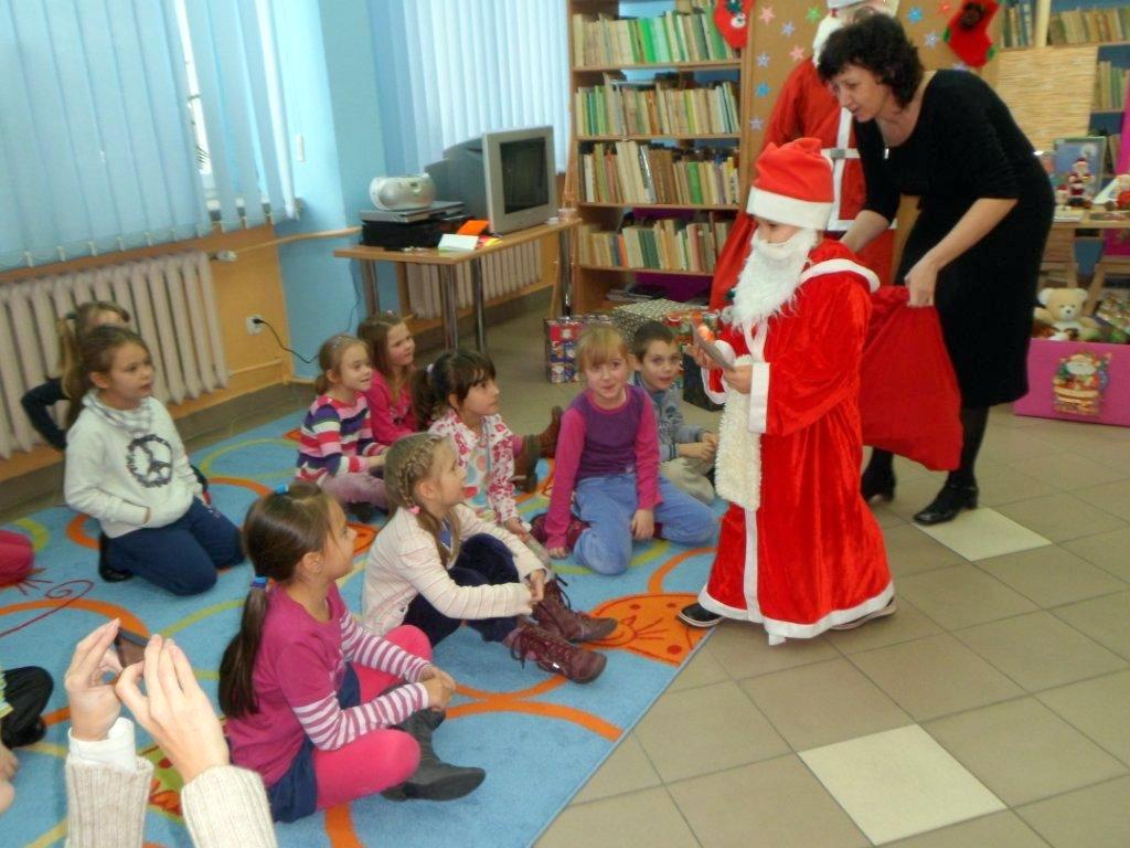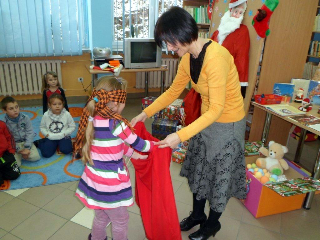 Zbliża się 6 grudnia, więc wszystkie dzieci czekają już na prezenty od Mikołaja. Bibliotekę odwiedził on nieco wcześniej - już 4 grudnia. Pierwszą grupą, z którą chciał się spotkać była klasa 0a ze SP 33. Jednak zanim pan z siwą brodą pojawił się wśród dzieci, musiały one wykonać kilka zadań. Najpierw wysłuchały bajki o Wojtusiu, który nie chciał dostać od Mikołaja prezentu. Mikołaj z bajki miał mnóstwo roboty, więc nasi goście musieli mu pomóc w odczytywaniu listów od dzieci i rozniesieniu prezentów do odpowiednich domów. Później odbyły się zawody, w których dzieci musiały jak najszybciej wybrać ze „śniegu” kolorowe kulki. W niektórych kulkach dzieci znalazły cukierki, więc uczyły się, że dawanie daje radość tak samo jak i otrzymywanie prezentów - musiały podzielić się słodyczami z tymi zawodnikami, którzy nie wylosowali cukierków. Następnie dzieci musiały z zawiązanymi oczami odgadnąć, jakie prezenty miał w worku Mikołaj. Najwięcej śmiechu było przy ostatniej konkurencji: wyścigach w mikołajowych workach. Chociaż krępowały one ruchy, to i tak wszyscy chcieli w nich się ścigać. Po tej pełnej emocji zabawie nadeszła wreszcie chwila, gdy do dzieci przyszedł Mikołaj z workiem pełnym prezentów. W rolę Mikołaja wcielił się chłopiec, który zwyciężył w jednej z rozegranych wcześniej konkurencji. Nasz mały Mikołaj rozdał wszystkim podarki, po czym wszystkie dzieci zrobiły z nim sobie pamiątkową fotografię.