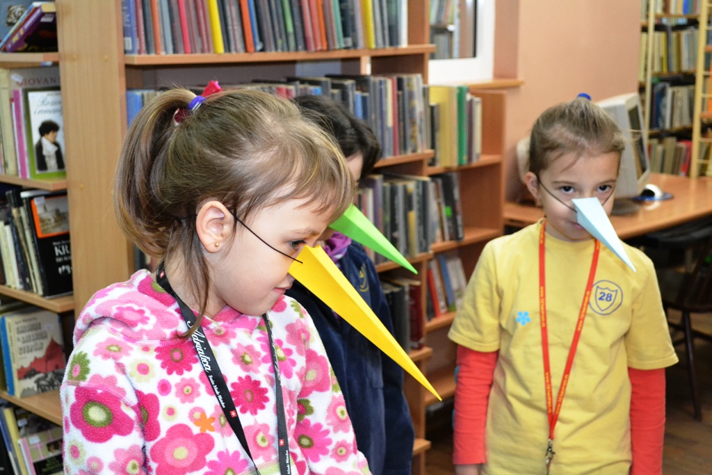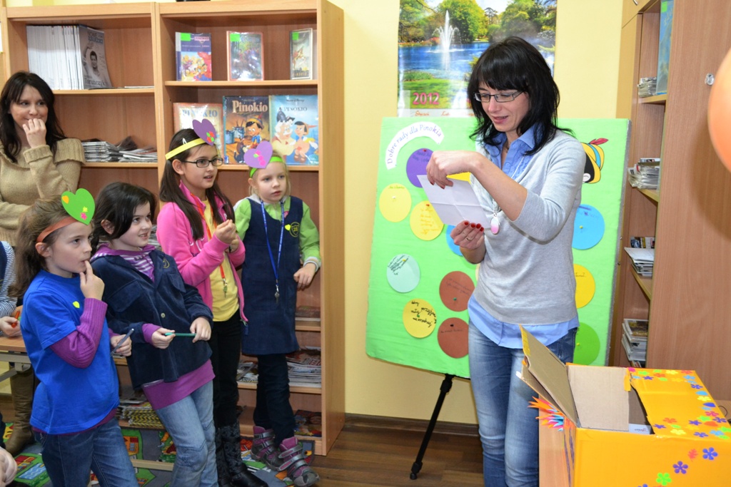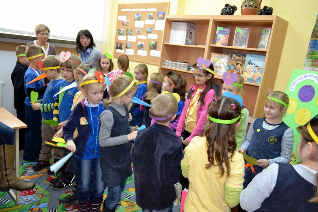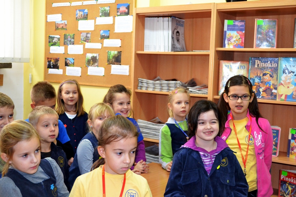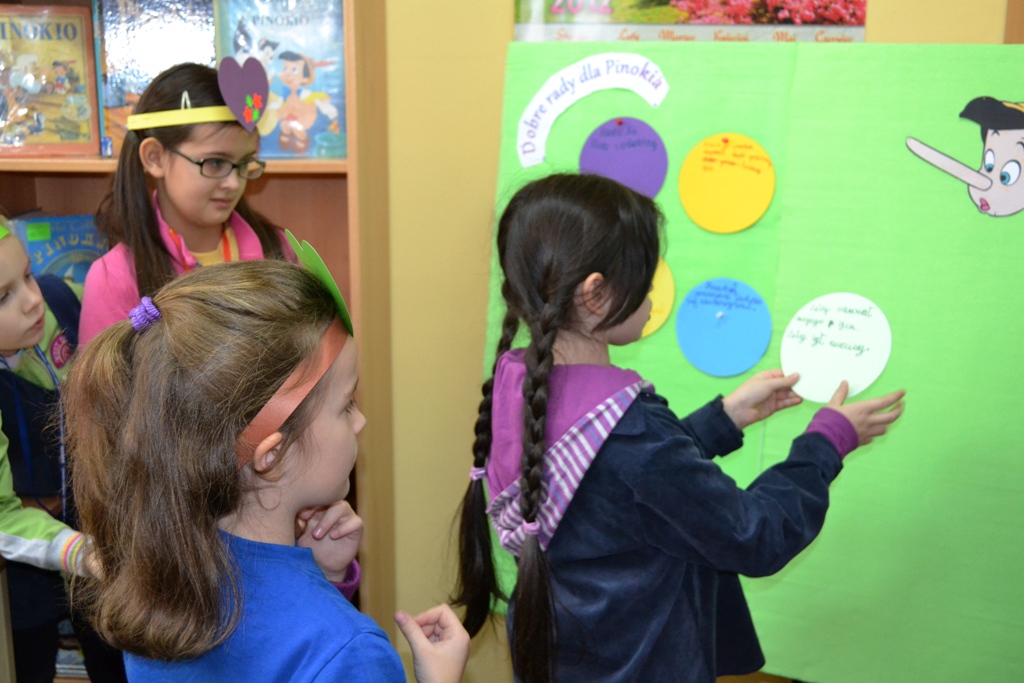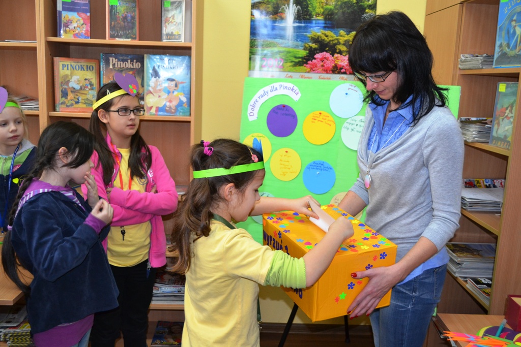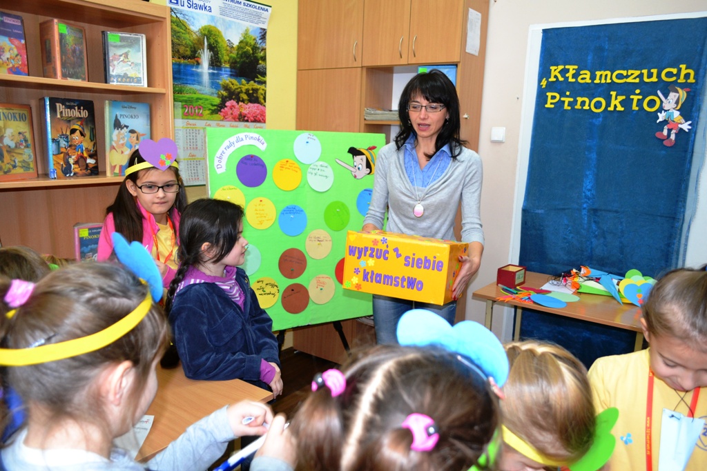 5 grudnia klasa II a SP 28 uczestniczyła w imprezie czytelniczej poświęconej najsłynniejszemu literackiemu kłamczuchowi - Pinokio. Spotkanie przygotowano z okazji przypadającej w tym roku 130 rocznicy urodzin autora książki o drewnianym pajacu - C. Collodiego. Podzieleni na grupy uczniowie sprawdzali swoją wiedzę dotyczącą głównego bohatera, losując pytania ukryte w balonach. Zabawa w krzesło kłamstwa i prawdy wyłoniła długonosych kłamczuchów. Dla nich pozostali uczniowie - udekorowani „koronami prawdy” - wymyślali karne zadania, np. śpiewanie piosenki czy gimnastyczne akrobacje. W dalszej części spotkania dzieci formułowały dobre rady dla Pinokia, natomiast kolejne zadanie - polegające na anonimowym przyznaniu się do jakiegoś kłamstwa, dało podstawę do dyskusji o tym, dlaczego ludzie kłamią oraz co by było, gdyby wszyscy zaczęli kłamać. Uczniowie zdecydowanie opowiedzieli się za prawdą, więc na koniec wykonali „Ordery Odmienionego Serca Pinokia”, którymi wzajemnie się obdarowali. Wręczenie drobnych nagród dla poszczególnych grup zakończyło spotkanie.