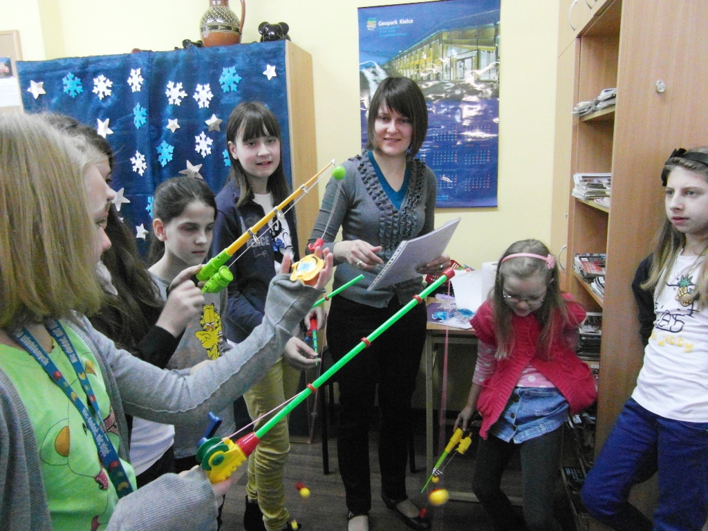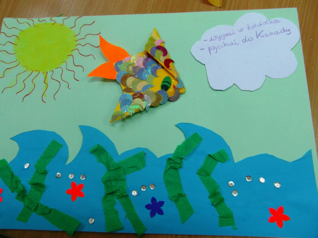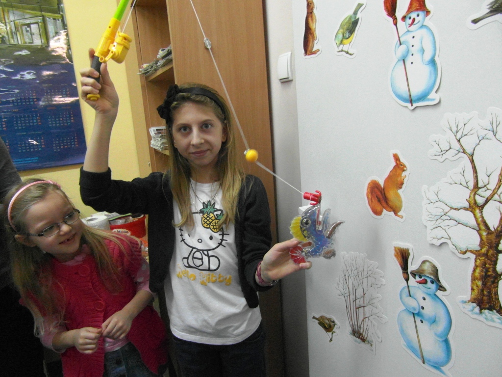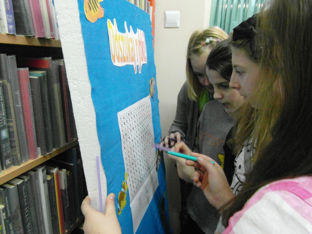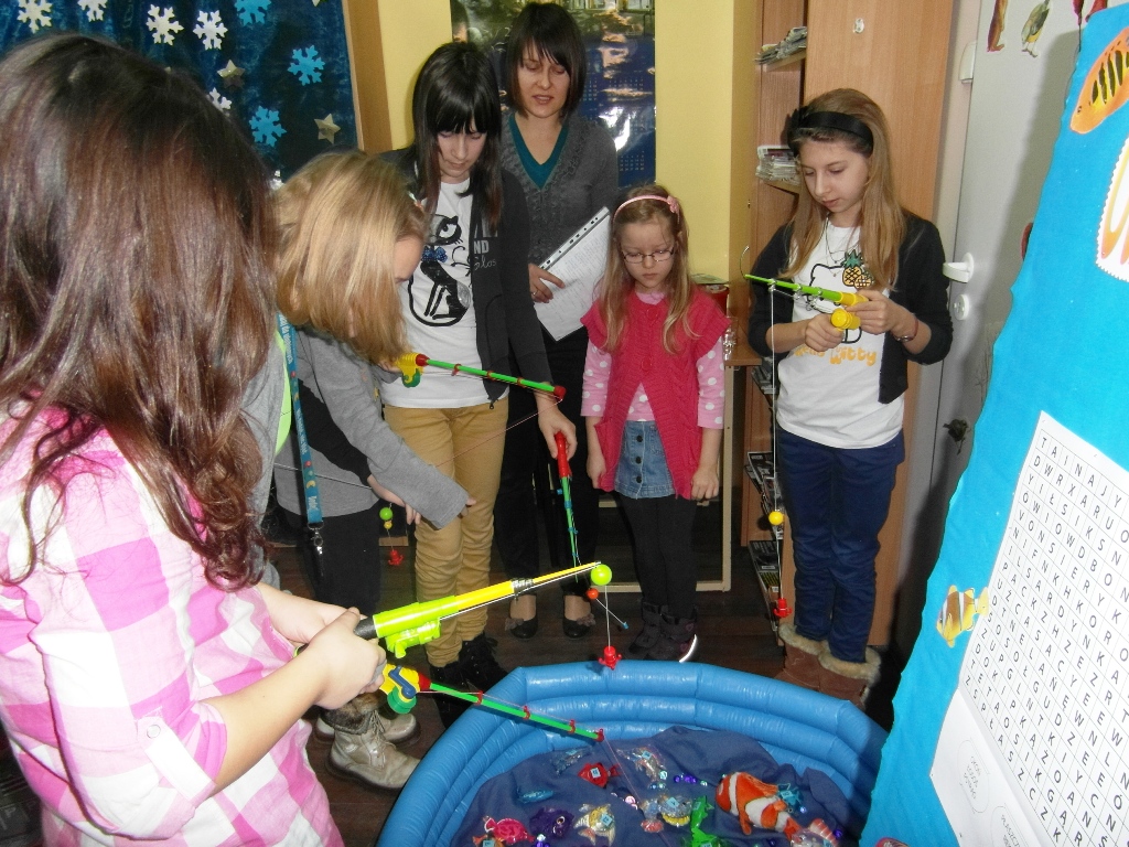 16 stycznia uczestnicy ferii w bibliotece wybrali się w morskie głębiny. Podczas plastycznej części spotkania powstał fantastyczny podwodny świat ze złotą rybką w roli głównej. Potem każdy powierzył jej swoje marzenia, które chciałby, aby się spełniły. Następnie wszyscy wybrali się na połów: wyciągnęli z „wody” kolorowe ryby z pytaniami dotyczącymi różnych bajek. Kolejną konkurencją było przenoszenie rybek za pomocą słomki na spodki, w jak najkrótszym czasie, a na zakończenie spotkania dzieciaki rozwiązywały wykreślanki i rebusy.
