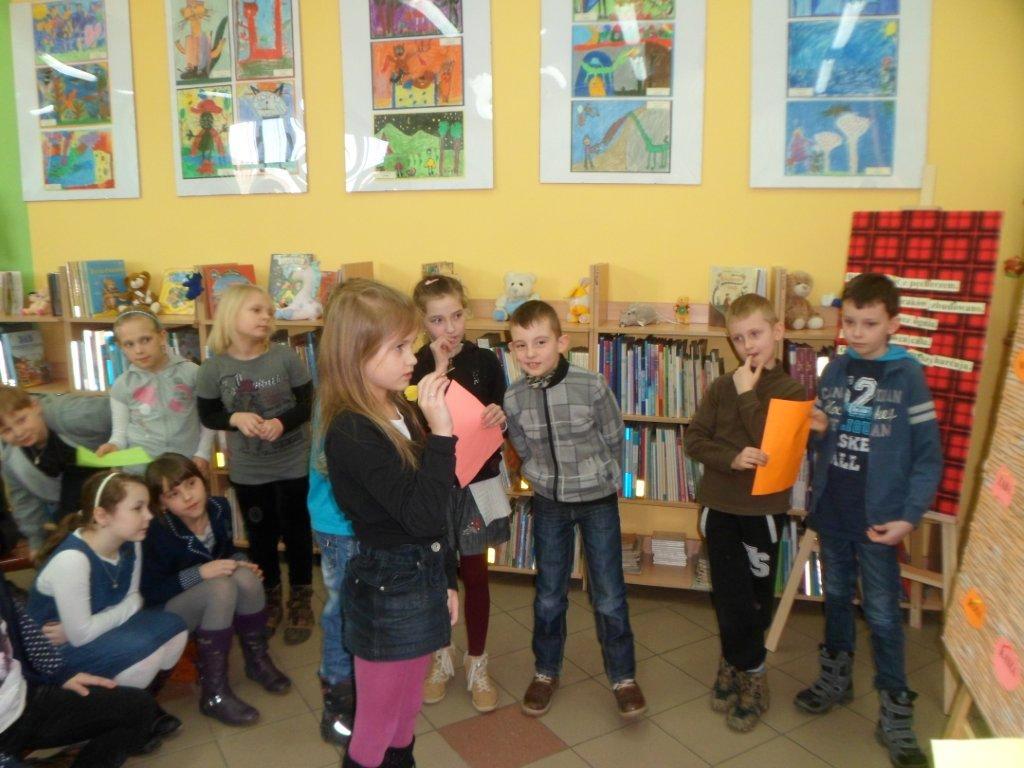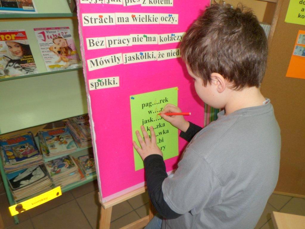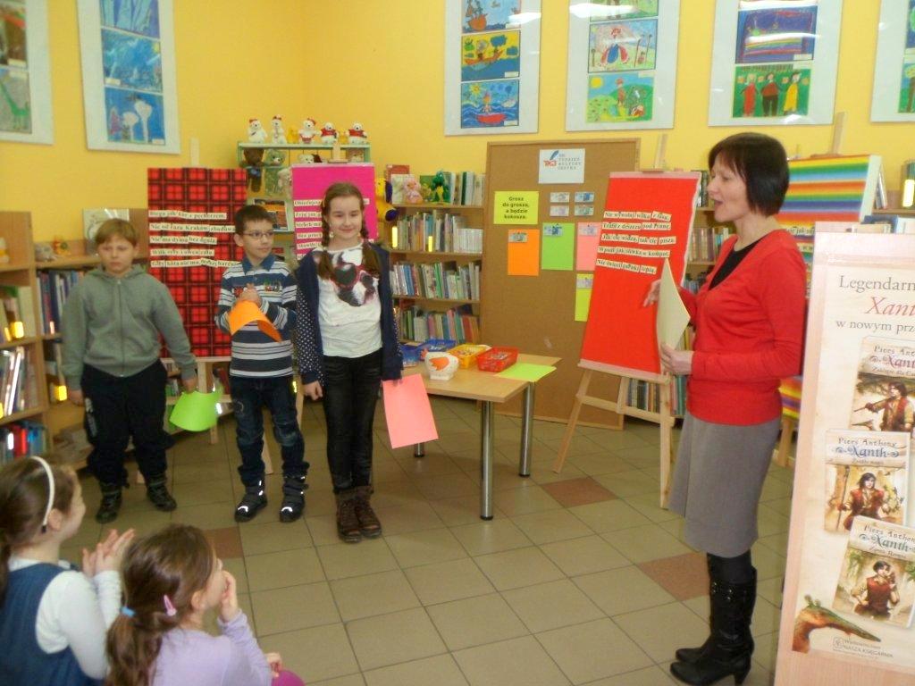 „Grosz do grosza, a będzie kokosza” - głosi przysłowie. Przekonały się o tym dzieci z klasy II d ze Szkoły Podstawowej nr 33, które 5 marca odwiedziły naszą filię z okazji Tygodnia Kultury Języka. Zadaniem uczniów było rozwiązanie mnóstwa zadań sprawdzających znajomość języka polskiego. Dzieci musiały wykazać się znajomością ortografii, znaleźć błędy językowe w zdaniach, dokończyć przysłowia, tworzyć nowe wyrazy oraz łamać sobie języki na zdaniach typu „Ulu, ululaj Eulalię” czy też „Jola lojalna i Jola nielojalna”. Zamiast tradycyjnej punktacji nasi goście otrzymywali fikcyjne banknoty o odpowiednich nominałach. Zwycięska grupa zgromadziła na swoim koncie aż 370 zł. Co prawda nikt nie dostał za te pieniądze kokoszy, ale dzieci otrzymały drobne upominki, których przez całe zajęcia pilnowała biblioteczna kura.