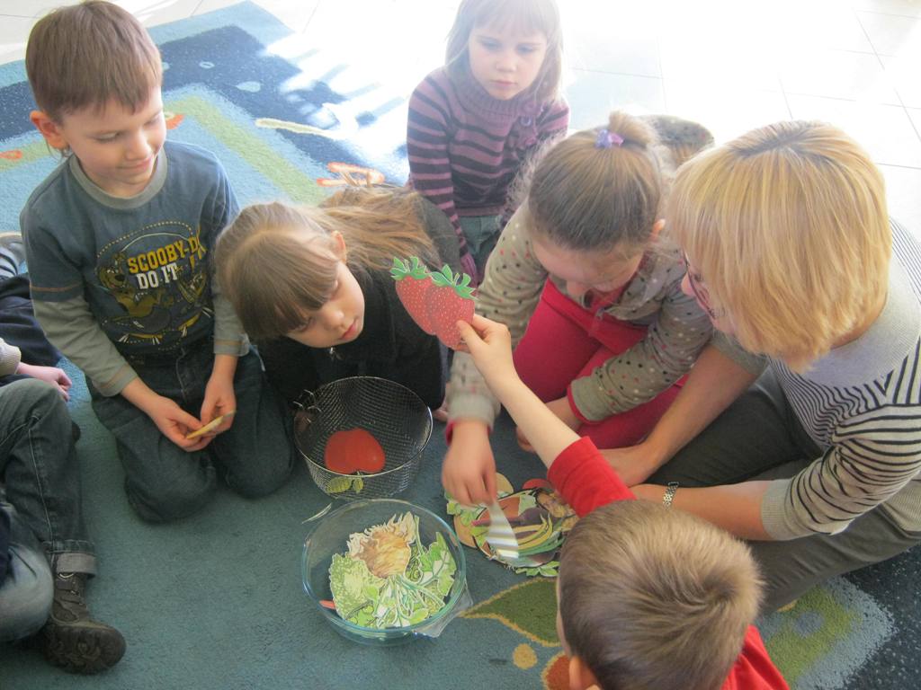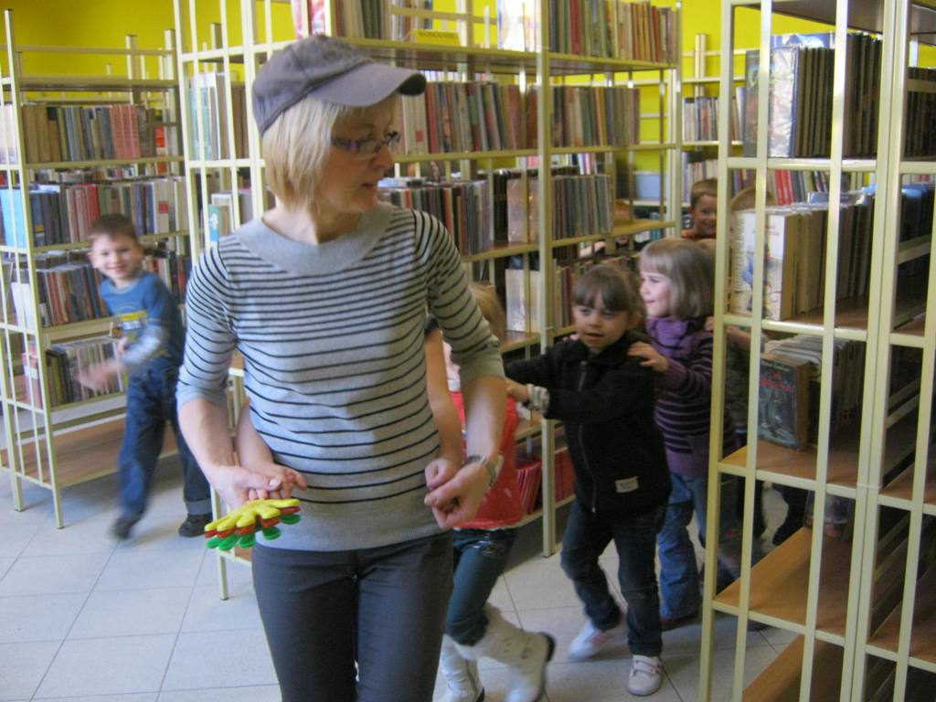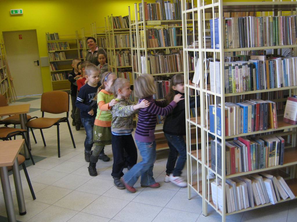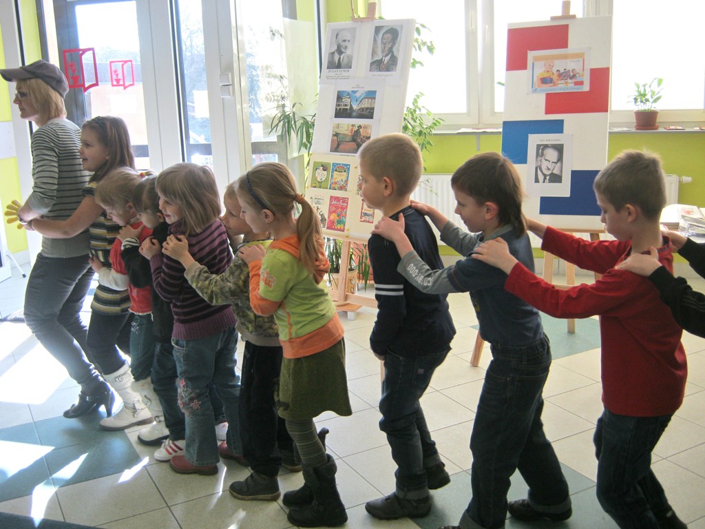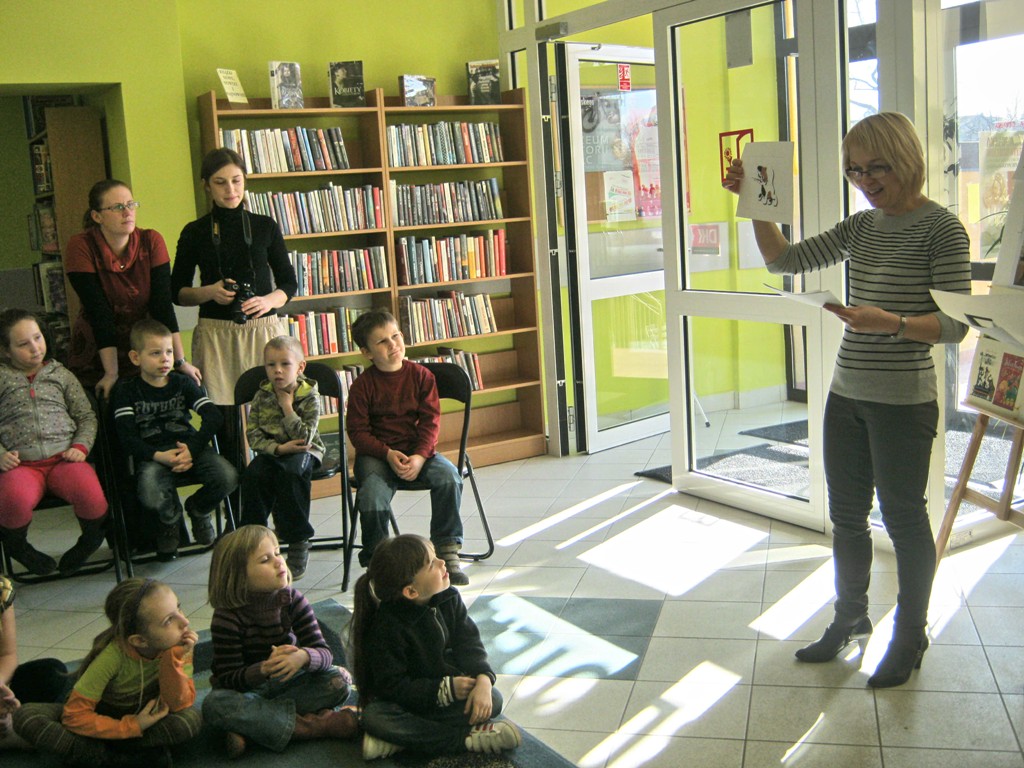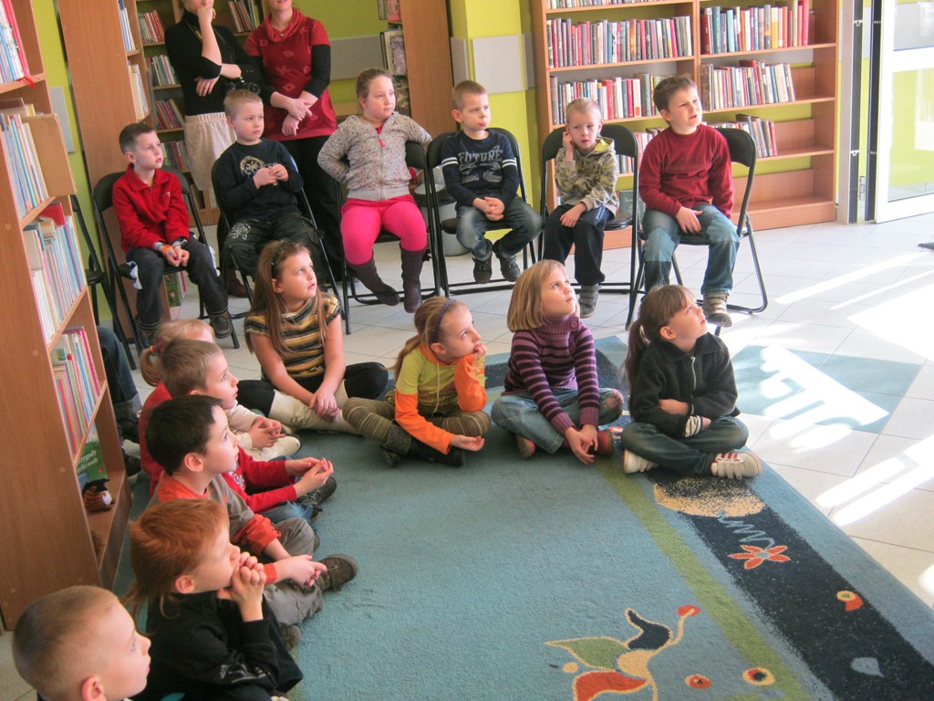 Poezja Juliana Tuwima jest znana i lubiana. Przekonali nas o tym uczniowie kl. „0” Szkoły Podstawowej nr 5, którzy przybyli na spotkanie 6 marca w ramach Tygodnia Kultury Języka. Dzieci bezbłędnie odgadywały tytuły utworów z prezentowanych ilustracji. Po wysłuchaniu wiersza pt. Ptasie plotki przyznały, że plotkowanie nie jest przyjemne ani dla ptaków ani dla ludzi. Następnie po zebraniu rozsypanego abecadła oddały się marzeniom, naśladując beztroskiego Dyzia. Pomagały panu Hilaremu odnaleźć zgubione okulary, a gospodyni oddzielić owoce od warzyw, by mogła ugotować pyszną zupę jarzynową. Z wesołą lokomotywą wyruszyły ze Stacyjkowa w podróż po bibliotece, poznały jej najodleglejsze zakamarki, a swoją ciuchciową jazdę zakończyły na stacji z napisem „Szkoła”.