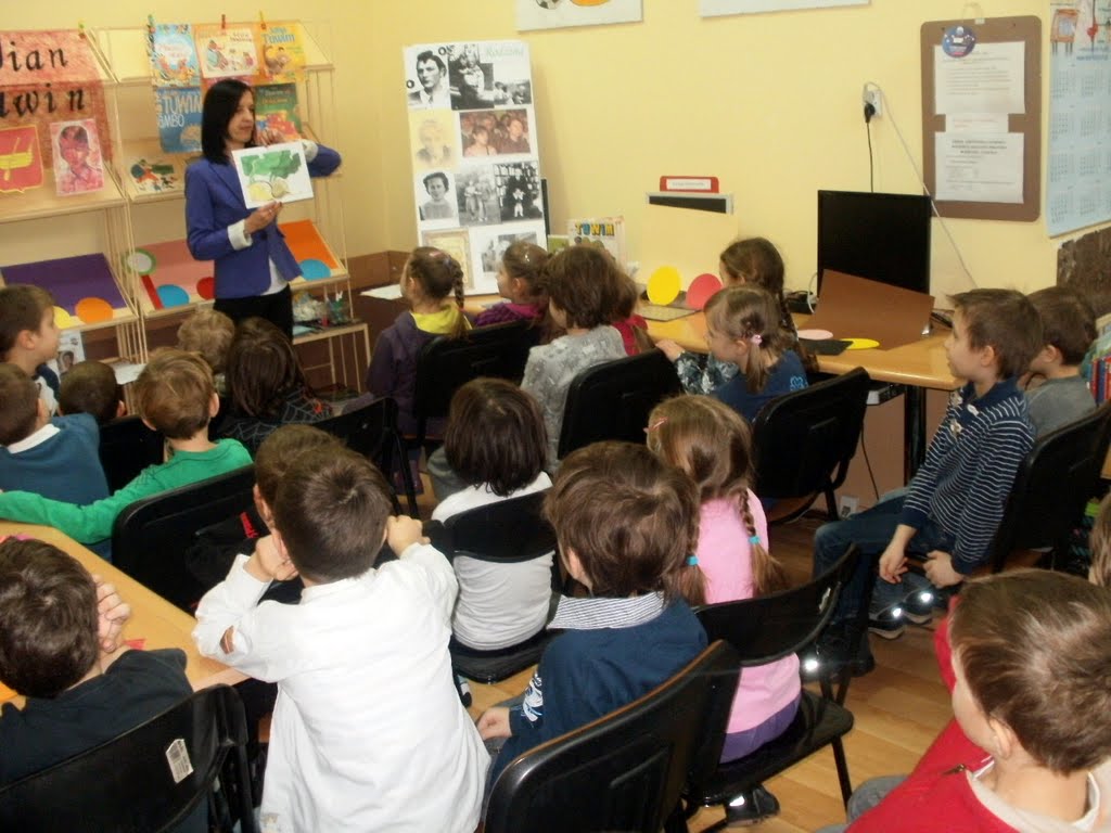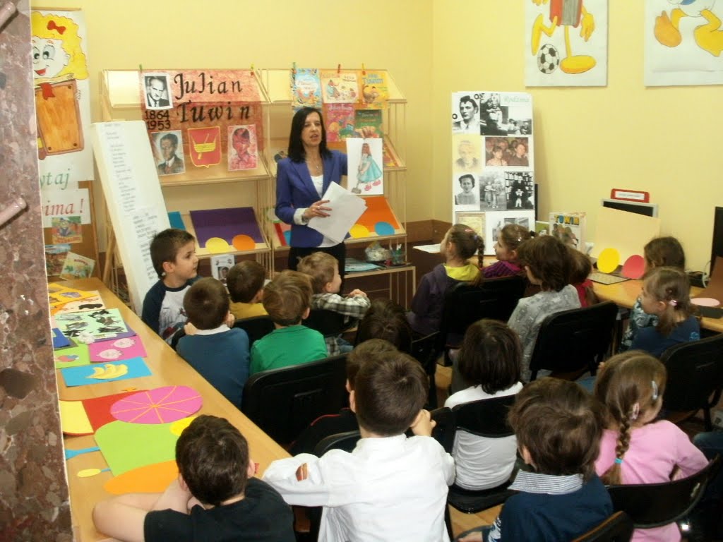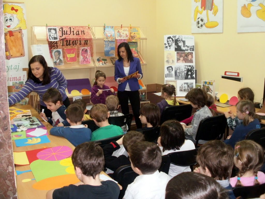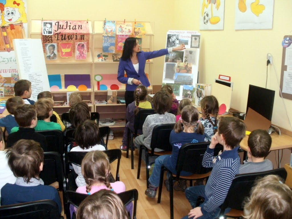 8 Marca odwiedziła nas liczna grupa, bo aż dwie klasy, zerowa i pierwsza, z Prywatnej Szkoły Podstawowej nr 2 w Kielcach. Zamykając tydzień spotkań z Julianem Tuwimem wspominaliśmy jego bogatą twórczość oraz fakty i ciekawostki z jego życia. Nie obyło się bez przedstawienia teatralnego Lokomotywy Juliana Tuwima recytowanej przez Piotra Fronczewskiego. Na koniec zabawy mali „aktorzy” otrzymali gromkie brawa za profesjonalny występ. Korzystając z okazji, w dniu dzisiejszego święta, małym „kobietkom” i paniom wychowawczyniom złożyliśmy życzenia, przypominając dzieciakom o ich mamach i babciach.