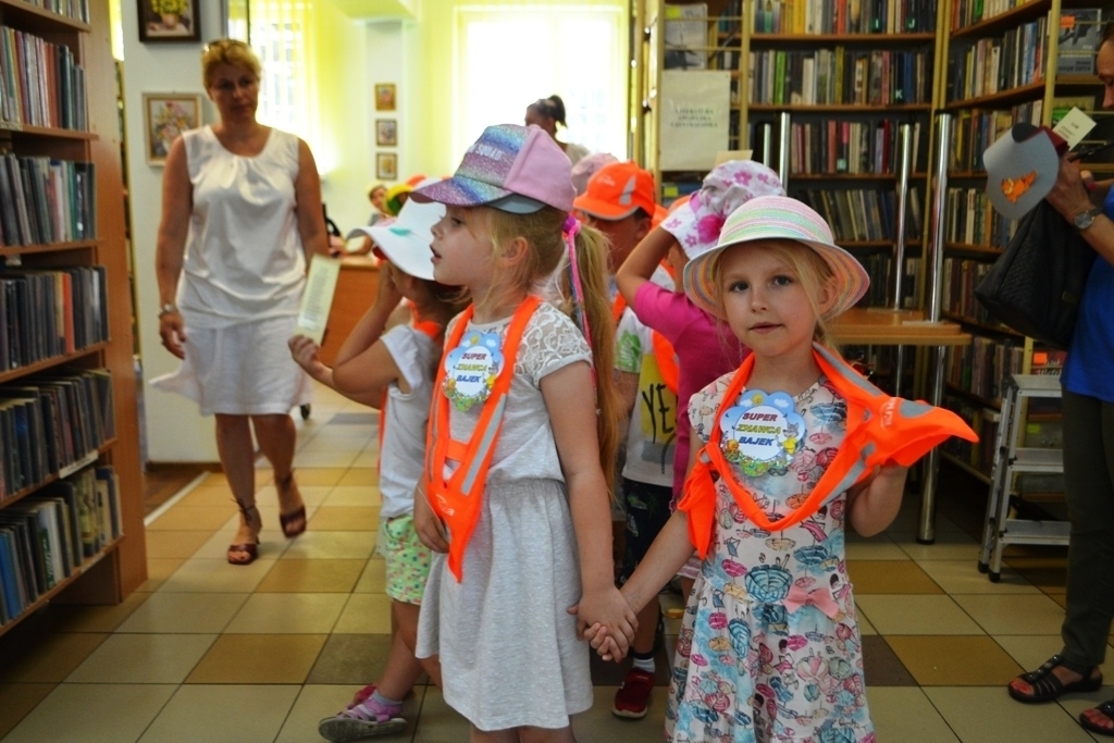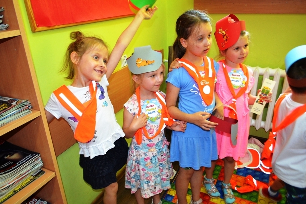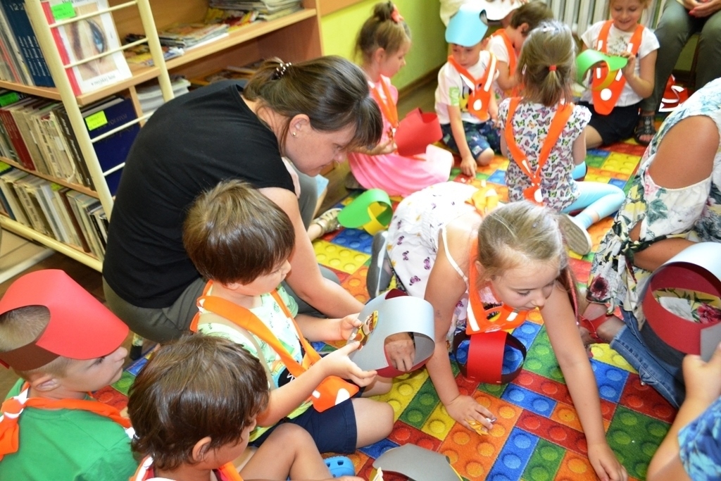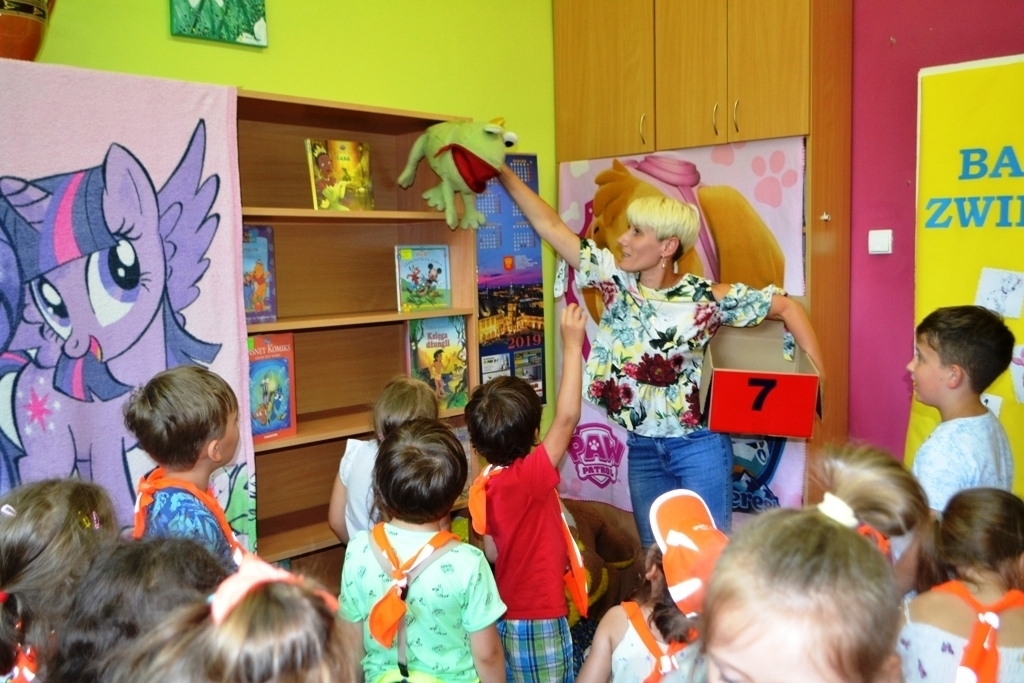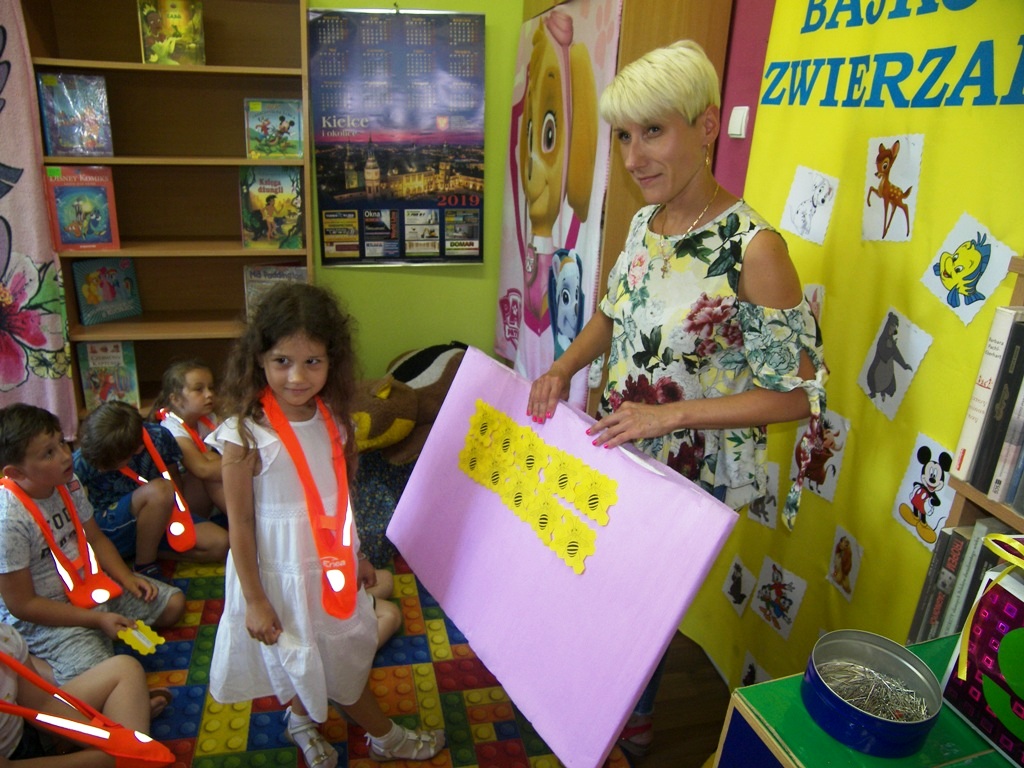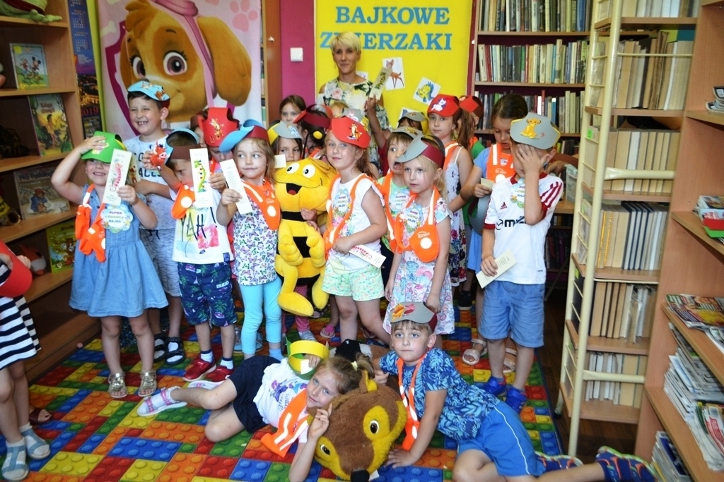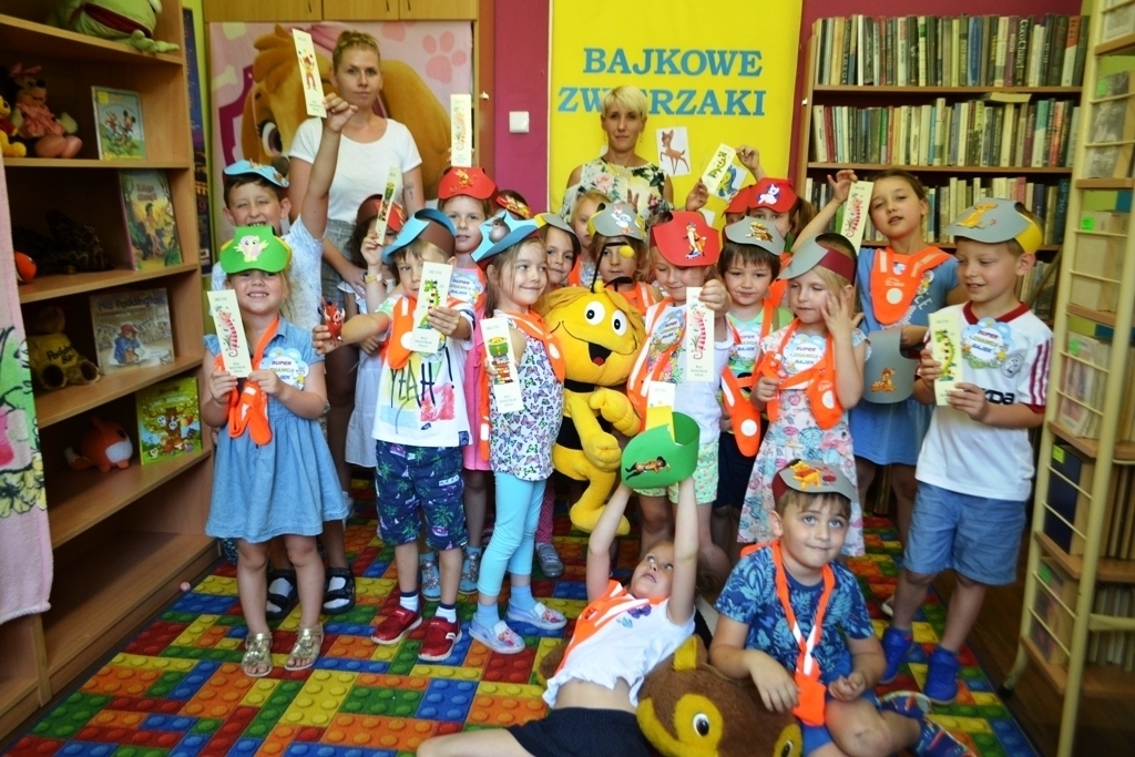 25.06.2019 r. naszą bibliotekę odwiedziła grupa dzieci z przedszkola „Corradini”. Tematem przewodnim zajęć były bajkowe zwierzęta. Na początku spotkania nasi goście musieli zdobyć „zagadkowy plaster miodu” z ula pszczółki Mai. Druga zabawa była ściśle związana z książką. Dzieci losując numerki musiały odnaleźć pudełko, w którym ukryty był odpowiedni zwierzęcy bohater. Kolejne zadanie polegało na dopasowaniu przyjaciół do głównej postaci z bajki. Dużo śmiechu wzbudziło karmienie wiewiórki kolorowymi orzechami. Przedszkolaki ozdabiały także papierowe czapeczki bajkowym zwierzęcym motywem. Na zakończenie spotkania każdy uczestnik otrzymał Order Znawcy Bajek oraz zakładkę.