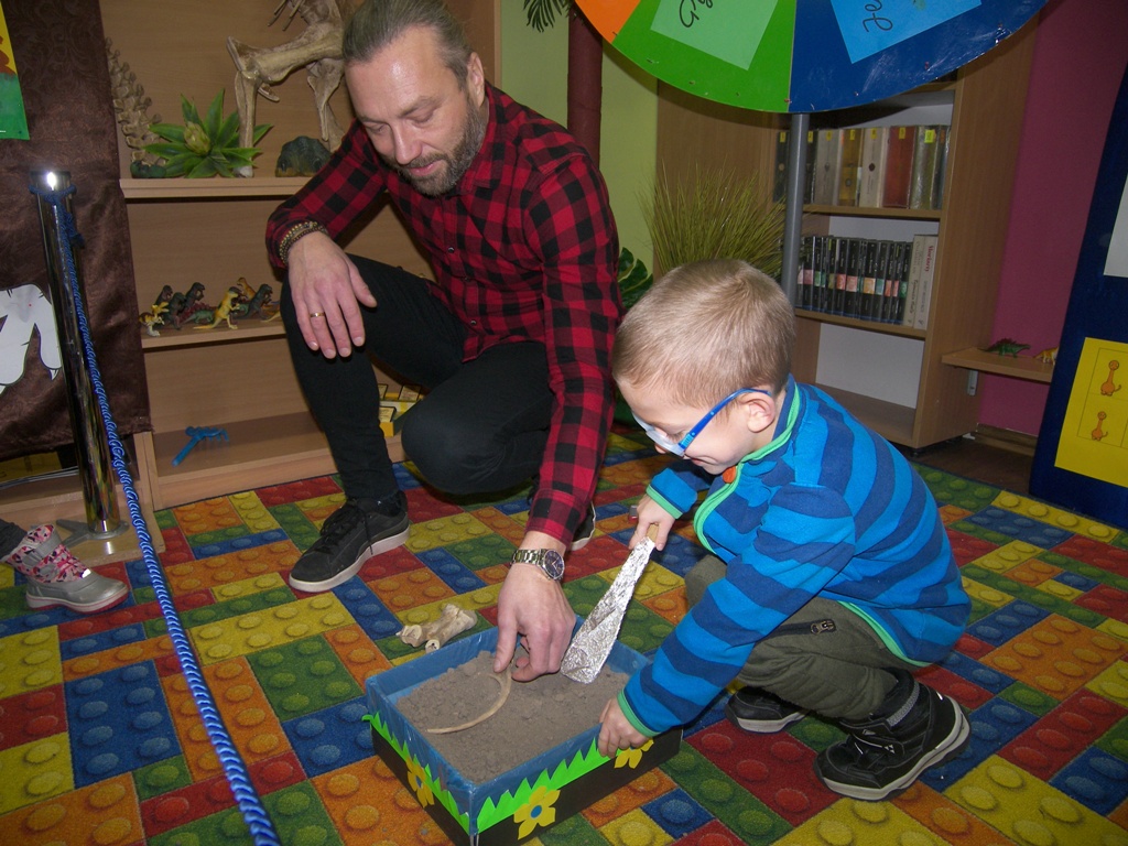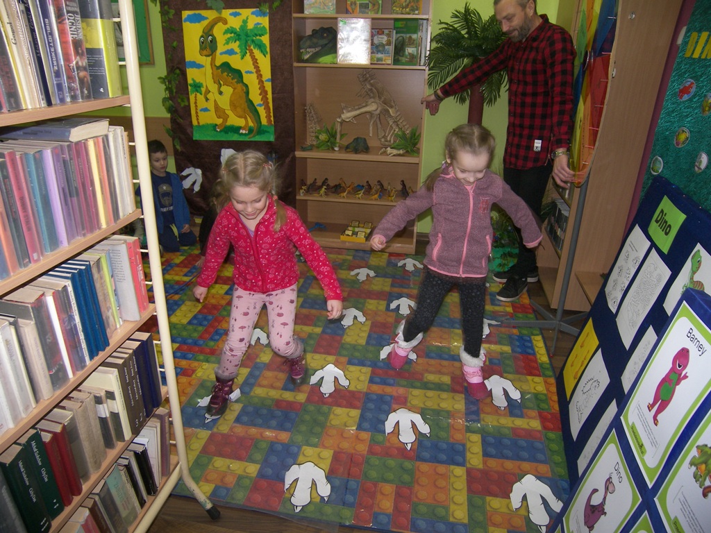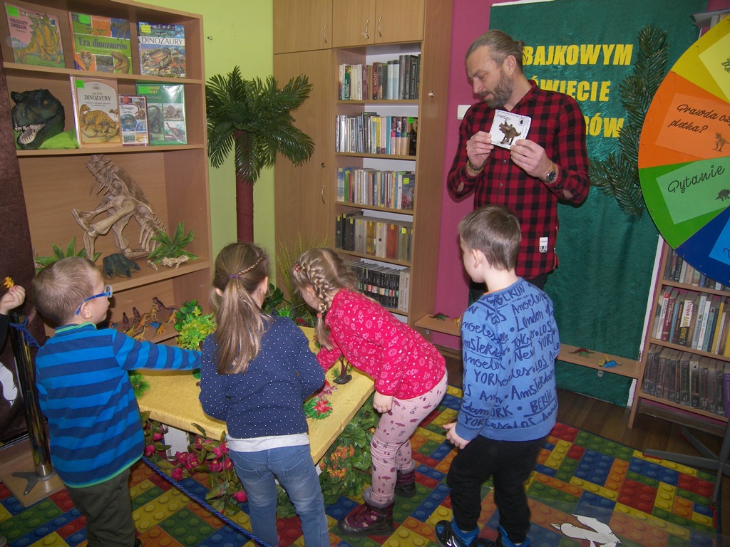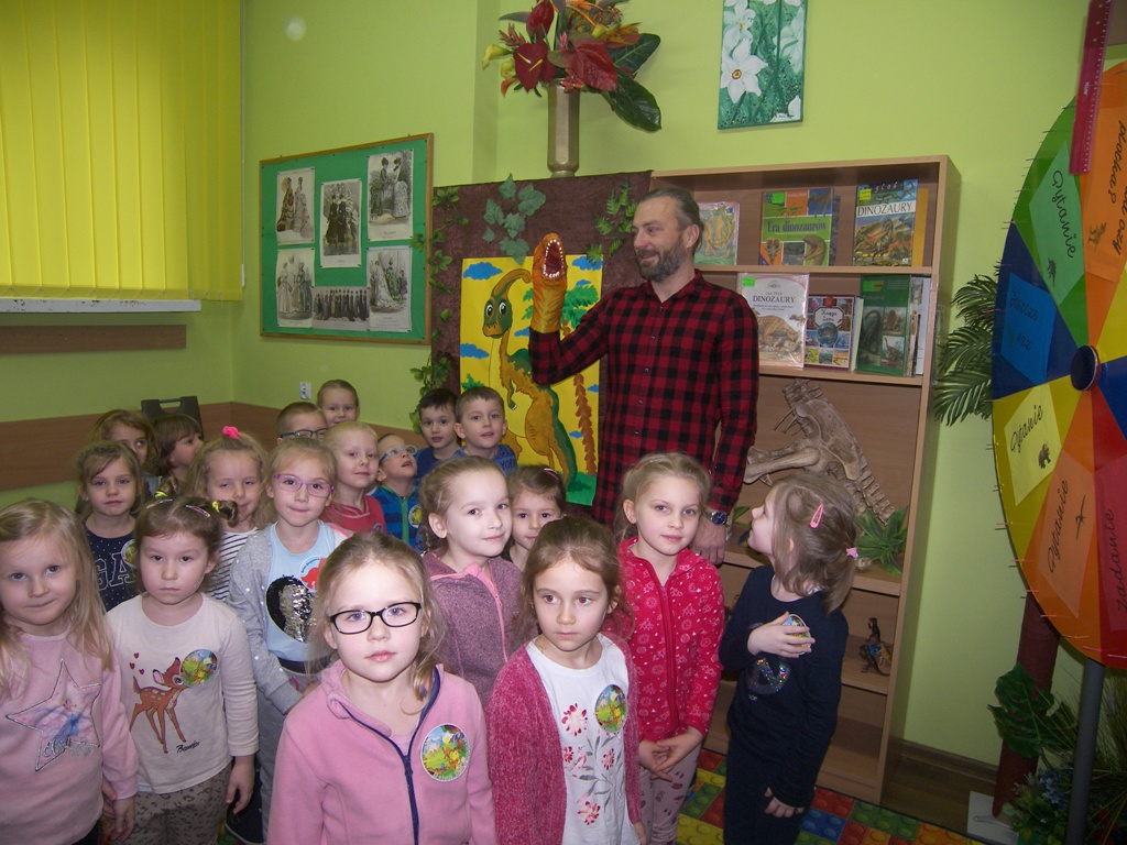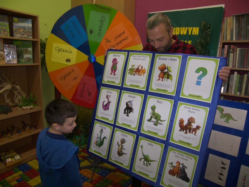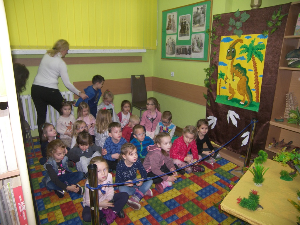 Pradawne stwory opanowały Filię 12 we wtorkowy poranek podczas odwiedzin grupy 6 latków z PS 24. Dzieci miały okazję bliżej przyjrzeć się dinozaurom, nie tylko bajkowym, ale także tym z archeologicznych wykopalisk. Zabawie towarzyszyło spojrzenie groźnego tyranozaura oraz jego szkielet. Przedszkolaki ułożyły prehistoryczną makietę, a potem przystąpiły do gry w koło fortuny. Tym sposobem losowały pytania i zadania, na które musiały odpowiedzieć lub je wykonać, oczywiście wszystkie związane były z dawnymi mieszkańcami Ziemi. Dzieci wykazały się ogromną wiedzą i znajomością bajek, za co zostały udekorowane medalem „Znawcy Dinozaurów”.