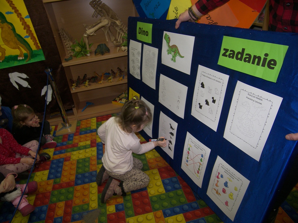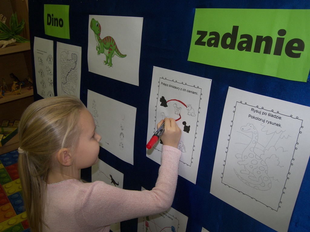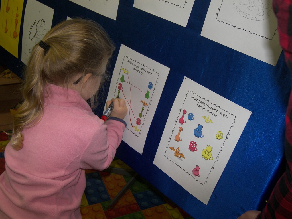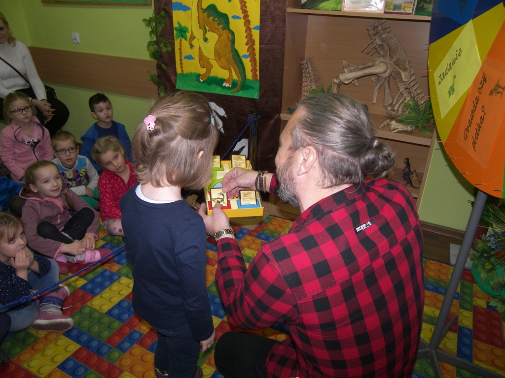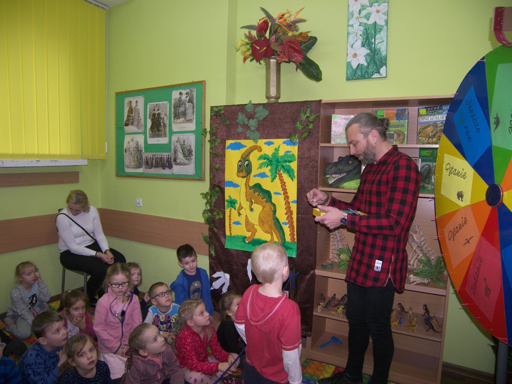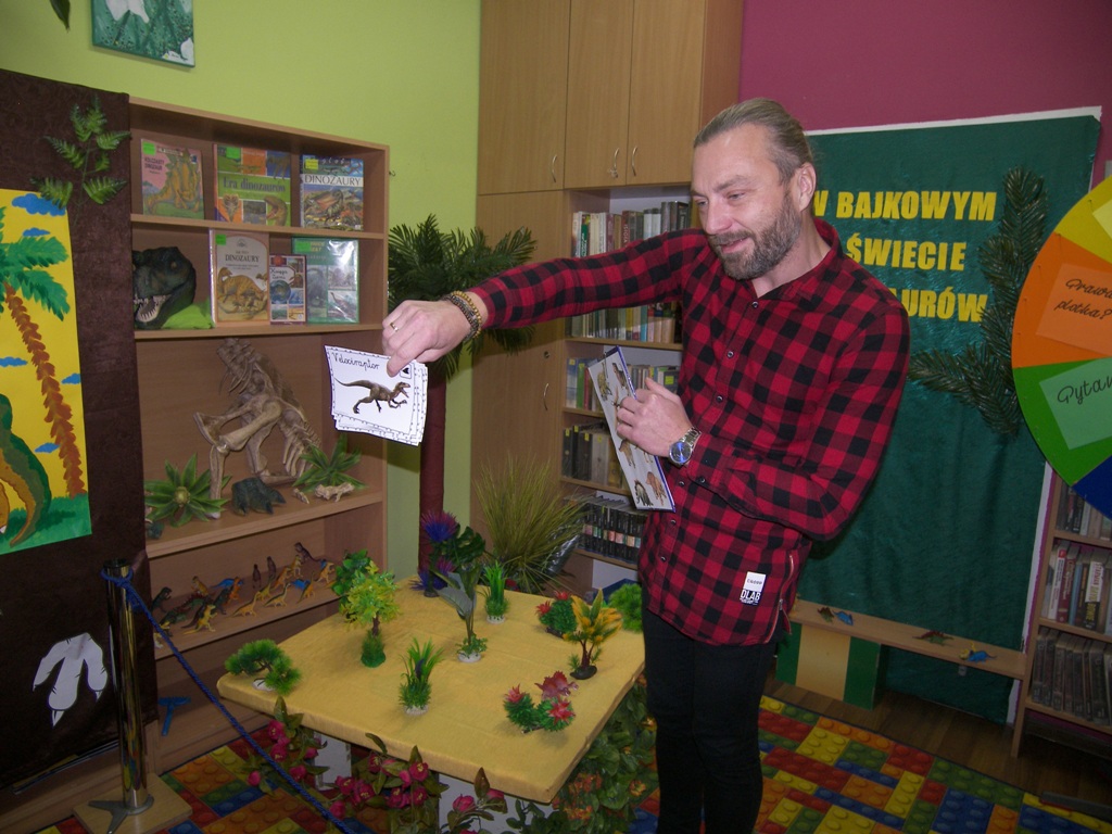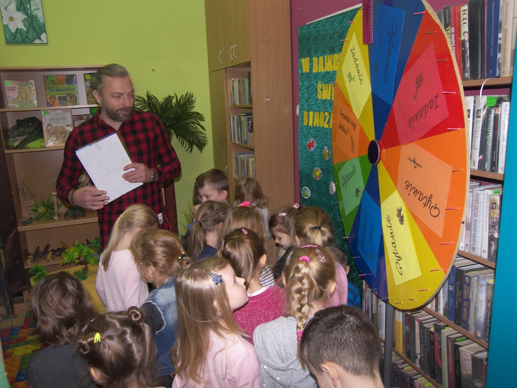 Pradawne stwory opanowały Filię 12 we wtorkowy poranek podczas odwiedzin grupy 6 latków z PS 24. Dzieci miały okazję bliżej przyjrzeć się dinozaurom, nie tylko bajkowym, ale także tym z archeologicznych wykopalisk. Zabawie towarzyszyło spojrzenie groźnego tyranozaura oraz jego szkielet. Przedszkolaki ułożyły prehistoryczną makietę, a potem przystąpiły do gry w koło fortuny. Tym sposobem losowały pytania i zadania, na które musiały odpowiedzieć lub je wykonać, oczywiście wszystkie związane były z dawnymi mieszkańcami Ziemi. Dzieci wykazały się ogromną wiedzą i znajomością bajek, za co zostały udekorowane medalem „Znawcy Dinozaurów”.