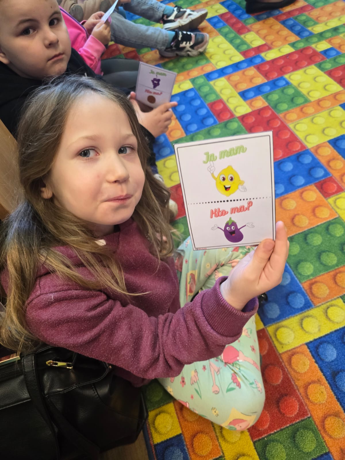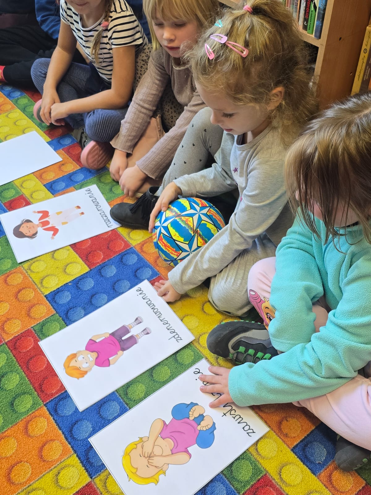 Przedszkolaki wcieliły się w rolę osoby, która np. była smutna. Miały za zadanie dokończyć zdanie "Kiedy mój przyjaciel jest ... to... mając przed sobą jedną z ilustracji przedstawiającą daną emocję np. smutek, wściekłość, radość, duma, strach... Kiedy mój przyjaciel jest smutny to ja staram się go pocieszyć. Kiedy jest wściekły to ja staram się go uspokoić. Kiedy jest radosny to ja cieszę się razem z nim itp. Na podstawie książki "Za dużo marchewek" K. Hudson maluchy zrozumiały jak siła przyjaźni pomaga przetrwać trudne chwile w życiu. Nawet gdy po drodze spotykają nas niekoniecznie miłe niespodzianki. I że przyjaźń i dzielenie się z innymi są ważniejsze niż posiadanie. Dużo radości przyniosła zabawa w kolorowe domino, a zagadki wyjątkowo zawiłe i skomplikowane nie stanowiły problemu dla dzieci.