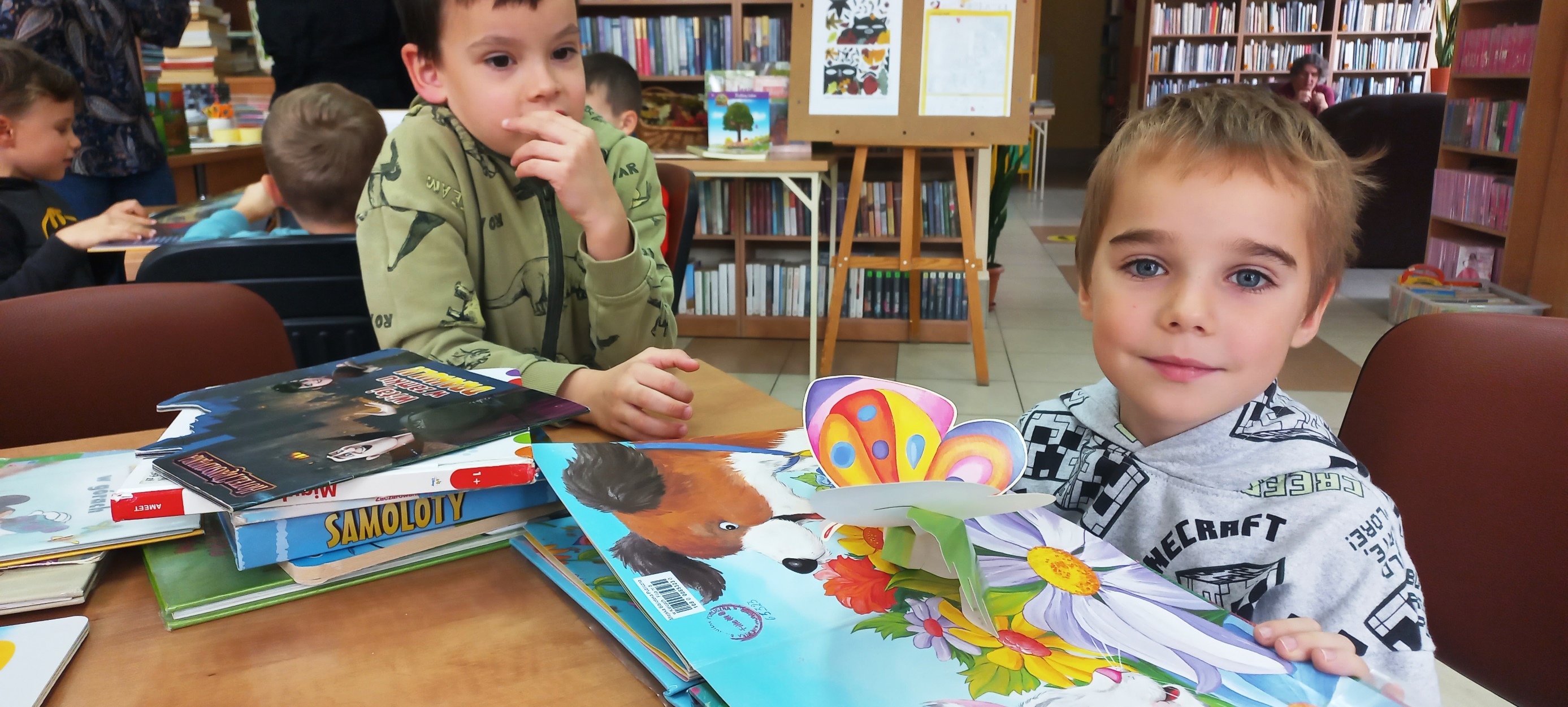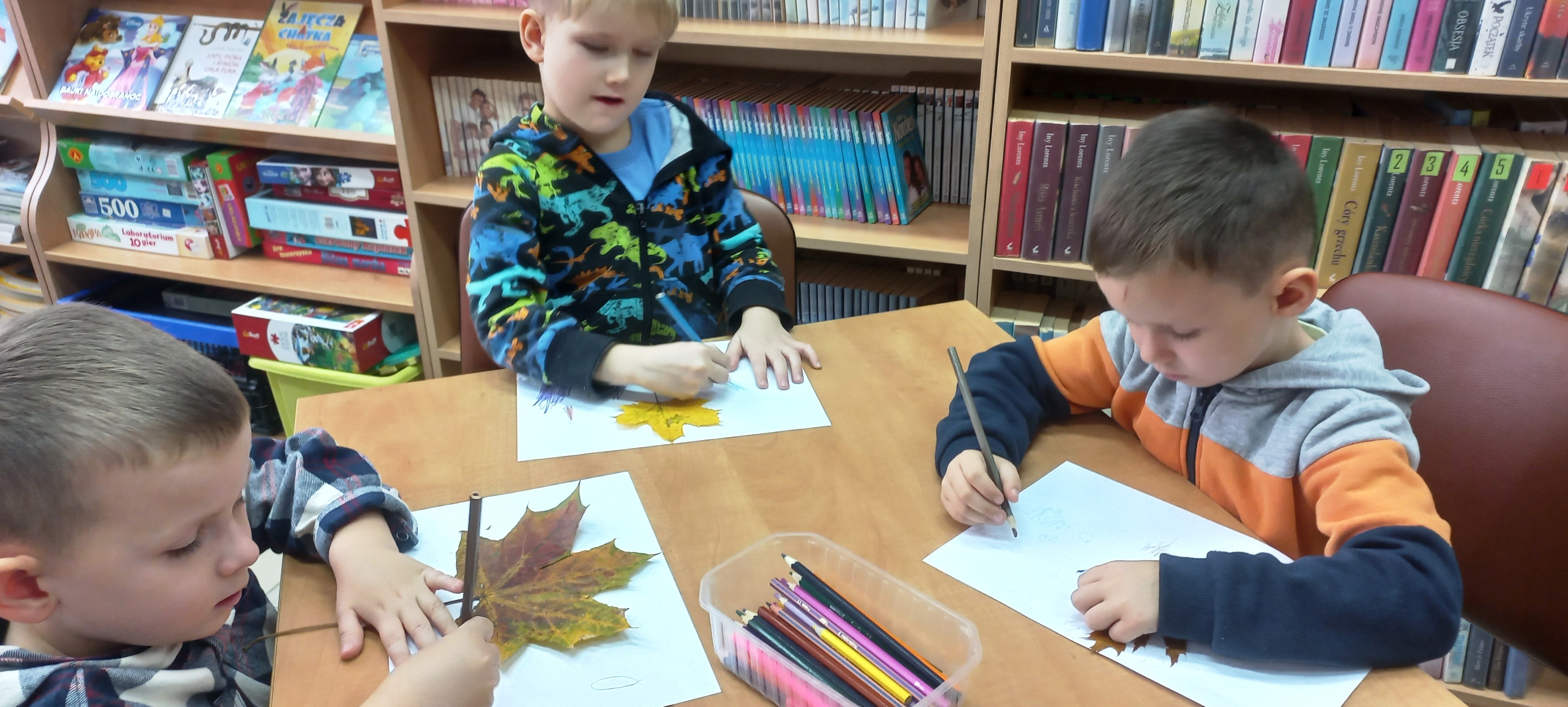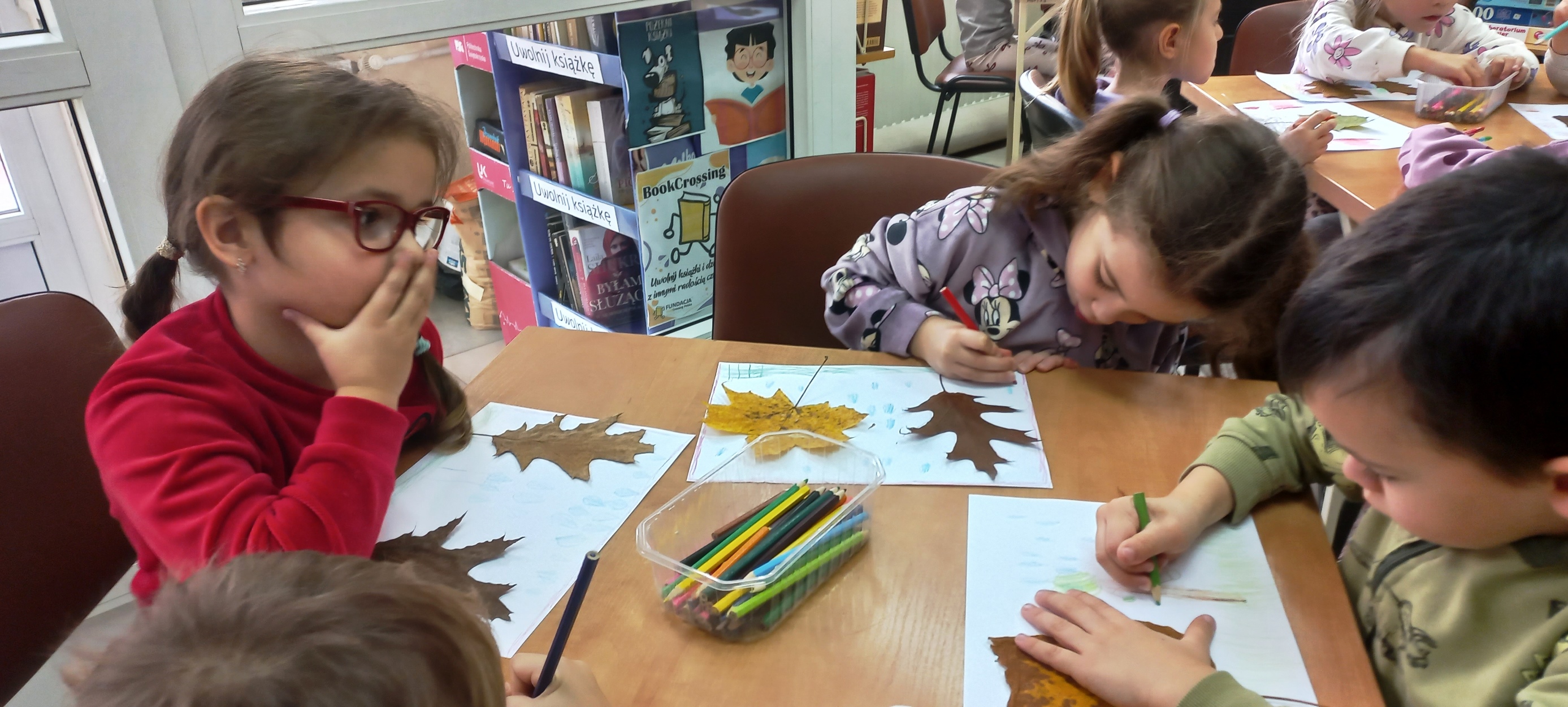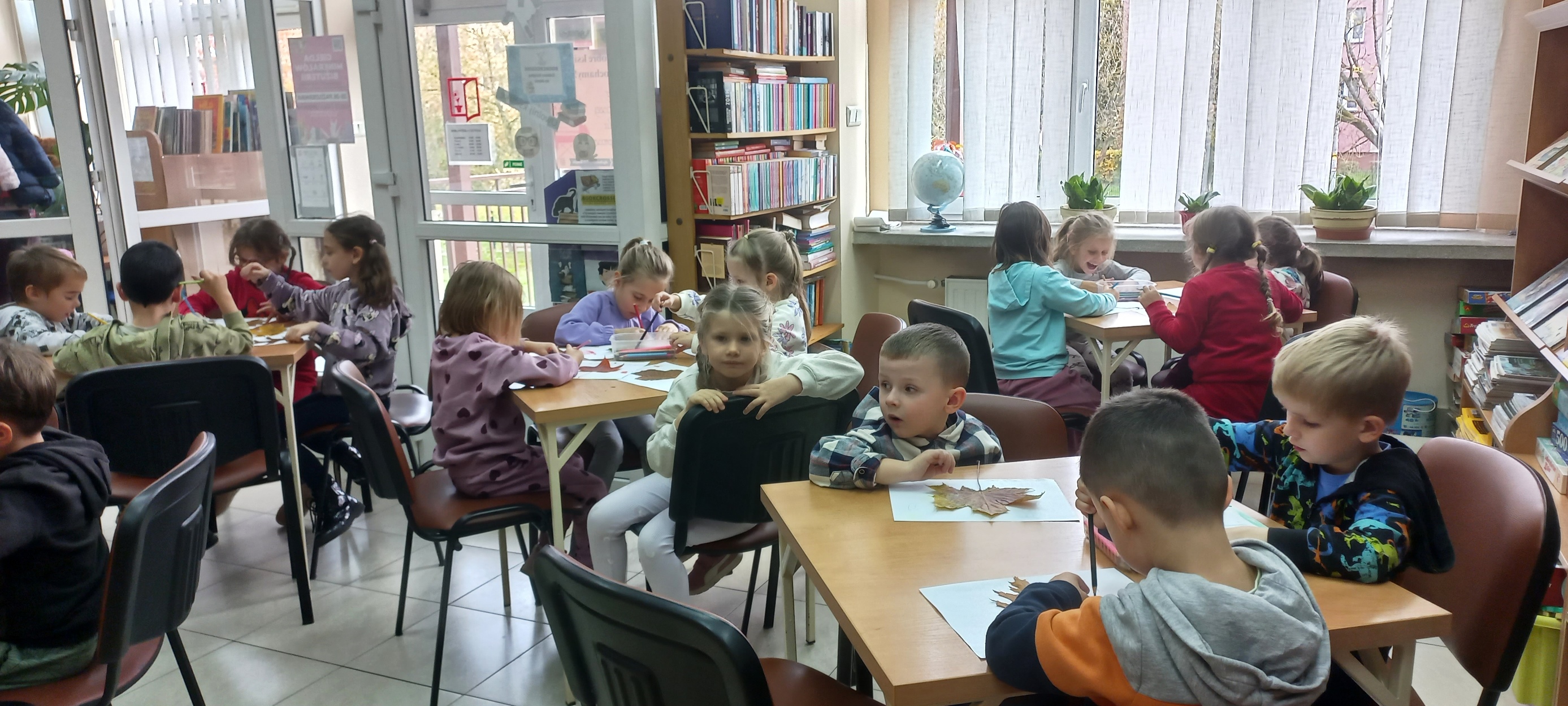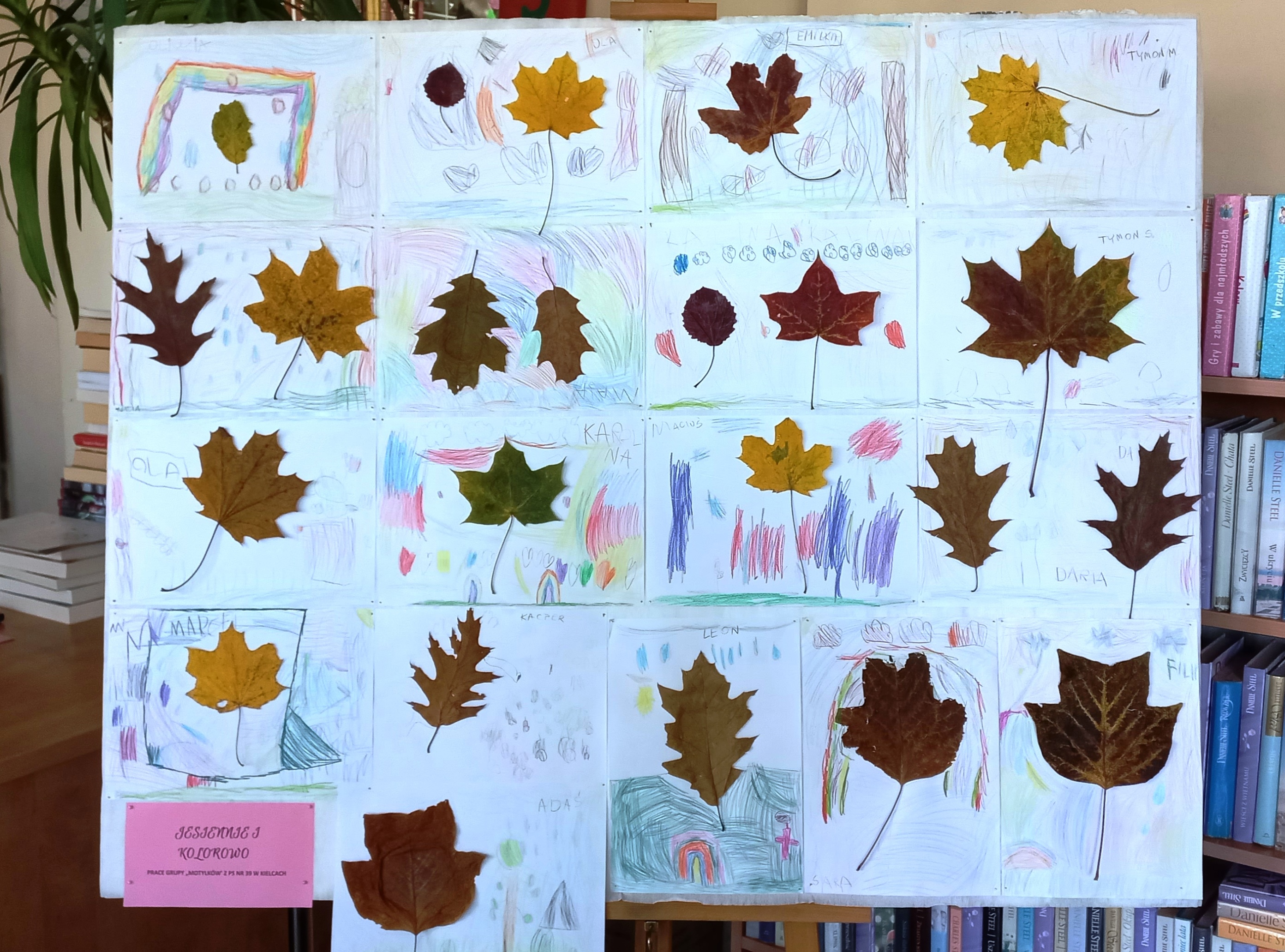 …odbyły się zajęcia z „Motylkami” z PS nr 39 w Kielcach. Dzięki opowiadaniu M. Strzałkowskiej pt. „Stworek Kolorek i antocyjany” poznaliśmy substancje odpowiedzialne za zmiany koloru liści w ciągu roku. Dowiedzieliśmy się, dlaczego drzewa te liście gubią jesienią. Dużo zabawy przyniosło poszukiwanie takich samych elementów na obrazkach (zwykle szukamy różnic). Wreszcie każdy przedszkolak wybierał jeden jesienny liść, przymocowywał na kartce i ozdabiał jesienną „historią”- powstały niepowtarzalne, piękne prace. Spotkanie tradycyjnie zakończyło oglądanie książek i nasze zaproszenie do odwiedzania biblioteki.