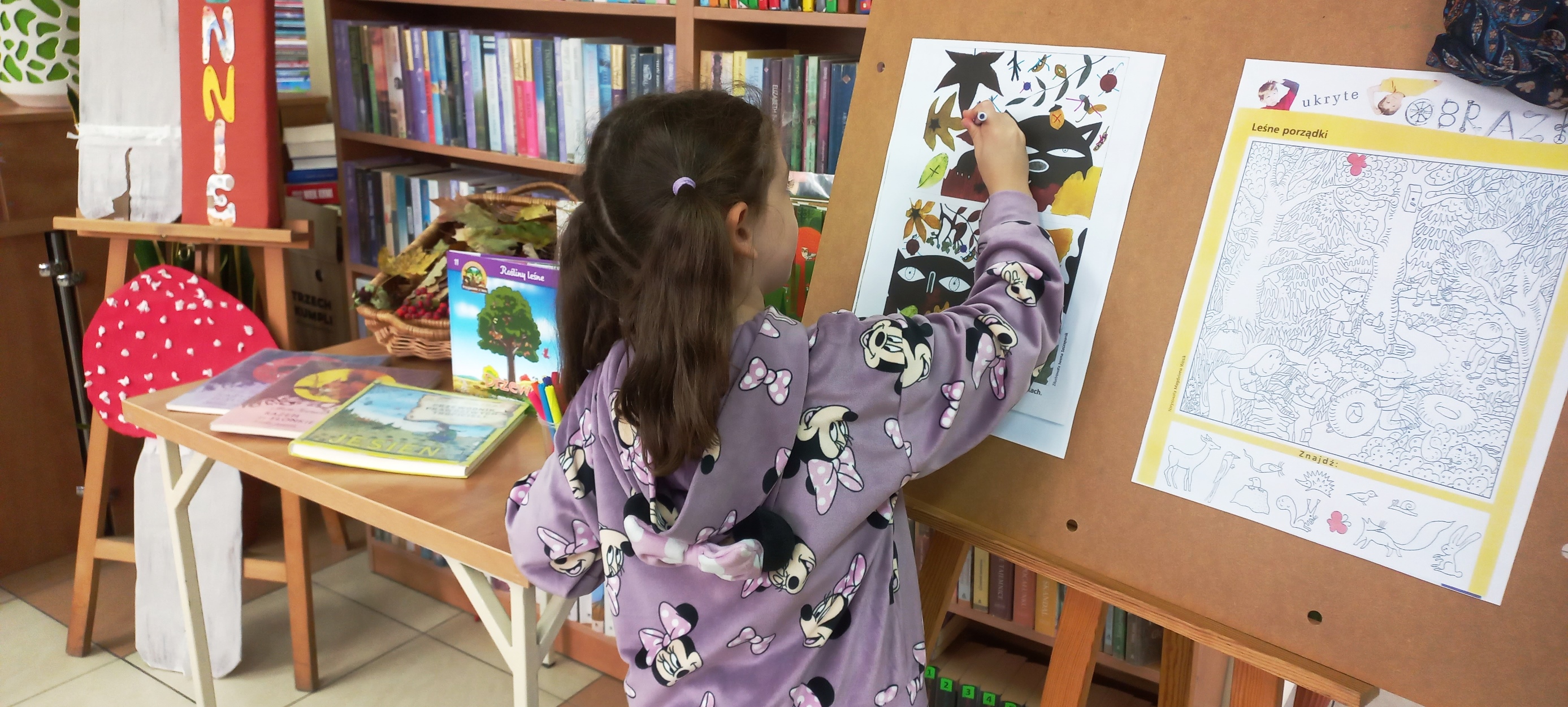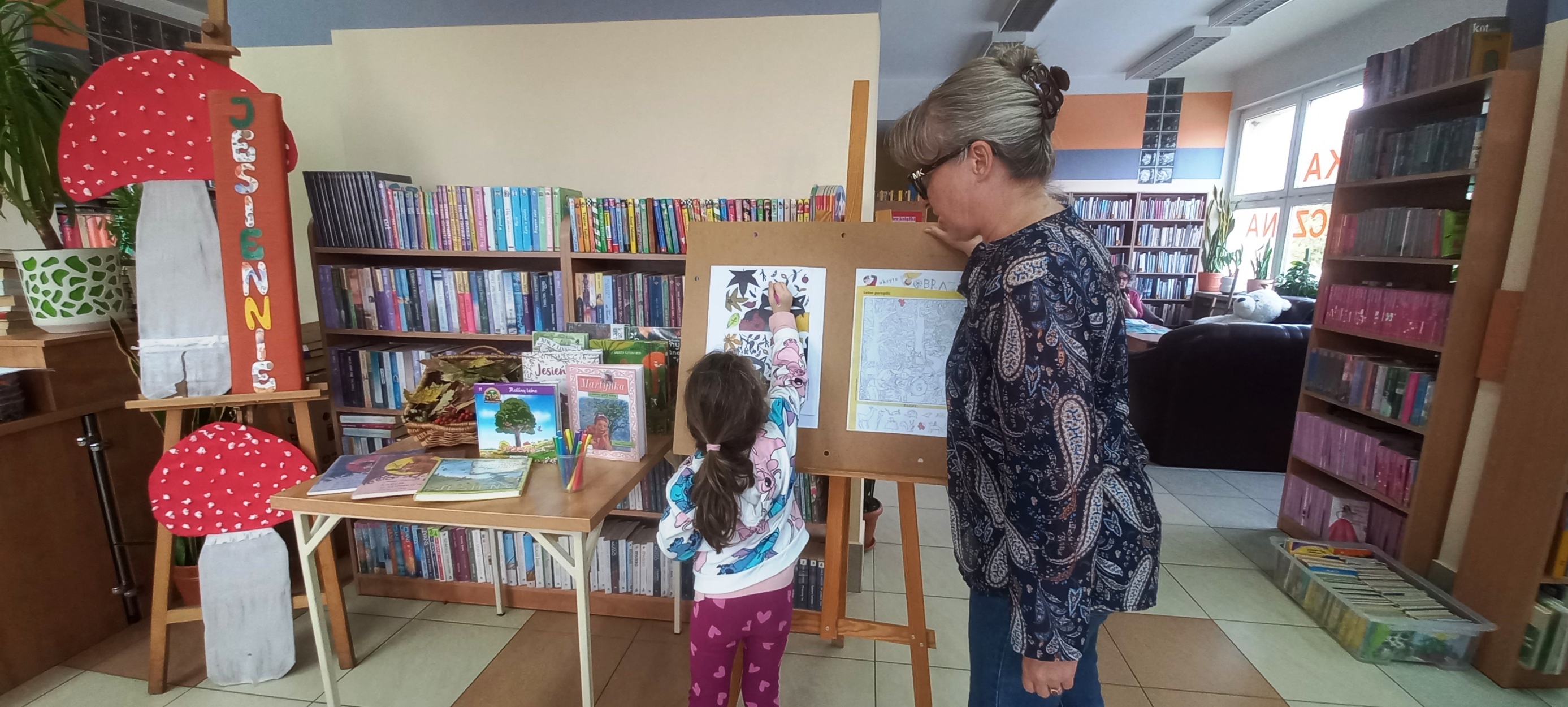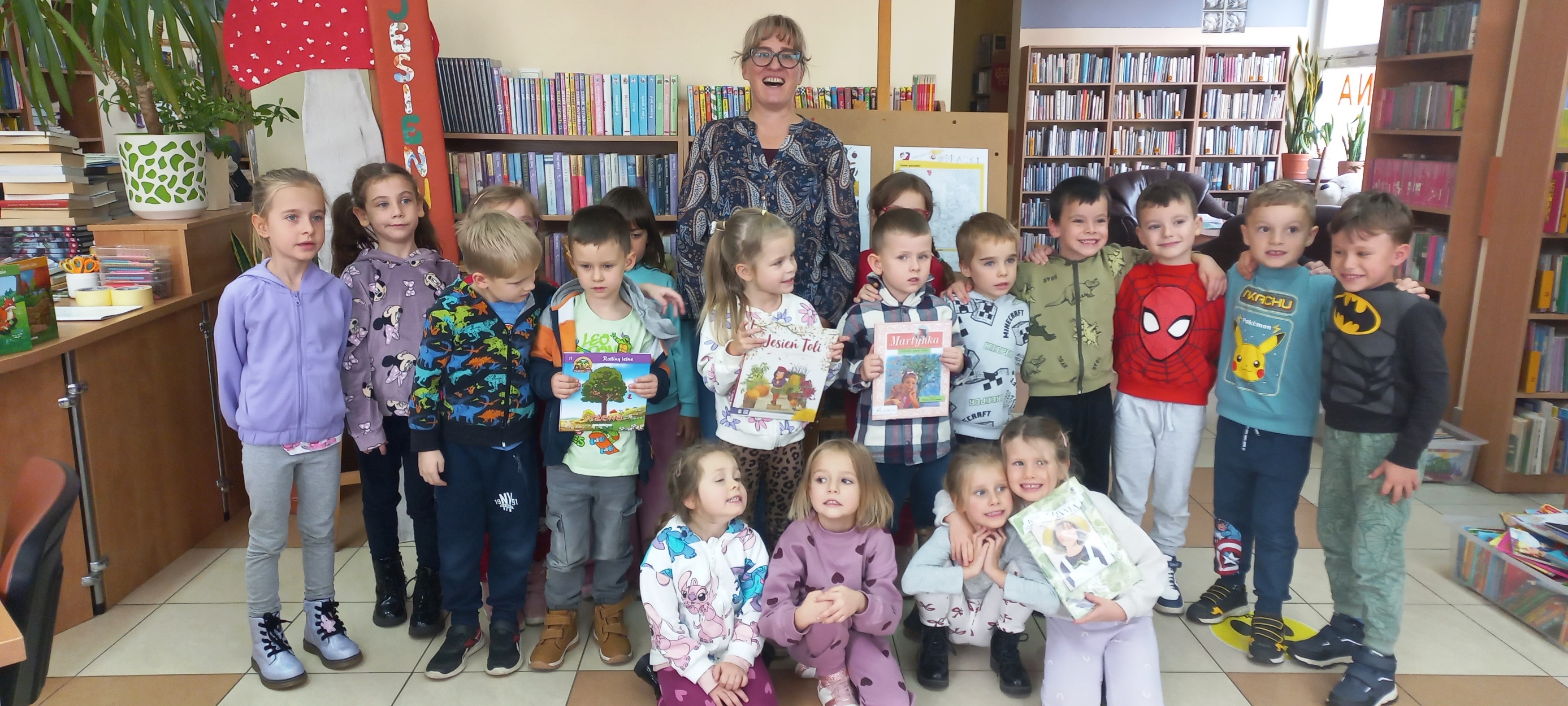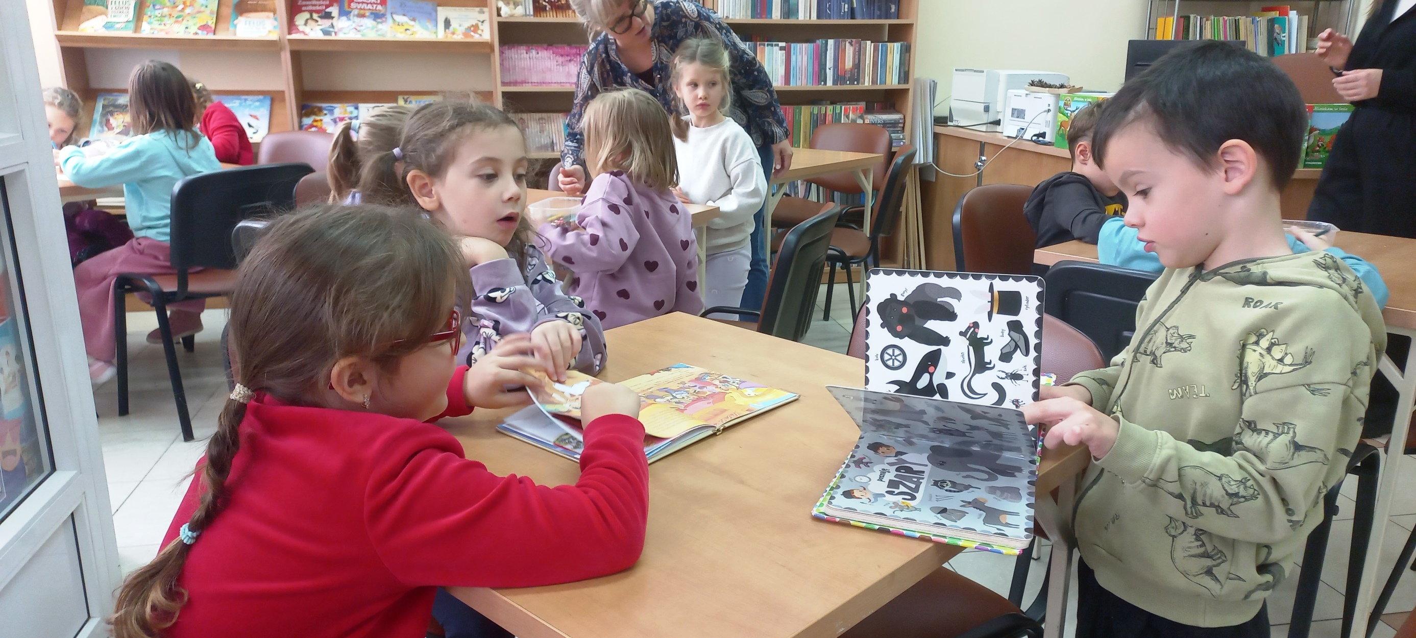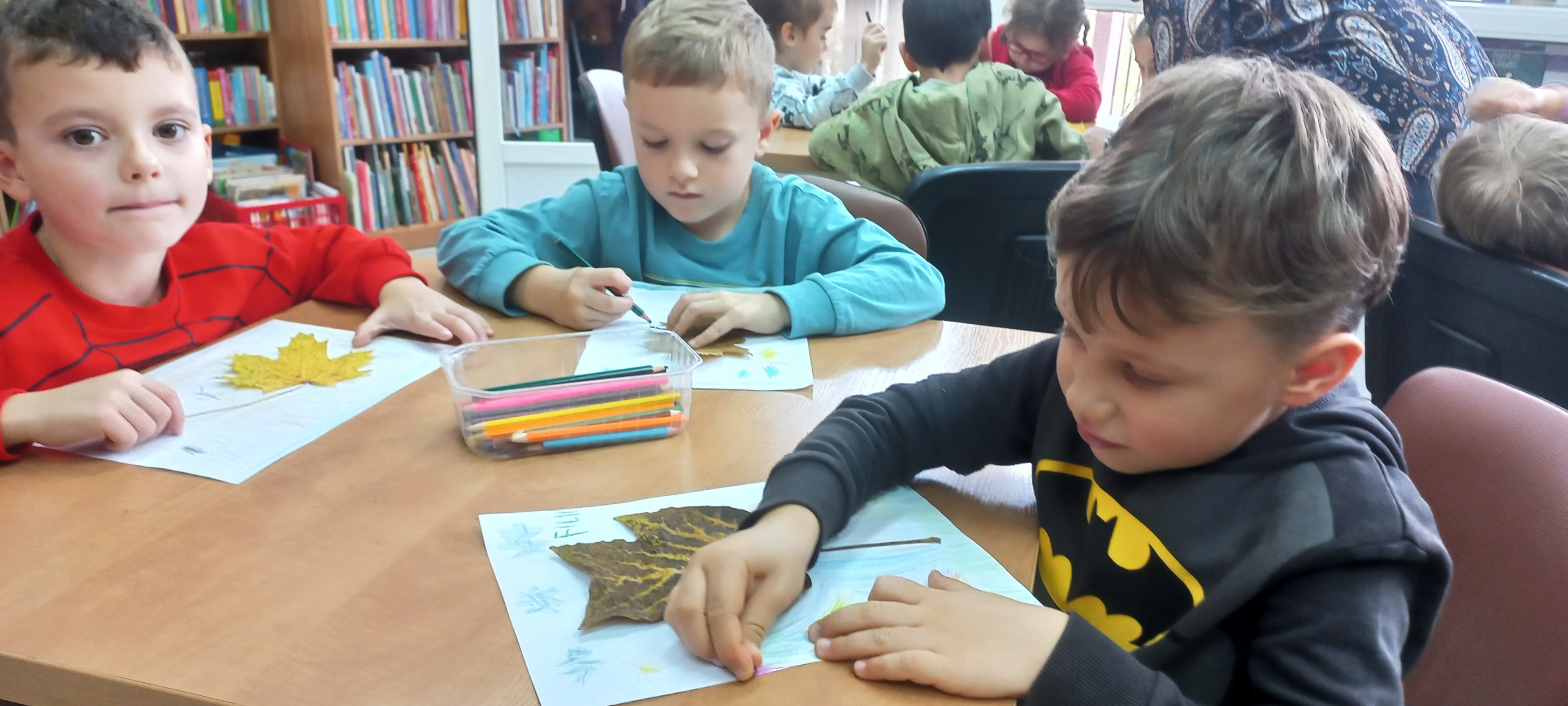 …odbyły się zajęcia z „Motylkami” z PS nr 39 w Kielcach. Dzięki opowiadaniu M. Strzałkowskiej pt. „Stworek Kolorek i antocyjany” poznaliśmy substancje odpowiedzialne za zmiany koloru liści w ciągu roku. Dowiedzieliśmy się, dlaczego drzewa te liście gubią jesienią. Dużo zabawy przyniosło poszukiwanie takich samych elementów na obrazkach (zwykle szukamy różnic). Wreszcie każdy przedszkolak wybierał jeden jesienny liść, przymocowywał na kartce i ozdabiał jesienną „historią”- powstały niepowtarzalne, piękne prace. Spotkanie tradycyjnie zakończyło oglądanie książek i nasze zaproszenie do odwiedzania biblioteki.