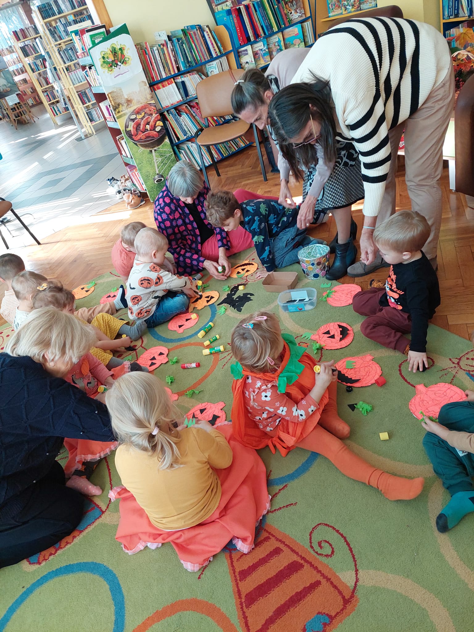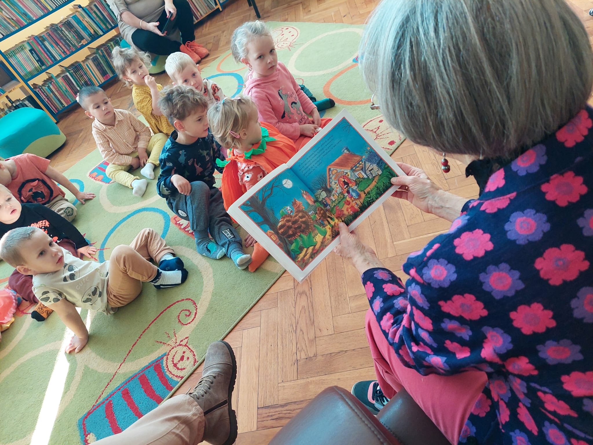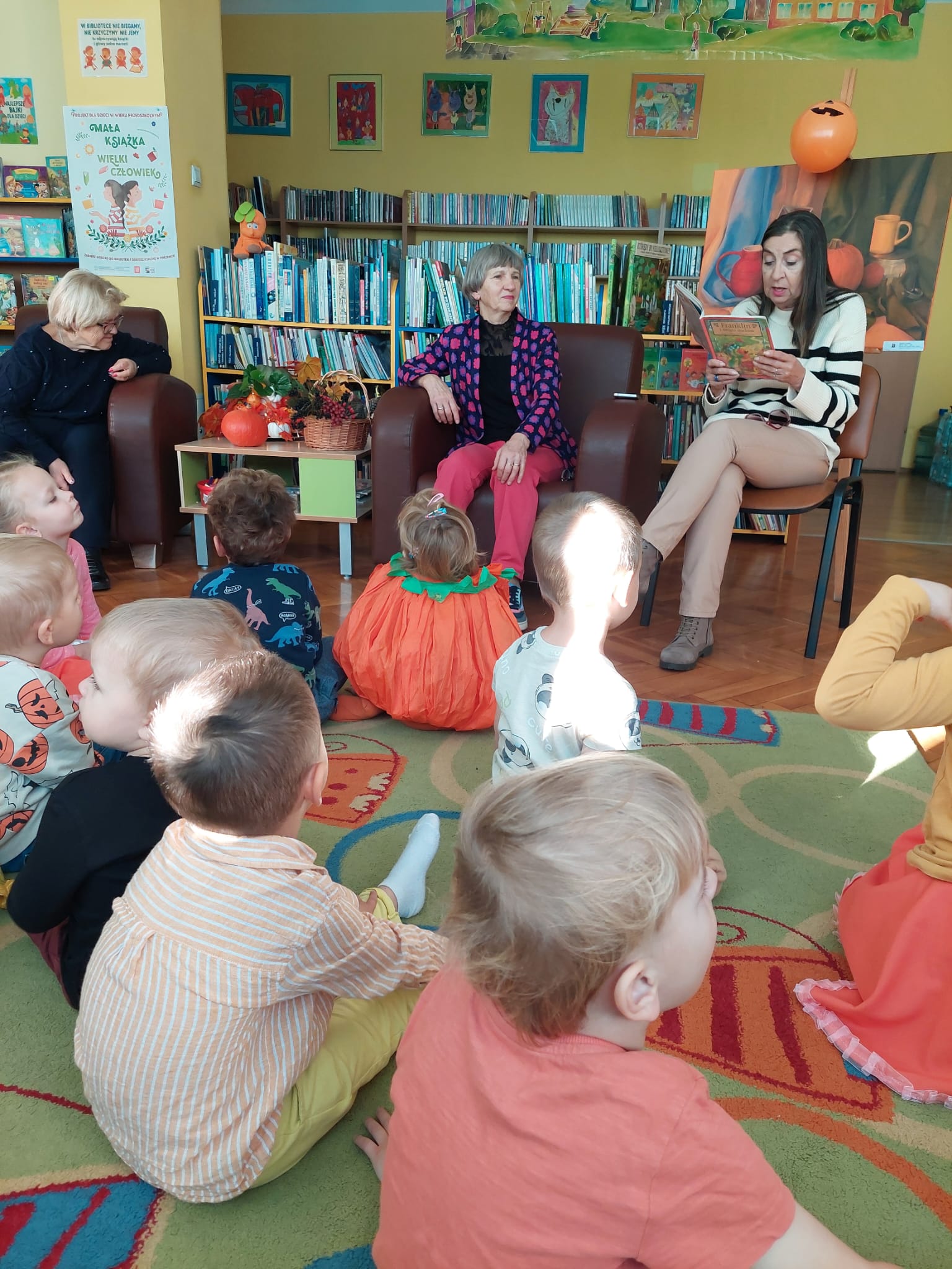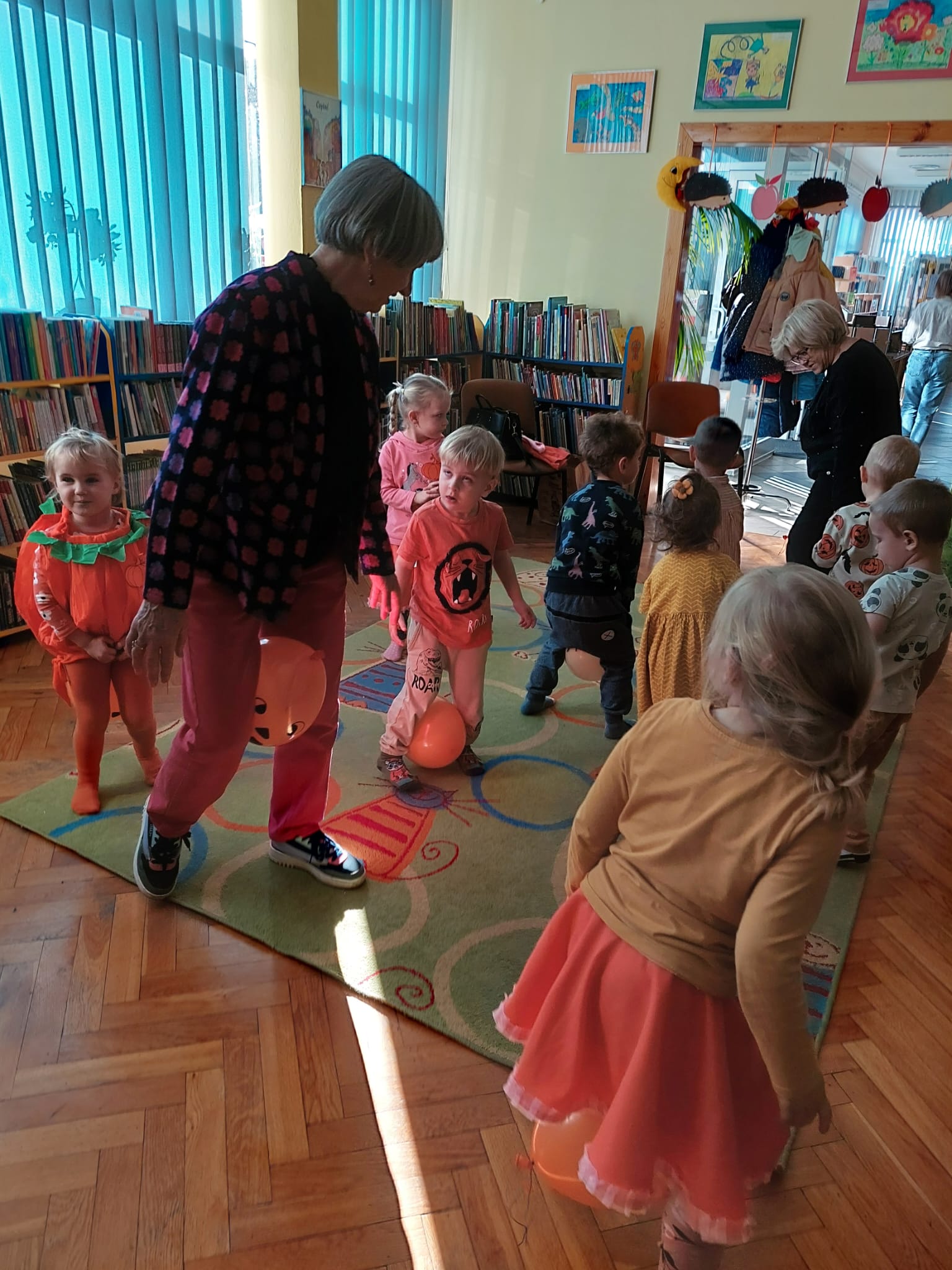 W Filii nr 10 świętowaliśmy Dzień Dyni w wyjątkowym, międzypokoleniowym gronie. Gościliśmy najmłodszych czytelników – grupę 3–4-latków z Przedszkola nr 42 – oraz Seniorów z zaprzyjaźnionego Klubu Seniora. Spotkanie rozpoczęliśmy rozmową o tym, czym jest Dzień Dyni i z czym się kojarzy. Następnie Panie z Klubu Seniora przeczytały maluchom książkę „Franklin i święto duchów”, która wprowadziła wszystkich w radosny, halloweenowy nastrój. Wspólnie stworzyliśmy Drzewo Dyniowe, na którym zawisły kolorowe, sympatyczne dynie. Potem przyszedł czas na zabawę ruchową z balonami, która wywołała mnóstwo uśmiechów – zarówno u dzieci, jak i dorosłych. Nie zabrakło też dyniowych zagadek i łamigłówek. Na zakończenie każdy uczestnik wykonał własną, halloweenową dynię. To było radosne, pełne energii i wzruszeń spotkanie, które pokazało, jak pięknie można łączyć pokolenia poprzez wspólną zabawę i twórczość. Dziękujemy wszystkim uczestnikom za cudowny czas i wspólną, jesienną przygodę!