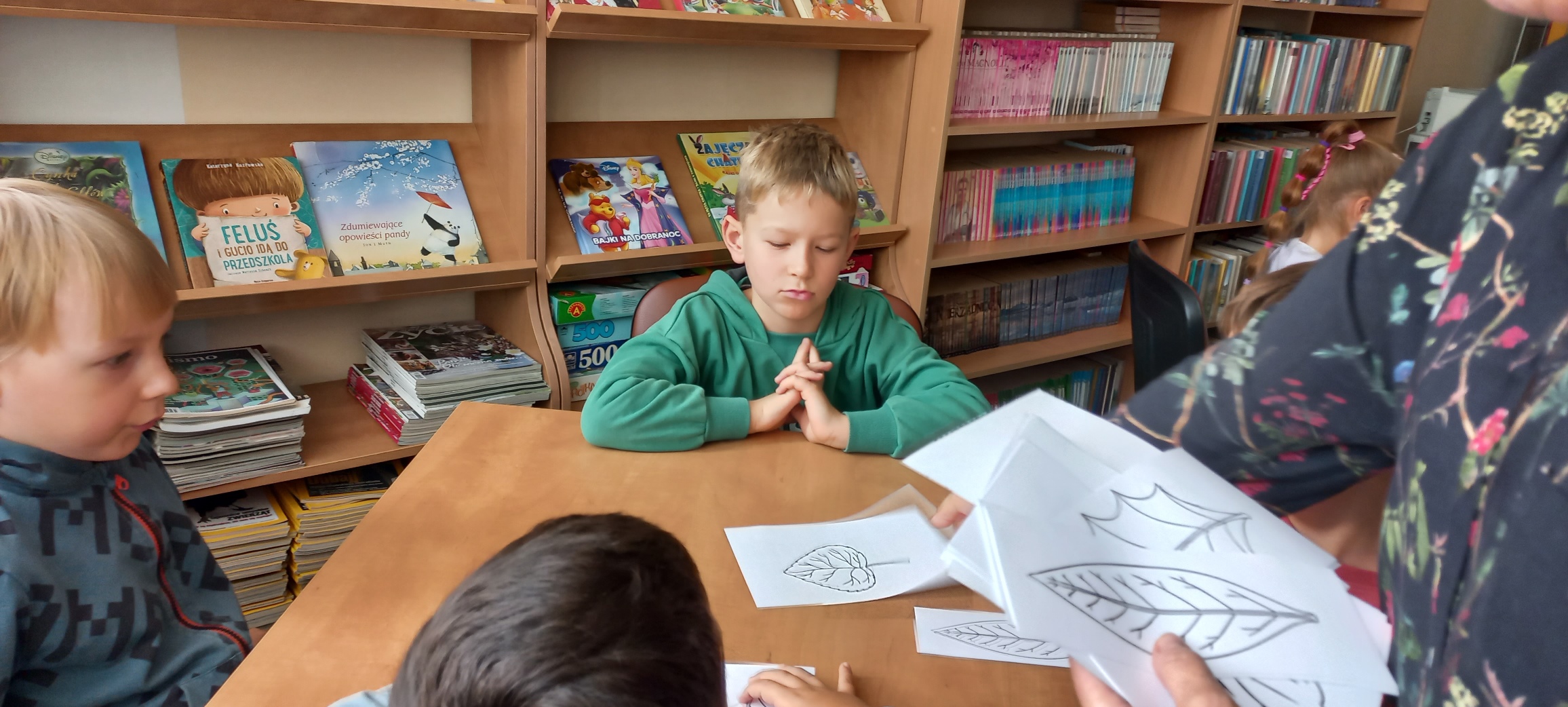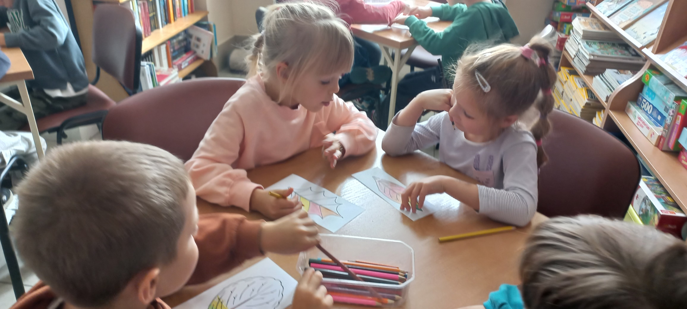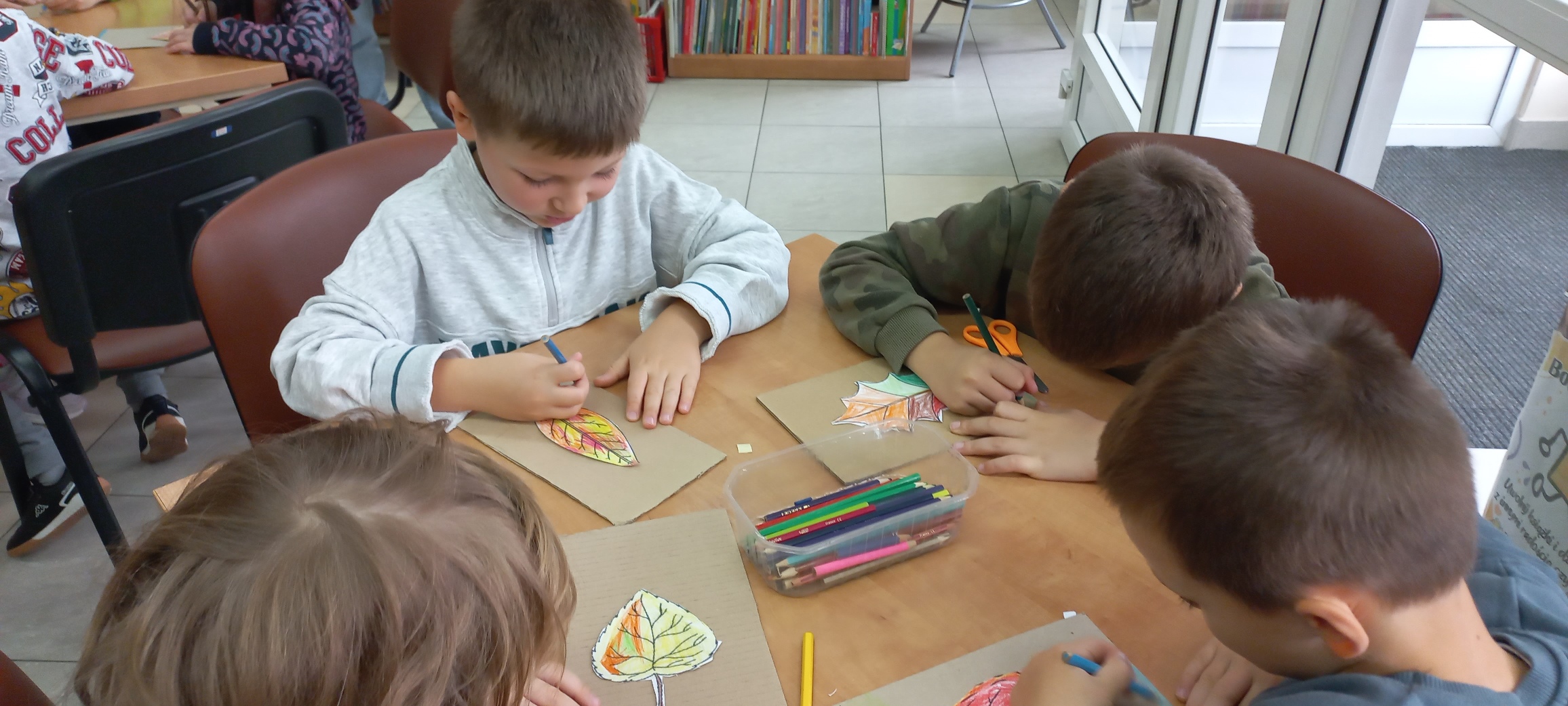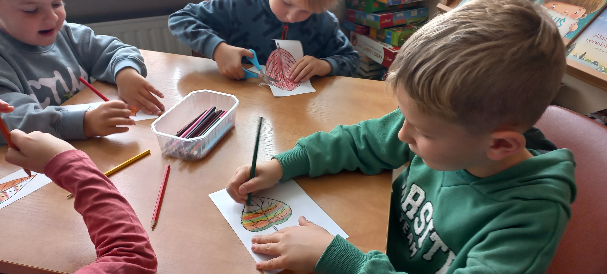Pierwsze powakacyjne spotkanie w Filii nr 8 odbyło się w towarzystwie grupy Krasnoludków z PS nr 39 w Kielcach. Starszaki poznały przygody „Poli w lesie” G. Rzepeckiej - Weis, co pomogło przypomnieć i uporządkować zasady zachowania się podczas wizyty w lesie. Dzieci doskonale wiedziały, że w nim nie hałasujemy, nie śmiecimy, nie niszczymy roślin i nie zbliżamy się do dzikiej zwierzyny. Każdy winien uważać na trujące grzyby i inne nieznane rośliny leśne. Zajęcia zakończyły się wykonaniem przez dzieci jesiennych ilustracji – pokolorowanych liści/drzewek.