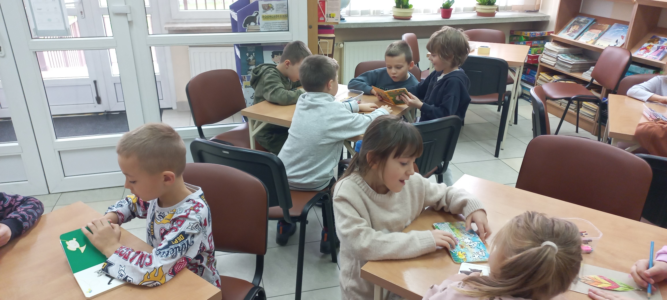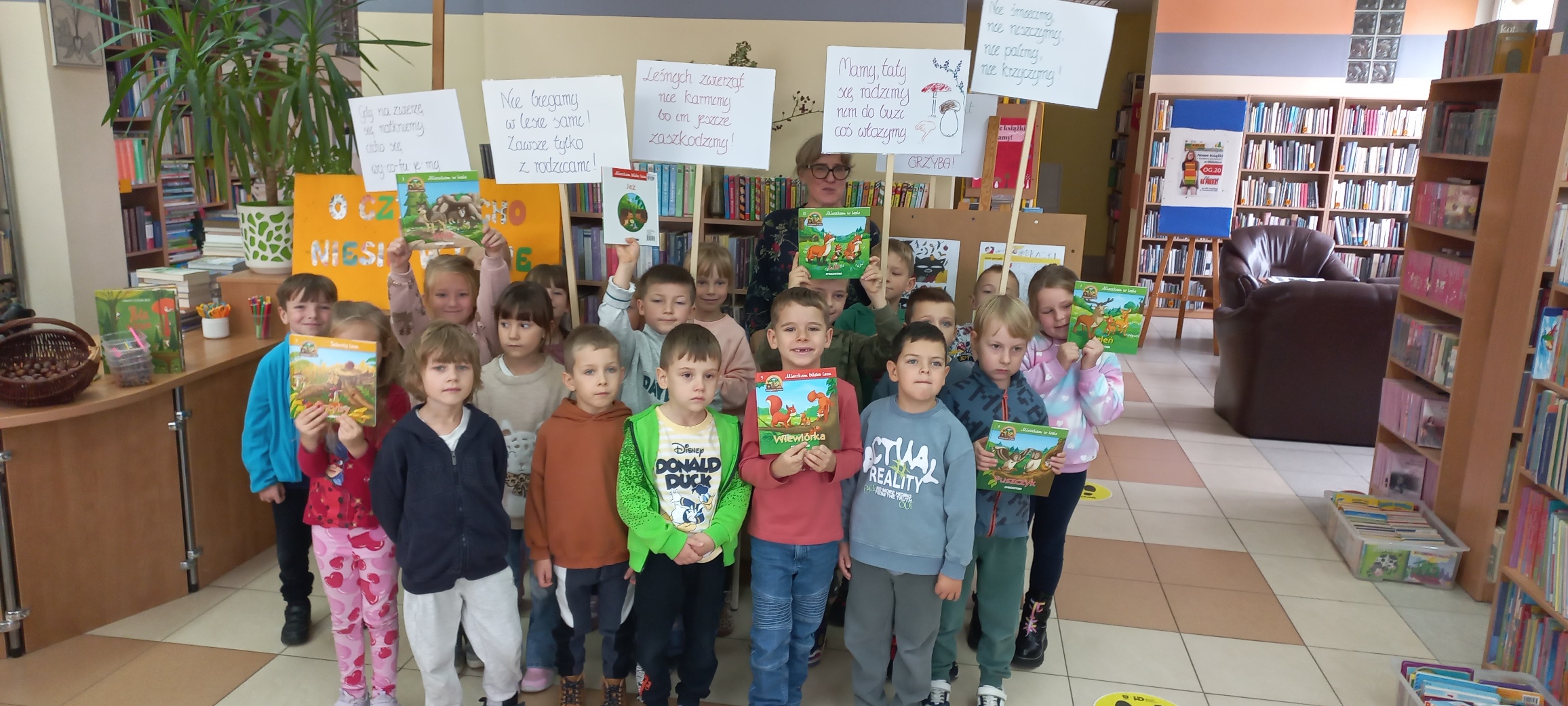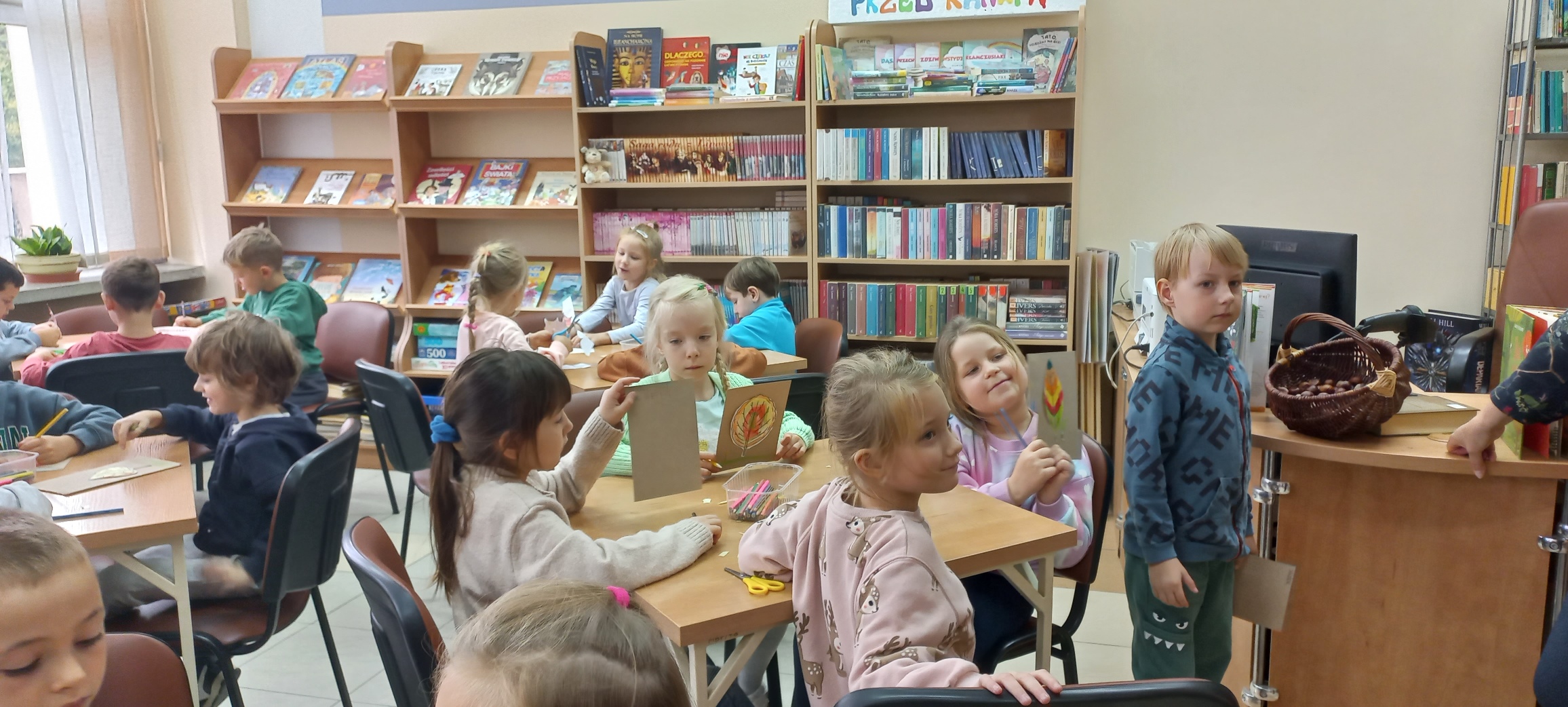 Pierwsze powakacyjne spotkanie w Filii nr 8 odbyło się w towarzystwie grupy Krasnoludków z PS nr 39 w Kielcach. Starszaki poznały przygody „Poli w lesie” G. Rzepeckiej - Weis, co pomogło przypomnieć i uporządkować zasady zachowania się podczas wizyty w lesie. Dzieci doskonale wiedziały, że w nim nie hałasujemy, nie śmiecimy, nie niszczymy roślin i nie zbliżamy się do dzikiej zwierzyny. Każdy winien uważać na trujące grzyby i inne nieznane rośliny leśne. Zajęcia zakończyły się wykonaniem przez dzieci jesiennych ilustracji – pokolorowanych liści/drzewek.