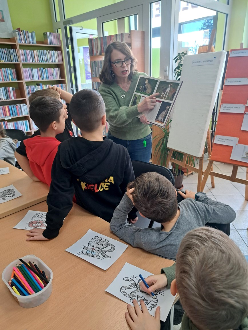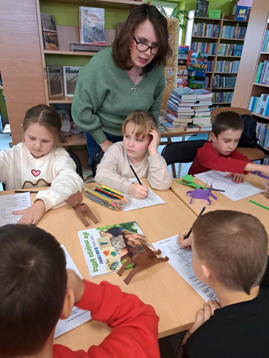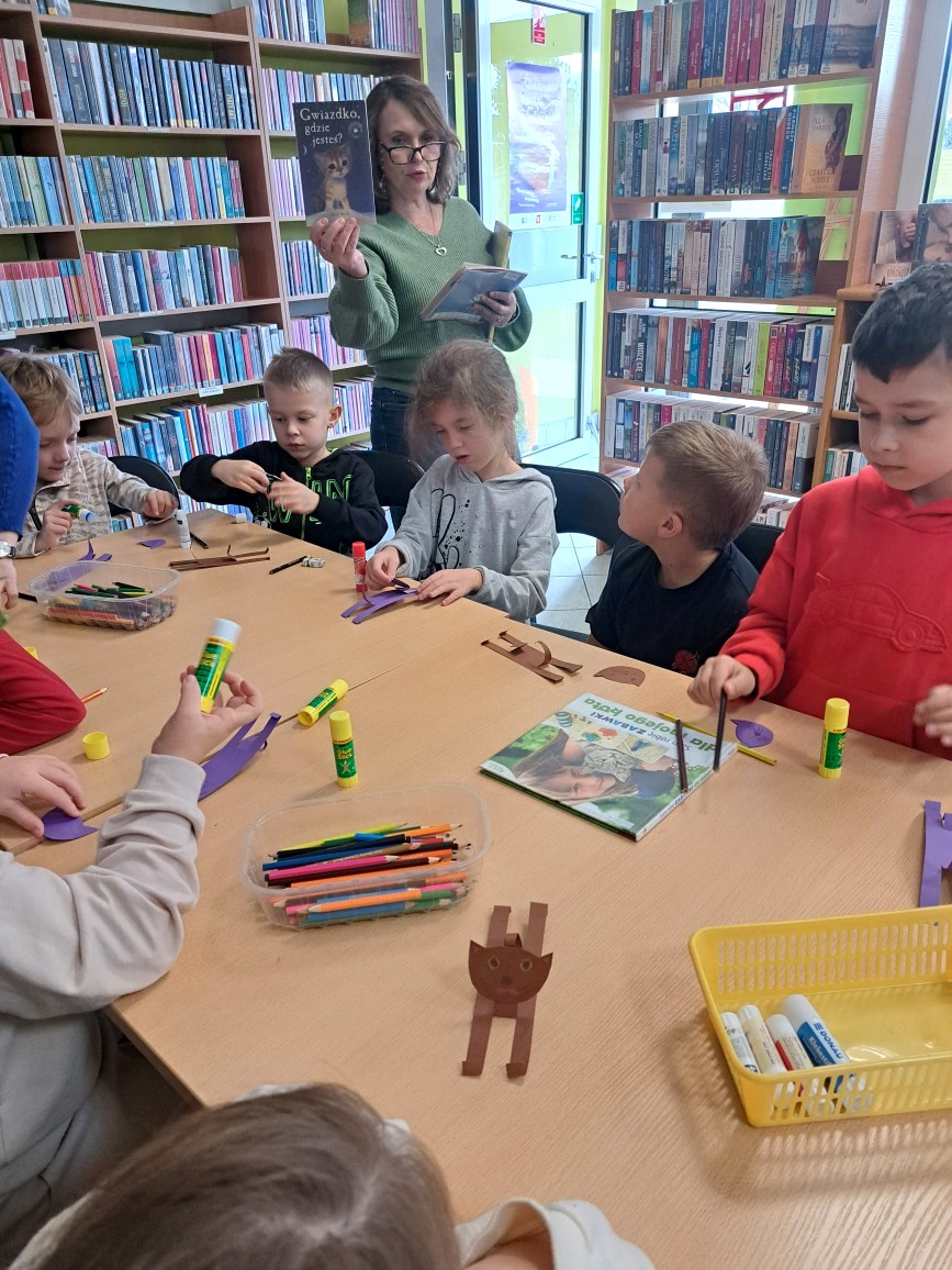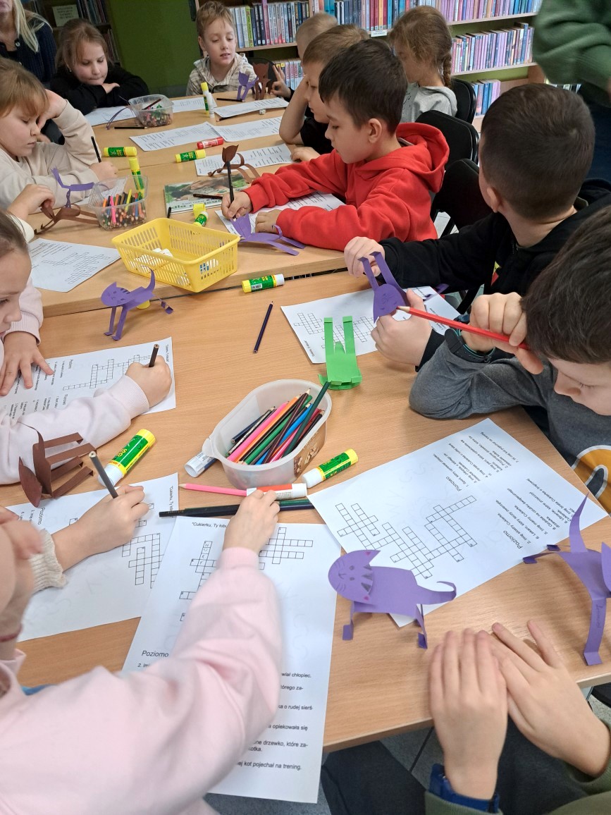 Wraz ze słońcem do naszej filii przyszli pierwsi goście. Byli to uczniowie klasy I c SP nr 5. Zajęcia biblioteczne stały się okazją, by mogli utrwalić sobie przeczytaną lekturę "Cukierku, ty łobuzie!". Wszystkie dzieci świetnie poradziły sobie z przygotowanymi dla nich zadaniami: połączeniem tytułu rozdziału z odpowiednim obrazkiem, rozwiązywaniem krzyżówki i odpowiadaniem na pytania dotyczące głównego bohatera książki. Pierwszoklasiści dowiedzieli się też, że cała seria książek o Cukierku liczy aż dziewięć części i że w naszej bibliotece jest też dużo innych wydawnictw o kotkach, np. o Kici Koci, Kocie Cykorze, nieśmiałym kotku i kotce Gwiazdce. W czasie rozmowy z naszymi miłymi gośćmi okazało się, że dużo wiedzą na temat hodowli kotów i opieki nad nimi. Są również świadomi, jakie ludzie mają obowiązki wobec swoich milusińskich. Zaprezentowane dzieciom książki i albumy o zwierzętach były dla nich dodatkową porcją wiedzy.