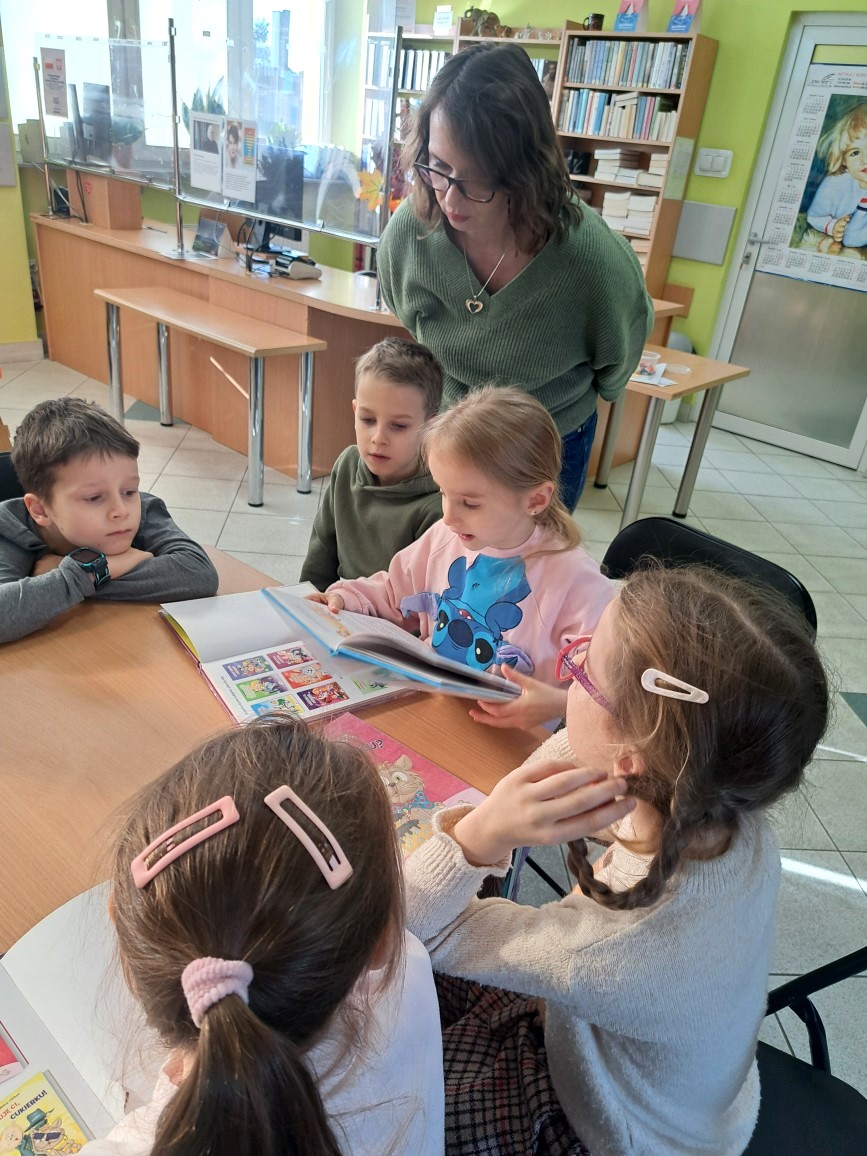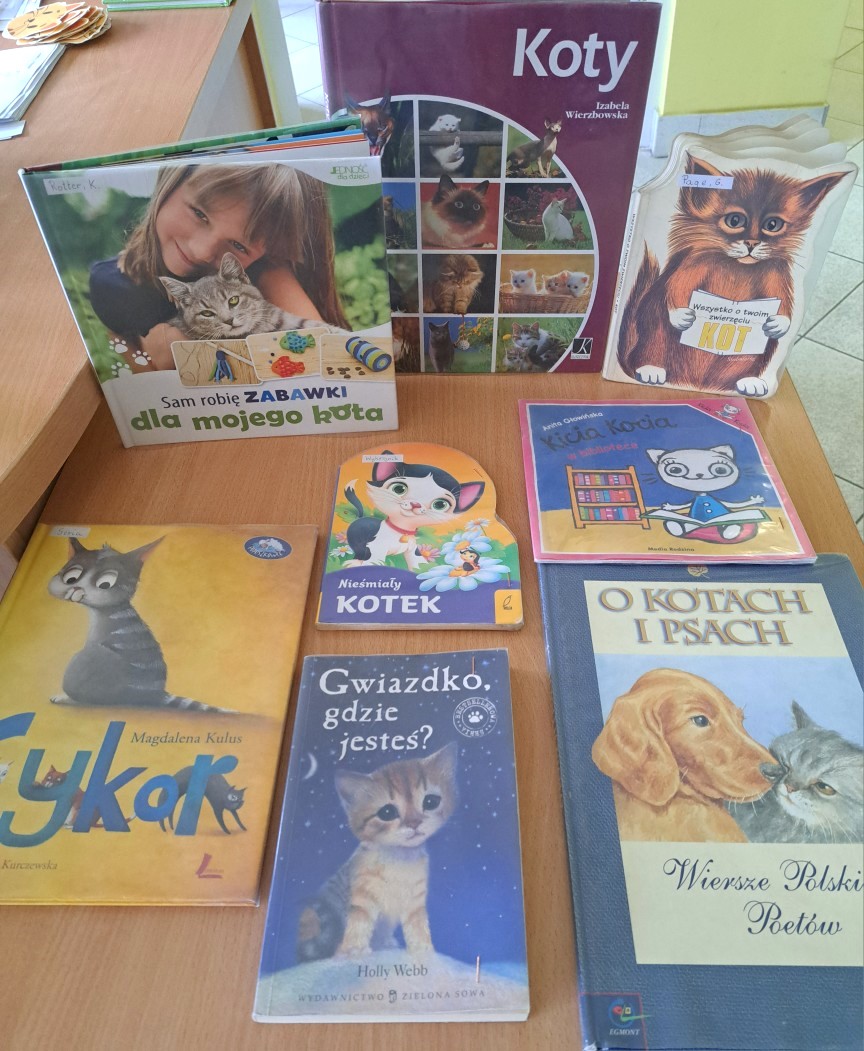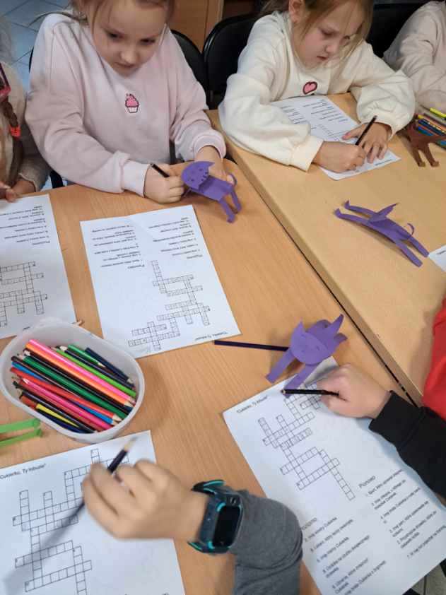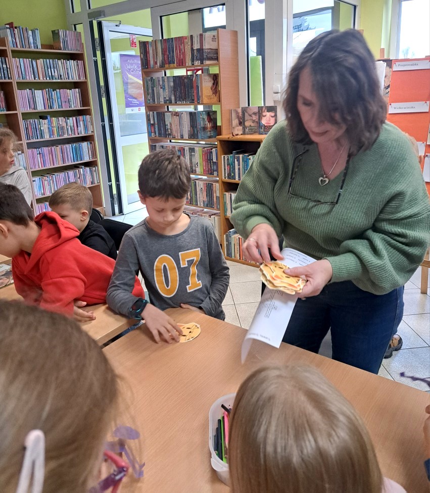 Wraz ze słońcem do naszej filii przyszli pierwsi goście. Byli to uczniowie klasy I c SP nr 5. Zajęcia biblioteczne stały się okazją, by mogli utrwalić sobie przeczytaną lekturę "Cukierku, ty łobuzie!". Wszystkie dzieci świetnie poradziły sobie z przygotowanymi dla nich zadaniami: połączeniem tytułu rozdziału z odpowiednim obrazkiem, rozwiązywaniem krzyżówki i odpowiadaniem na pytania dotyczące głównego bohatera książki. Pierwszoklasiści dowiedzieli się też, że cała seria książek o Cukierku liczy aż dziewięć części i że w naszej bibliotece jest też dużo innych wydawnictw o kotkach, np. o Kici Koci, Kocie Cykorze, nieśmiałym kotku i kotce Gwiazdce. W czasie rozmowy z naszymi miłymi gośćmi okazało się, że dużo wiedzą na temat hodowli kotów i opieki nad nimi. Są również świadomi, jakie ludzie mają obowiązki wobec swoich milusińskich. Zaprezentowane dzieciom książki i albumy o zwierzętach były dla nich dodatkową porcją wiedzy.