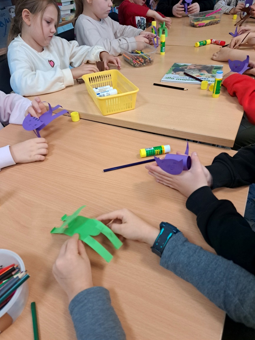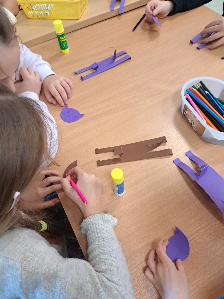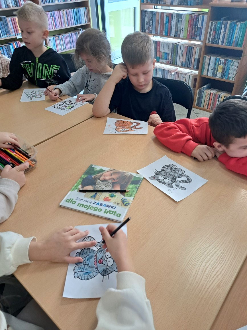 W czasie, gdy kolorowali podobiznę Cukierka i kleili kotki z kartonu wysłuchali wiersza Doroty Gellner "Bazyli". Po zajęciach wszyscy otrzymali kolorowe zakładki - główki kotków z godzinami pracy naszej biblioteki.
