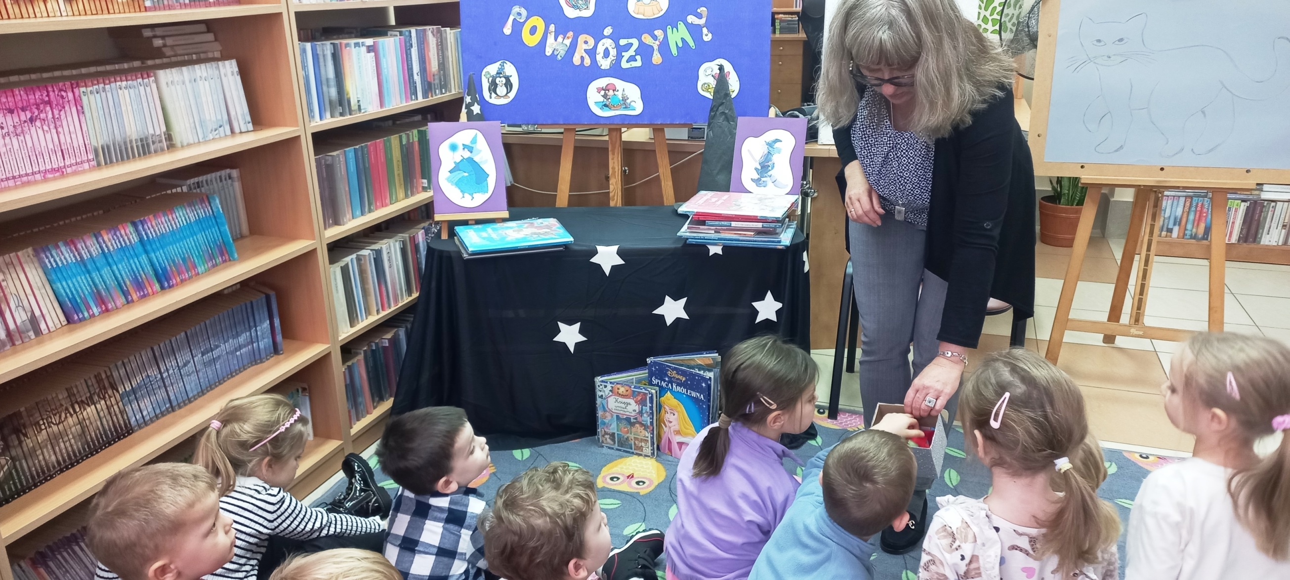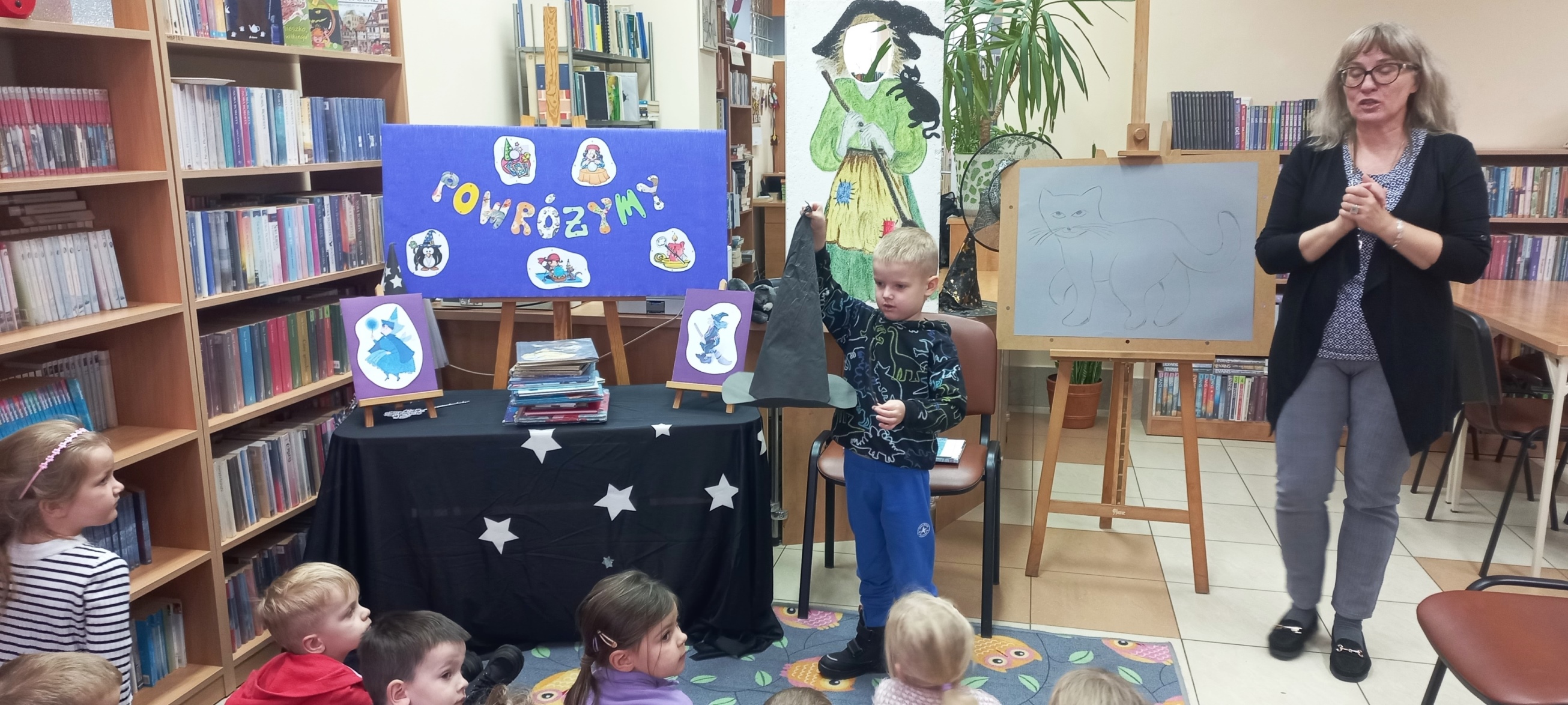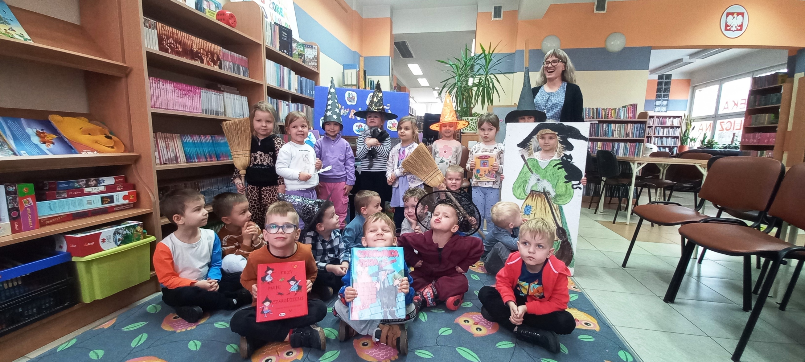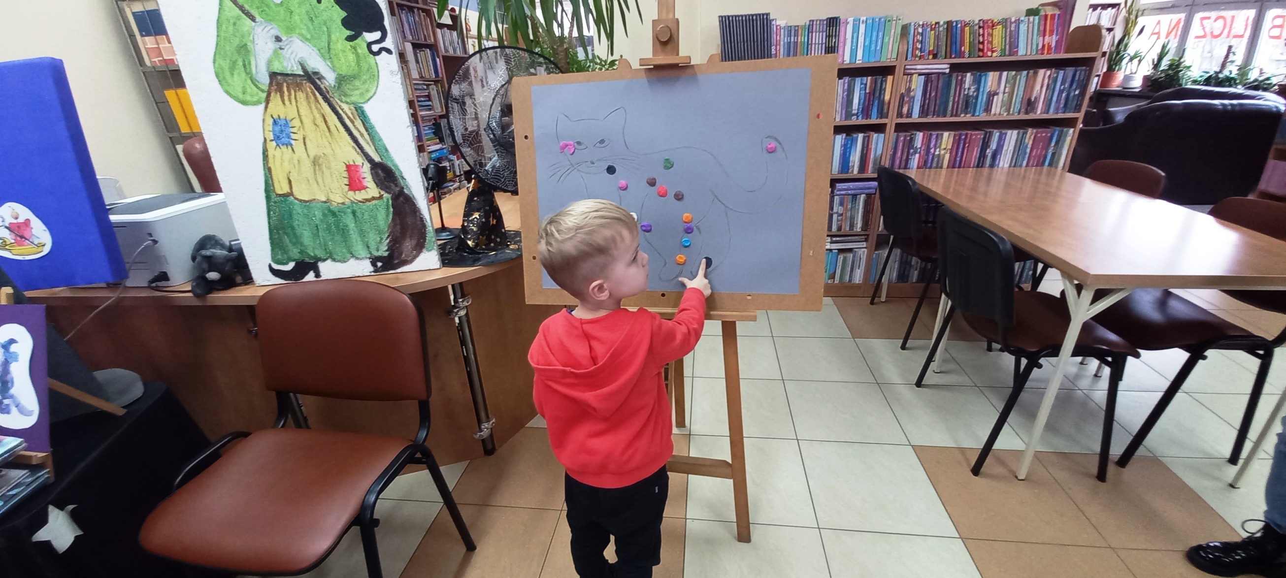 We wtorkowe przedpołudnie u nas czary! Czterolatki z PS nr 39 w Kielcach wysłuchały wiersza „Mała Wiedźma”, a następnie segregowaliśmy książki na te z bohaterkami Wróżkami i Czarownicami. Przyszła też pora na wróżby - z kolorowych karteczek i wycelowanych plastelinowymi kulkami części ciała kota - częstego towarzysza Czarownicy. Dzieci bawiły się świetnie, szczególnie przy wspólnej fotografii, gdzie wykorzystaliśmy wiele „czarodziejskich” atrybutów: miotły, kapelusze, różdżkę, czarnego kota…