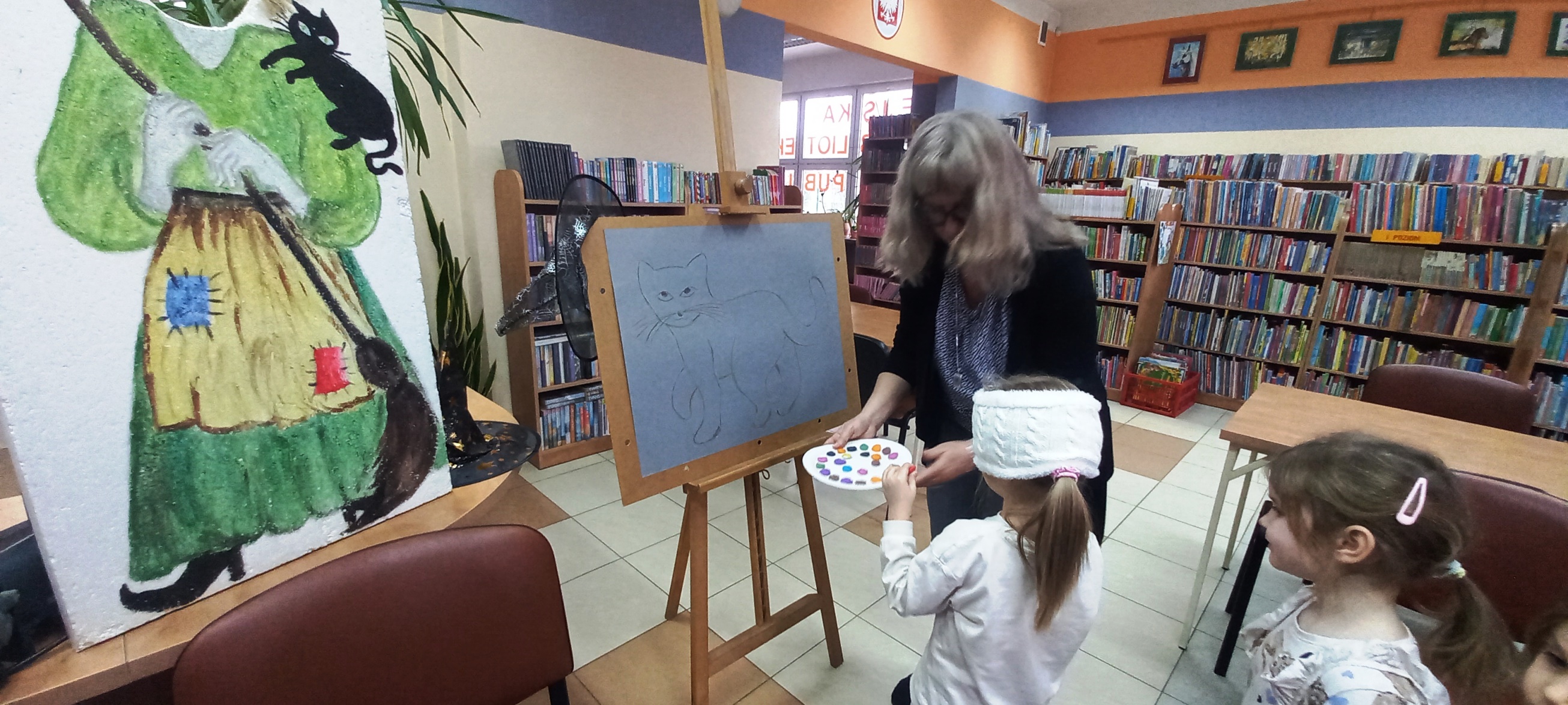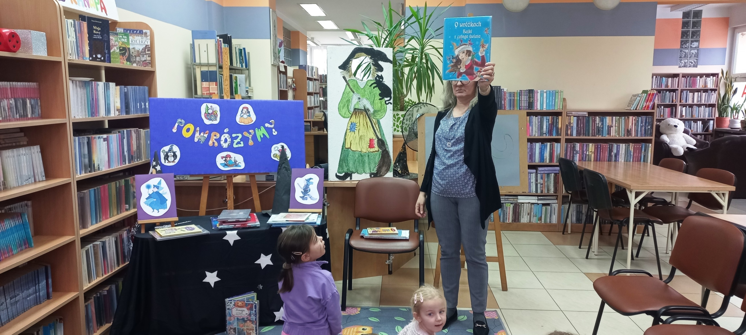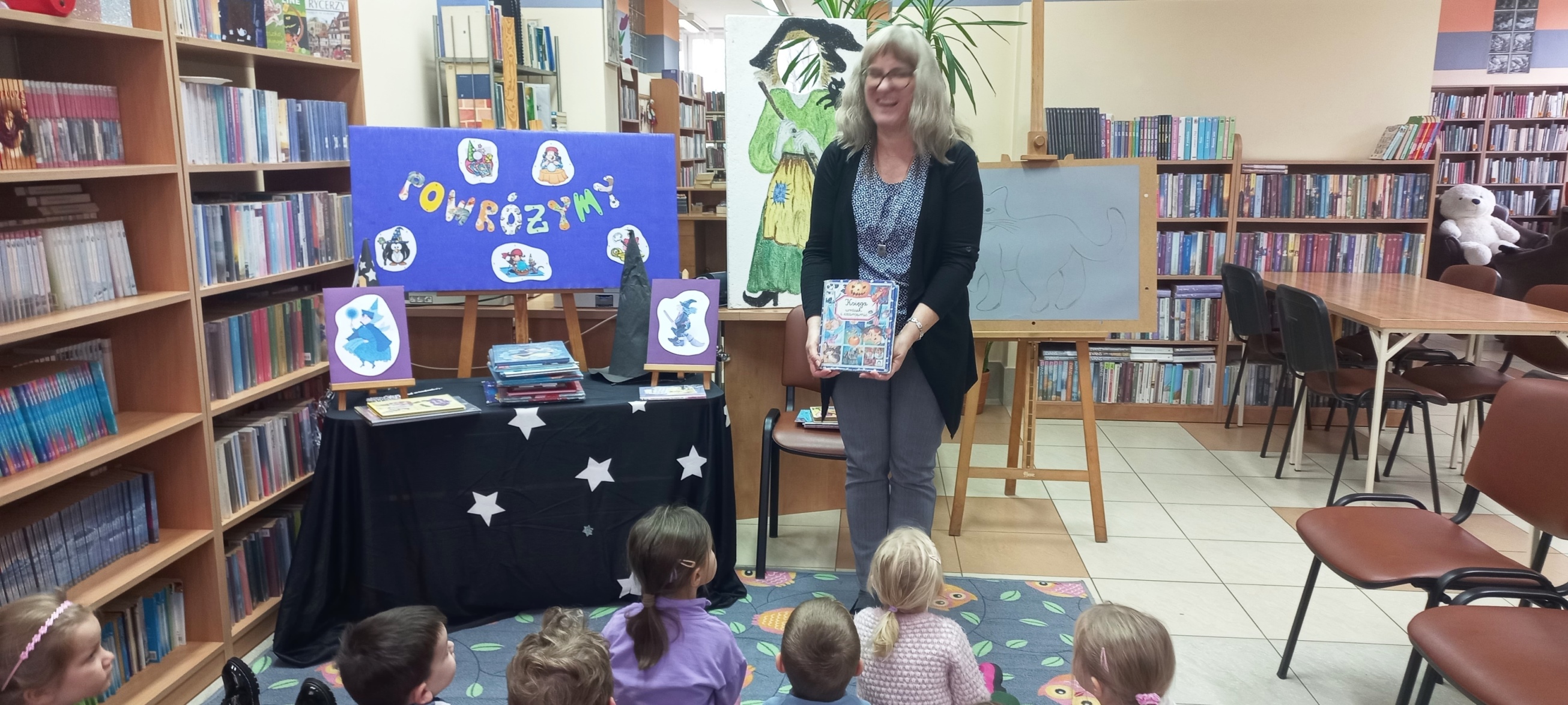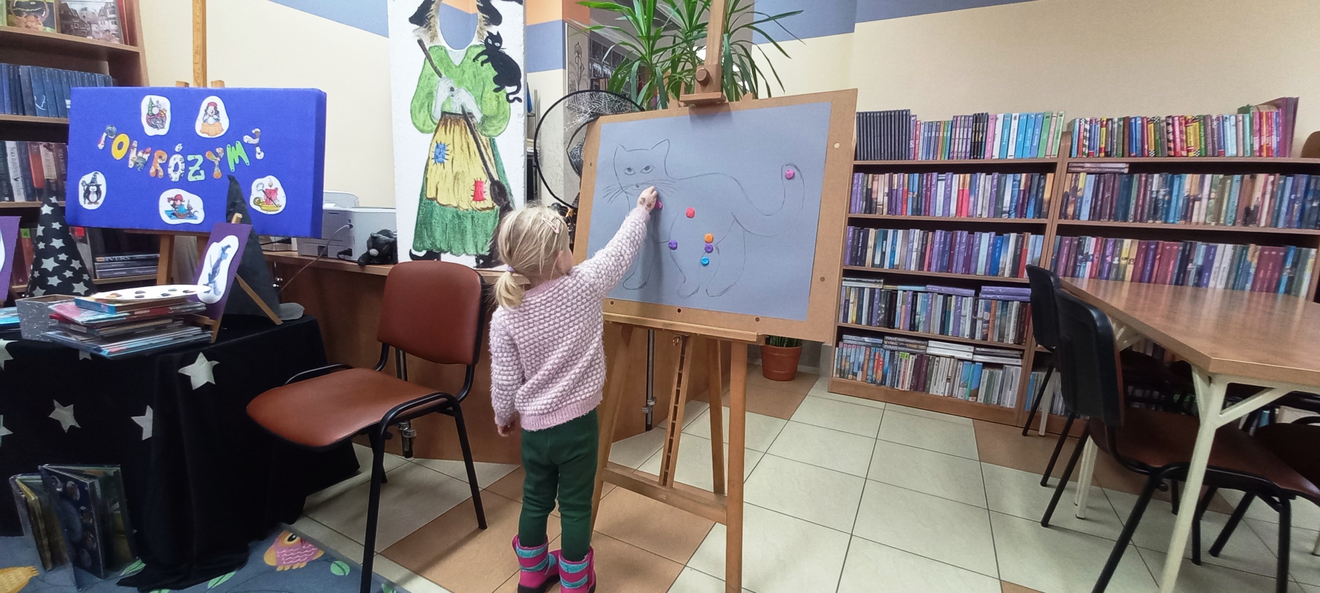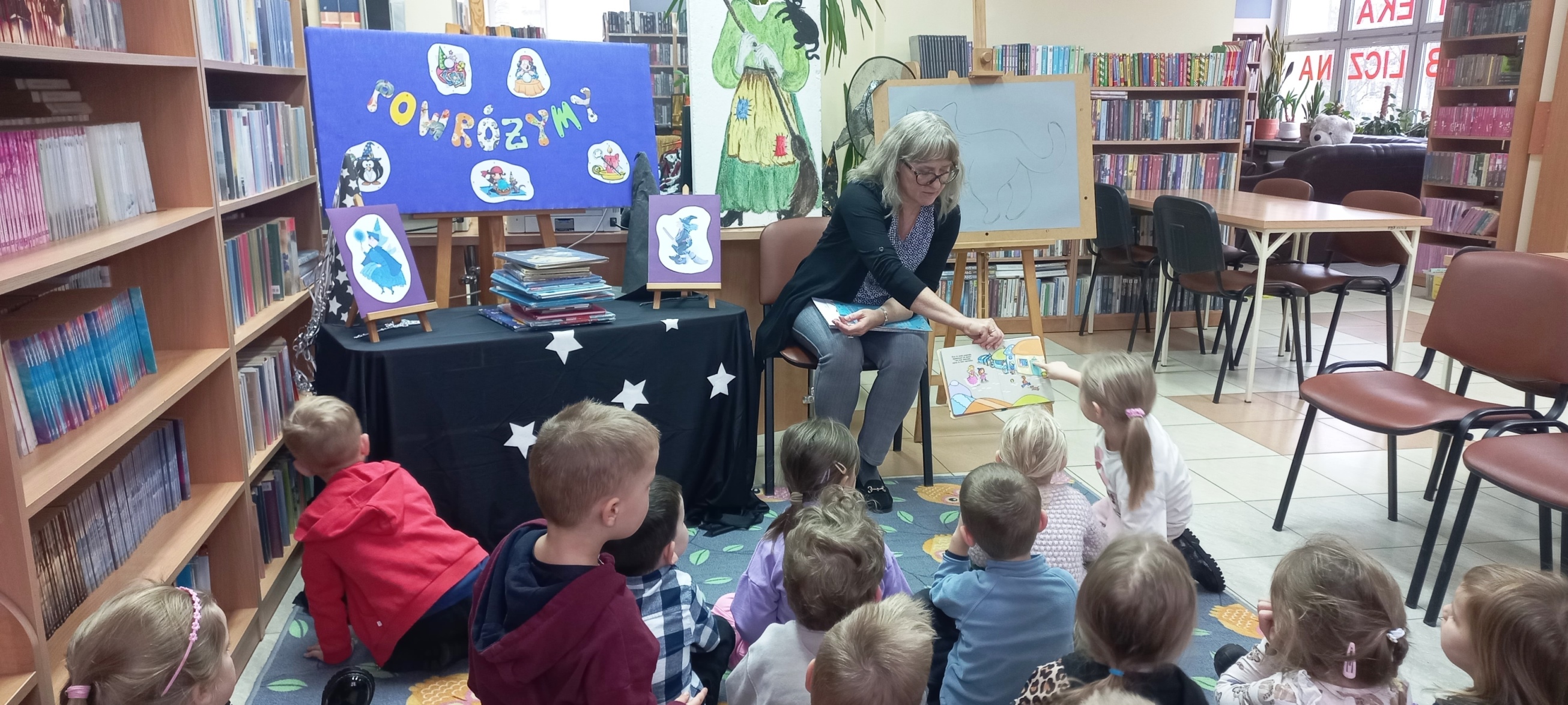 We wtorkowe przedpołudnie u nas czary! Czterolatki z PS nr 39 w Kielcach wysłuchały wiersza „Mała Wiedźma”, a następnie segregowaliśmy książki na te z bohaterkami Wróżkami i Czarownicami. Przyszła też pora na wróżby - z kolorowych karteczek i wycelowanych plastelinowymi kulkami części ciała kota - częstego towarzysza Czarownicy. Dzieci bawiły się świetnie, szczególnie przy wspólnej fotografii, gdzie wykorzystaliśmy wiele „czarodziejskich” atrybutów: miotły, kapelusze, różdżkę, czarnego kota…