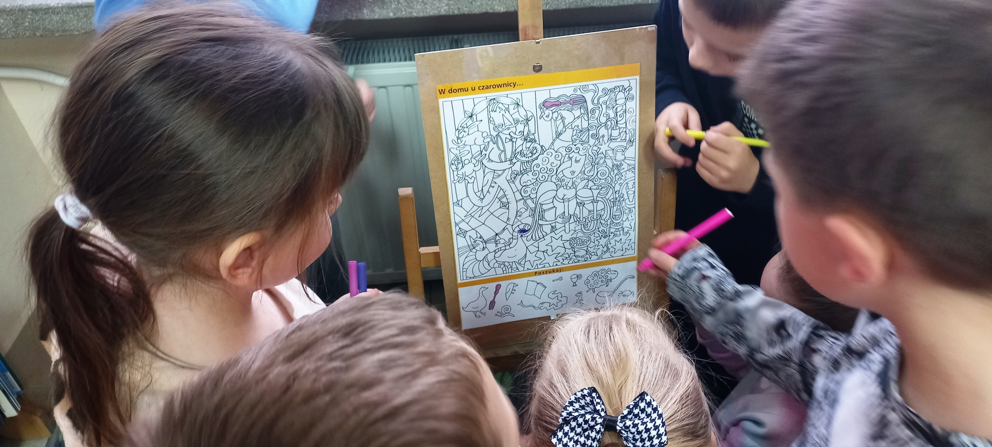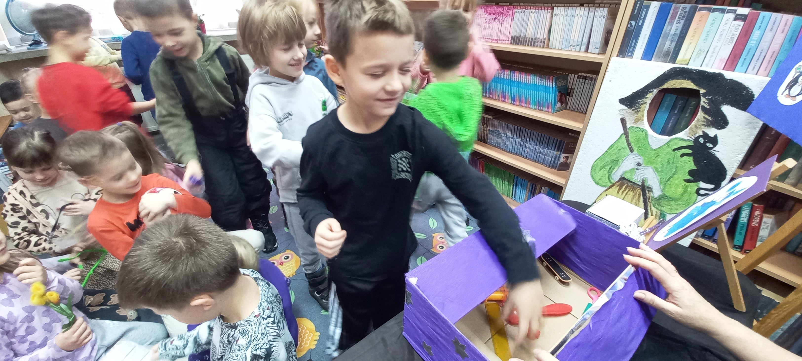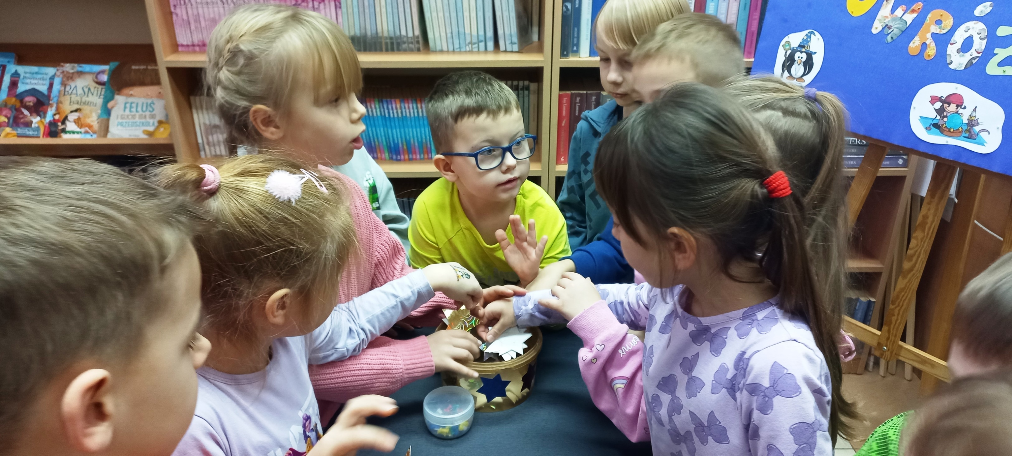 Kolejne spotkanie poświęcone wróżbom odbyło się z udziałem grupy Krasnoludków z PS nr 39 w Kielcach. Sześciolatki zostały wprowadzone w świat czarownic dzięki książce E. Horn „Przepraszam, czy jesteś czarownicą?”. Dowiedziały się, że czarownicę poznajemy po spiczastej czapie, pasiastych rajstopach, miotle i oczywiście czarnym kocie. W literaturze nie brakuje czarownic, czarodziejów i wróżek - o czym też rozmawialiśmy z przedszkolakami. Najwięcej frajdy - jak wiadomo - przyniosła jednak zabawa we wróżenie: z kolorowych karteczek, rzutu kostką i losowania przedmiotów symbolizujących zawód, który nasi goście mogliby wykonywać w przyszłości. Na koniec Krasnoludki podzielone na dwie grupy miały do wykonania tematyczne zadania: obrazek z gwiazdek i wyszukanie ukrytych przedmiotów na rysunku.