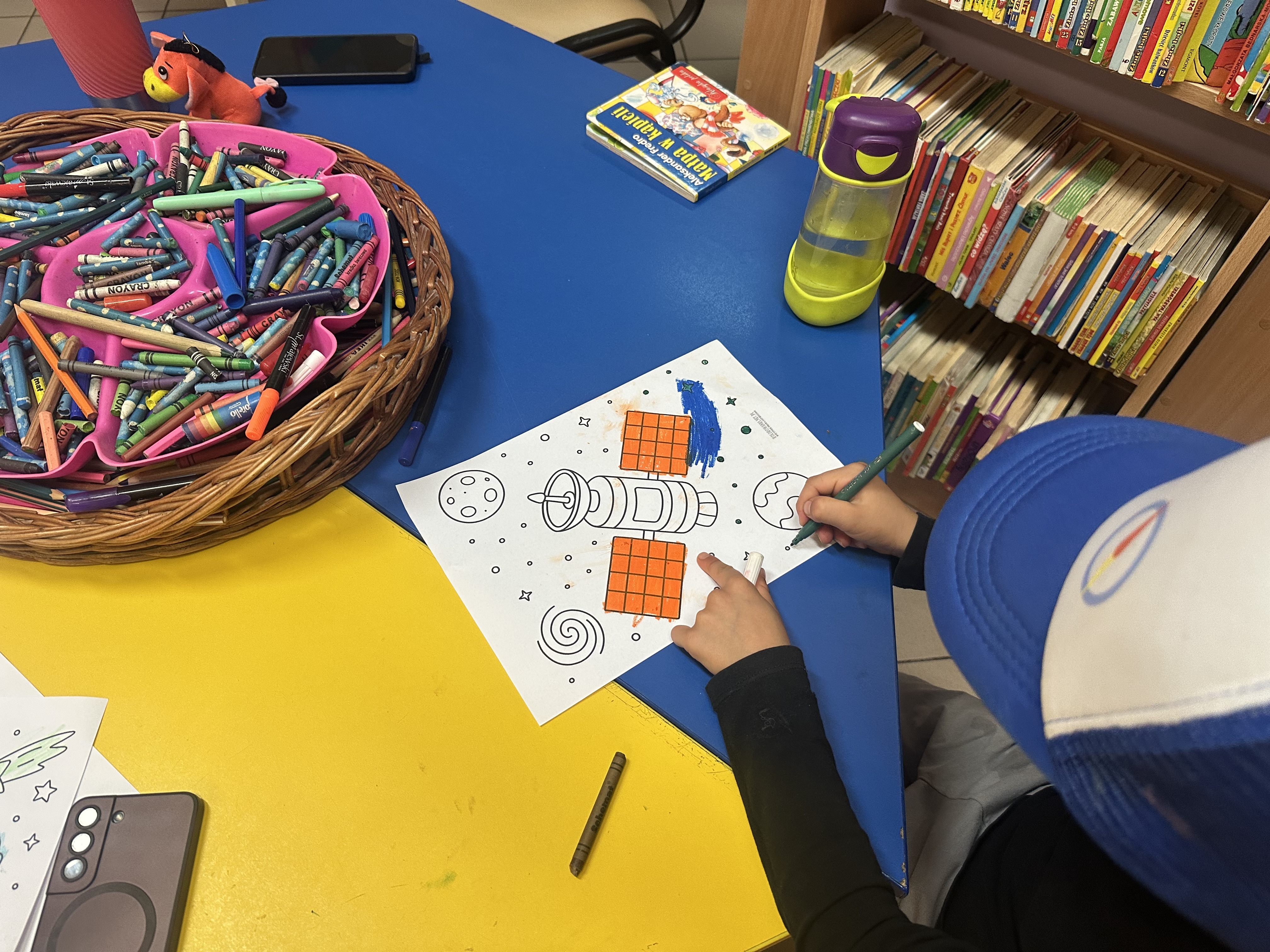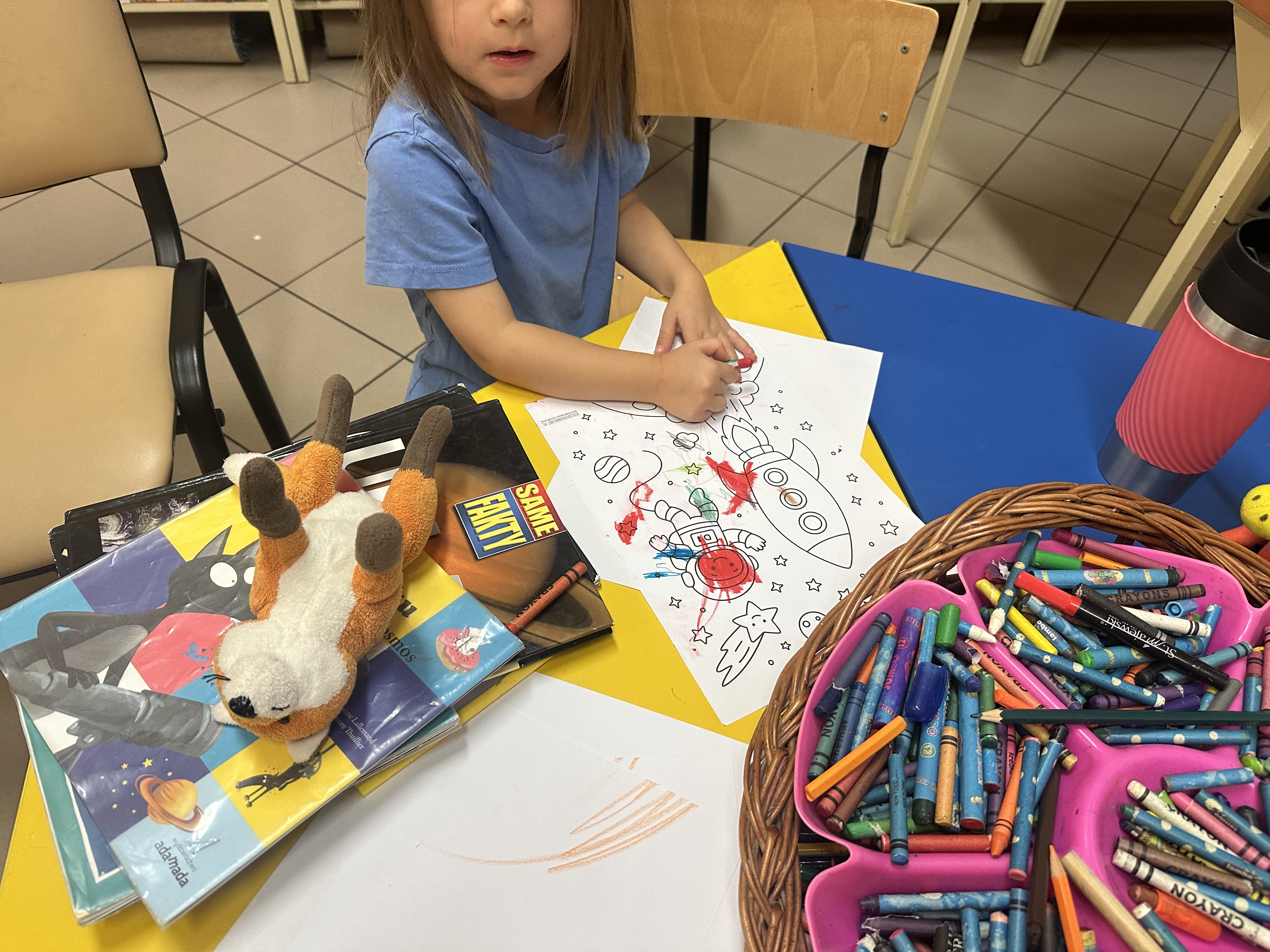 W środku upalnego lata do Filii nr 13 przybyli mali czytelnicy, którzy byli spragnieni dowiedzieć się ciekawostek o kosmosie. W trakcie spotkania dzieci malowały kolorowanki i wysłuchały fragmentów książek: ,, Kicia Kocia w kosmosie'' A. Głowińskiej oraz ,"O wilku który poleciał w kosmos'' O. Lallemand.