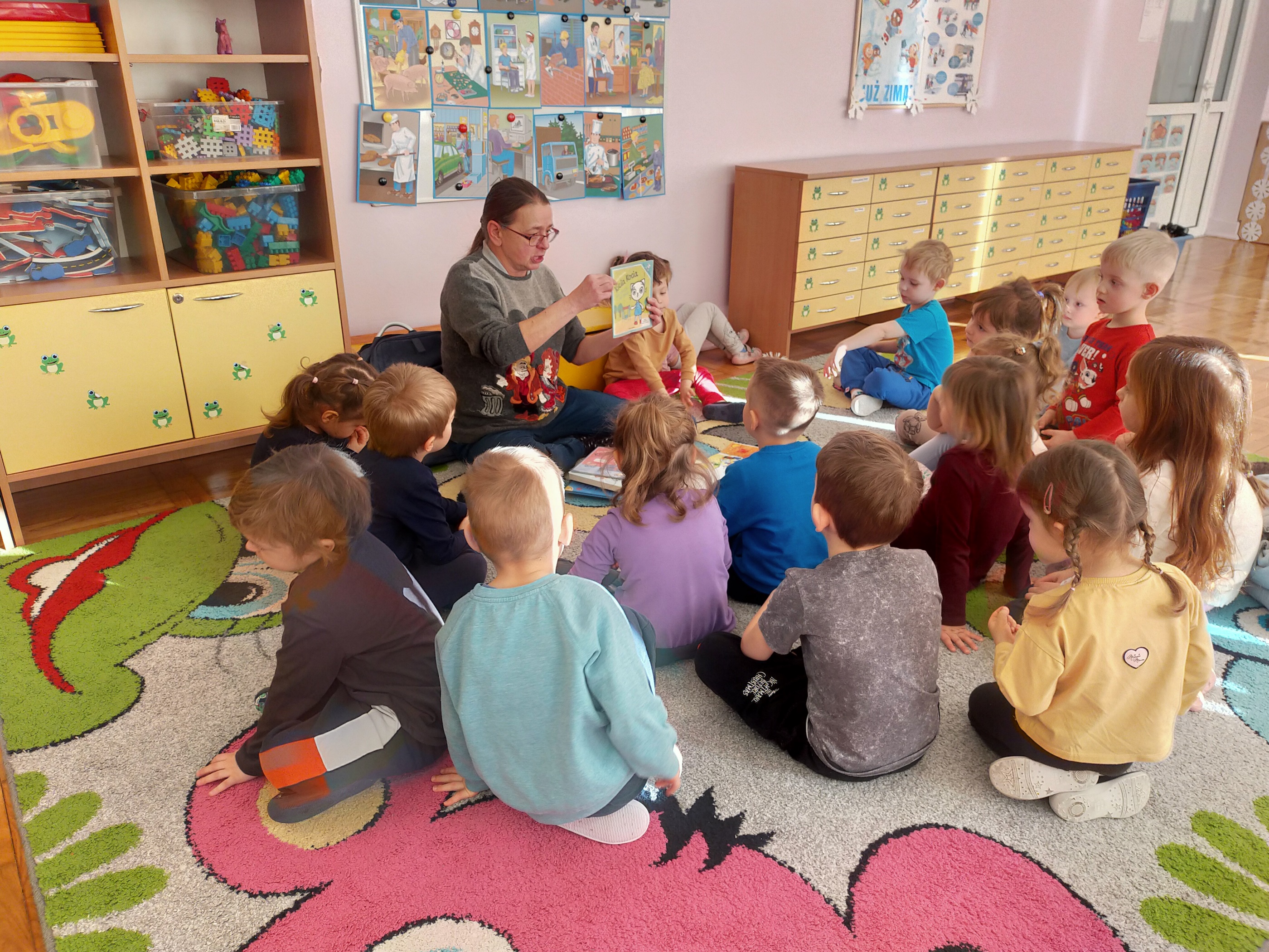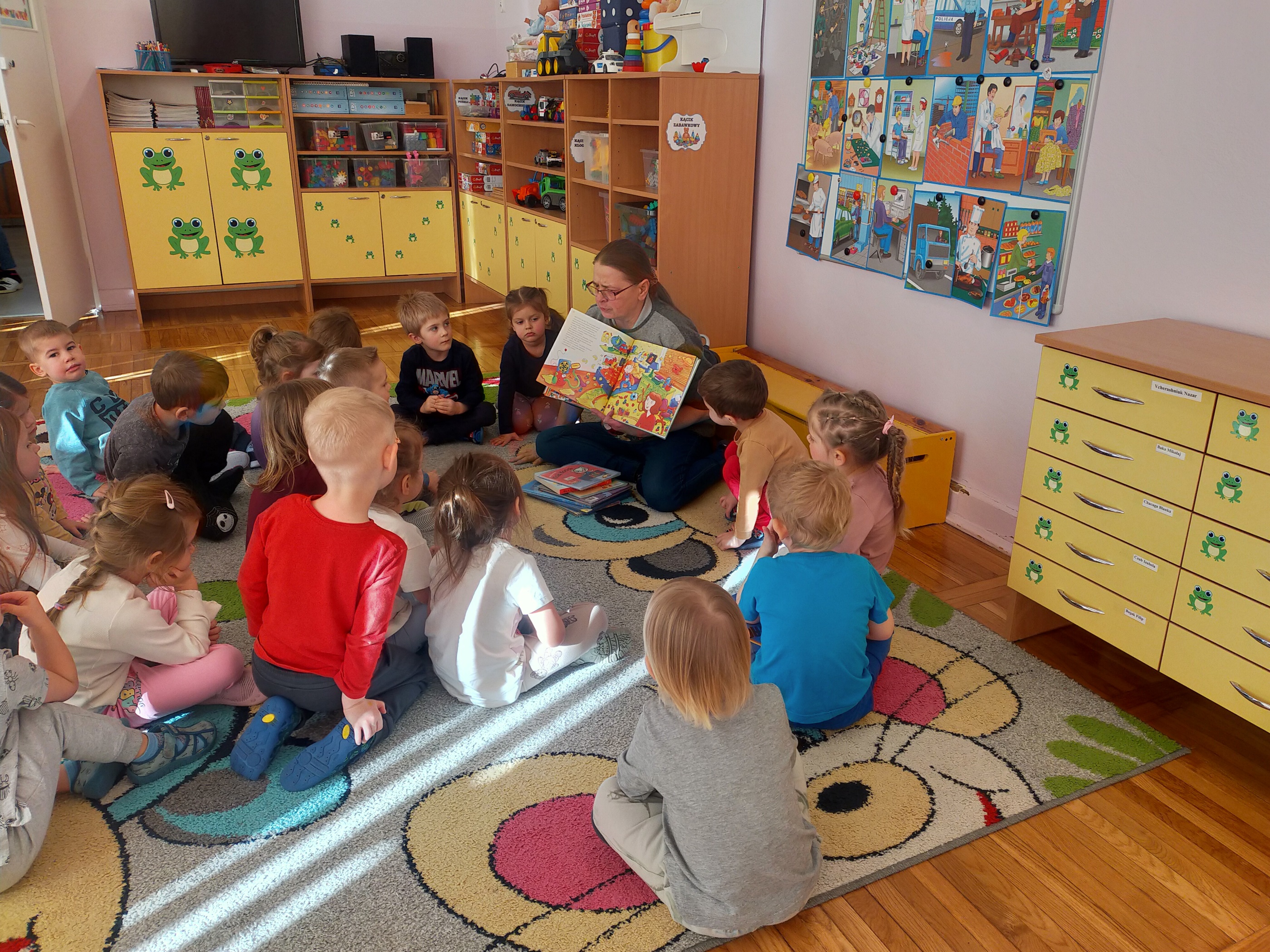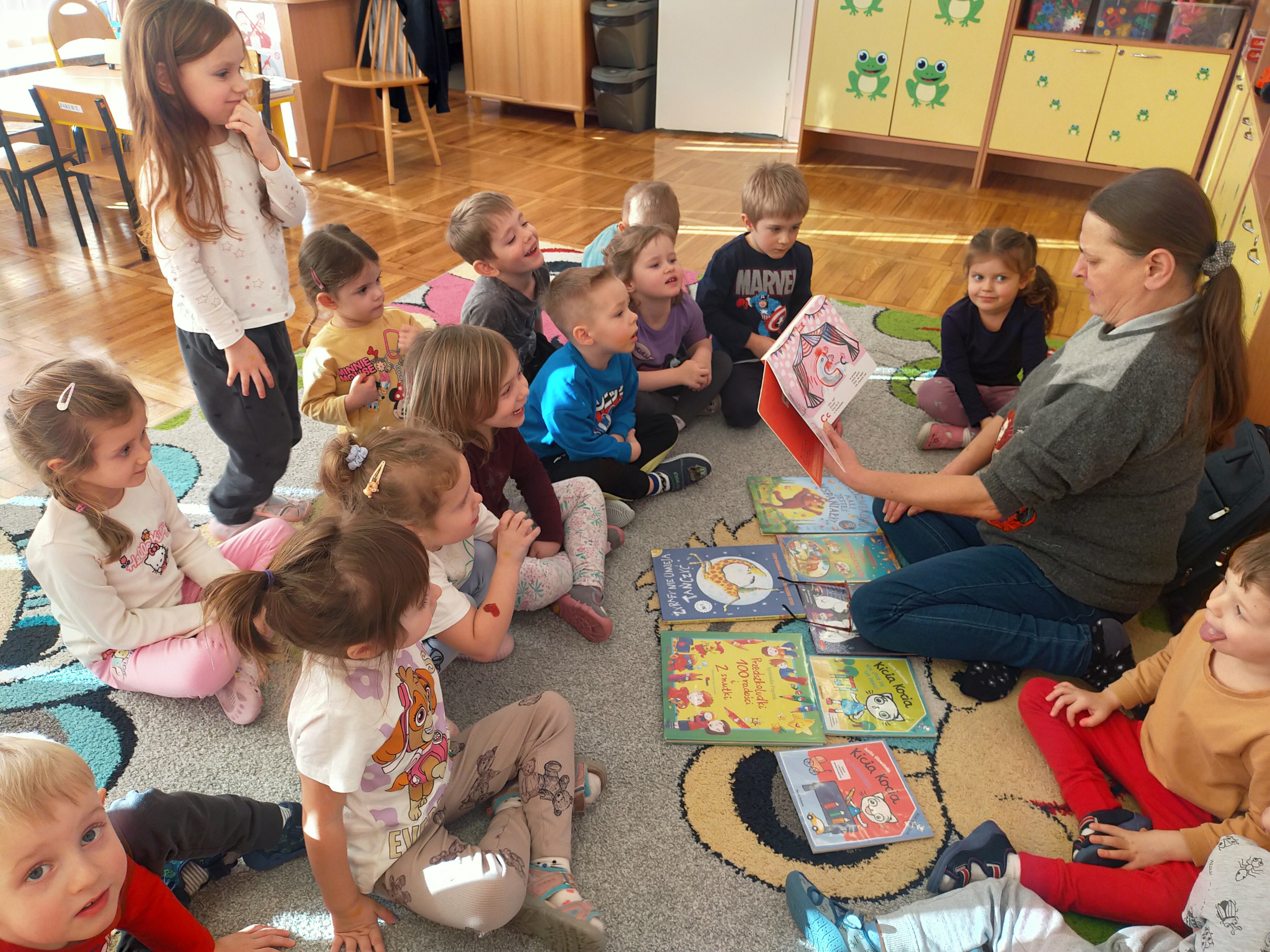 Zdradzimy Wam małą tajemnicę –„Żabki” to rezolutne czterolatki, które poznały już niektóre literki. Aby to sprawdzić, sięgnęliśmy po niewielką książeczkę Oli Cieślak pt. „Czego nie wiecie o alfabecie”. Strona po stronie wraz z przedszkolakami odwiedzaliśmy krainę polskich literek. Spotkaliśmy tam zakatarzone „A”, „E”, które ma focha i w kącie szlocha, „O” na okrągło obmyśla plany i wiele innych. Zabawa przednia, ale pora na małe co nieco i odpoczynek. Jeszcze tylko serdeczne uściski i głośne „Do zobaczenia” – bo na pewno tu wrócimy!