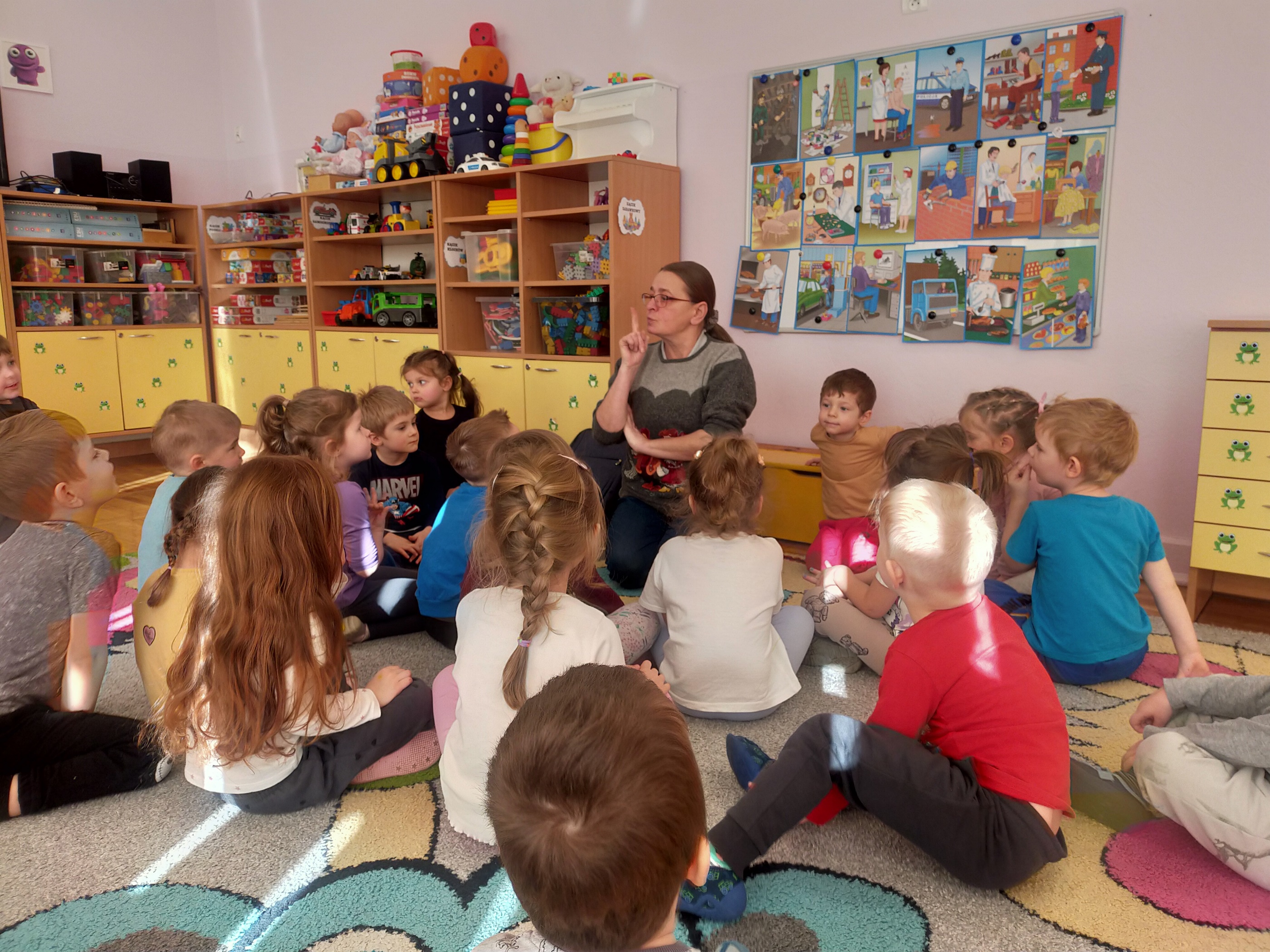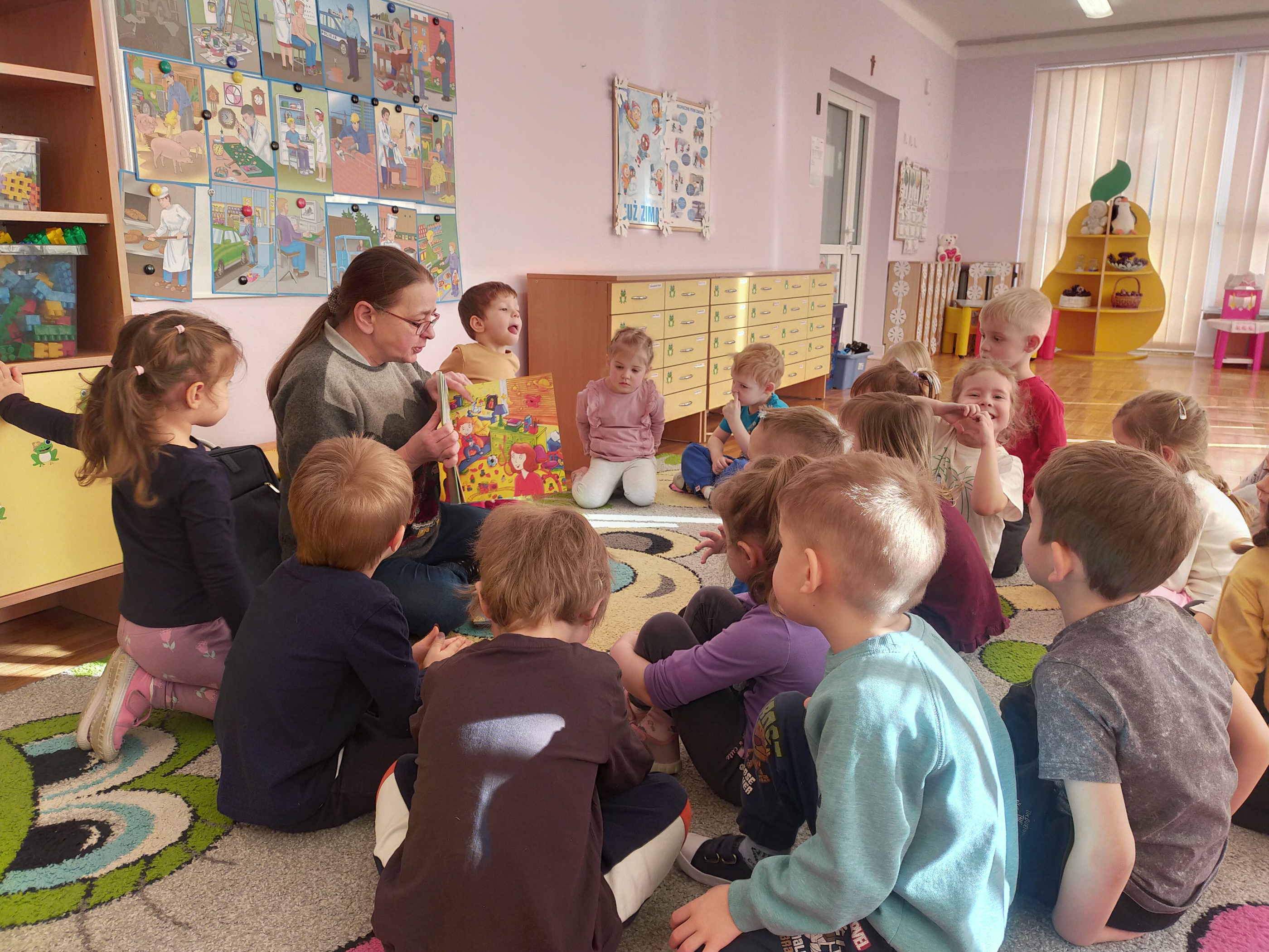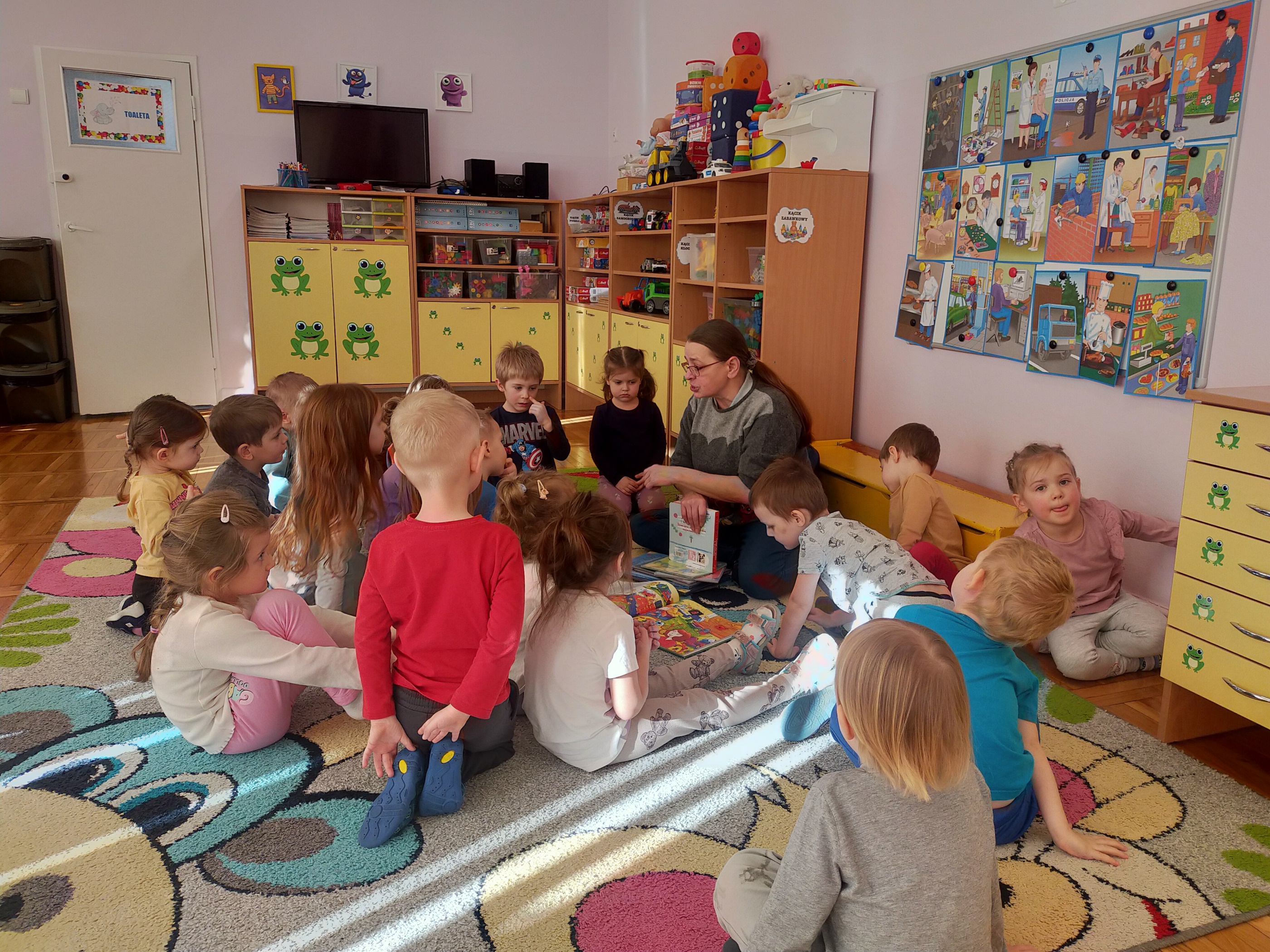 Zdradzimy Wam małą tajemnicę –„Żabki” to rezolutne czterolatki, które poznały już niektóre literki. Aby to sprawdzić, sięgnęliśmy po niewielką książeczkę Oli Cieślak pt. „Czego nie wiecie o alfabecie”. Strona po stronie wraz z przedszkolakami odwiedzaliśmy krainę polskich literek. Spotkaliśmy tam zakatarzone „A”, „E”, które ma focha i w kącie szlocha, „O” na okrągło obmyśla plany i wiele innych. Zabawa przednia, ale pora na małe co nieco i odpoczynek. Jeszcze tylko serdeczne uściski i głośne „Do zobaczenia” – bo na pewno tu wrócimy!