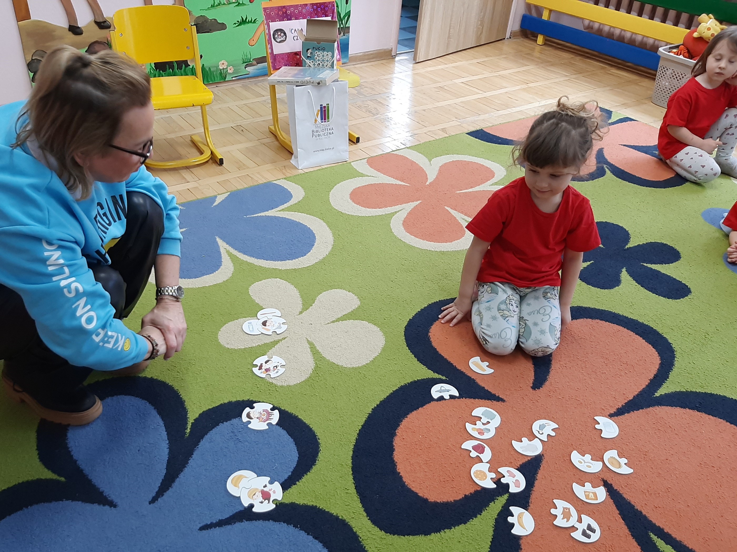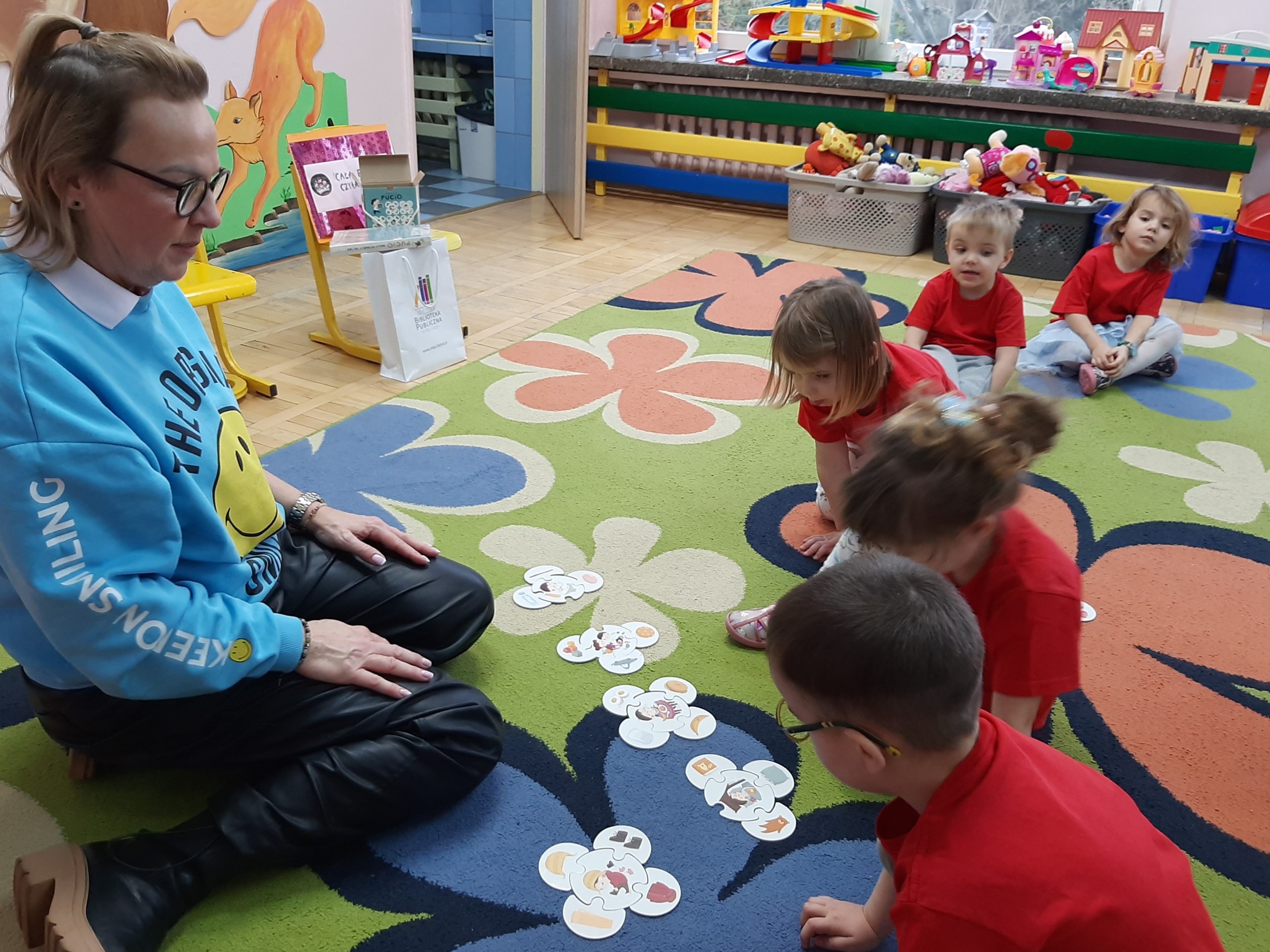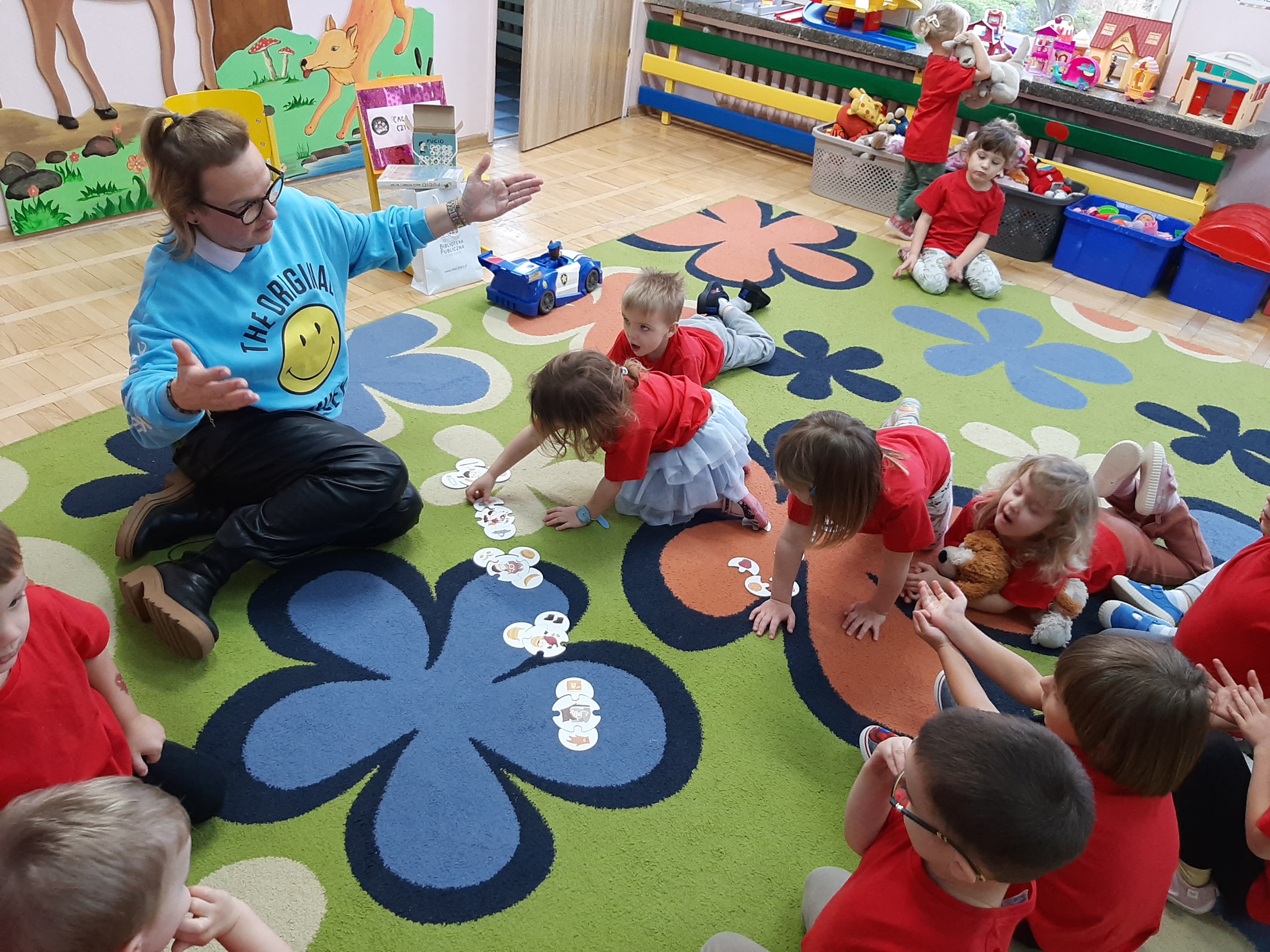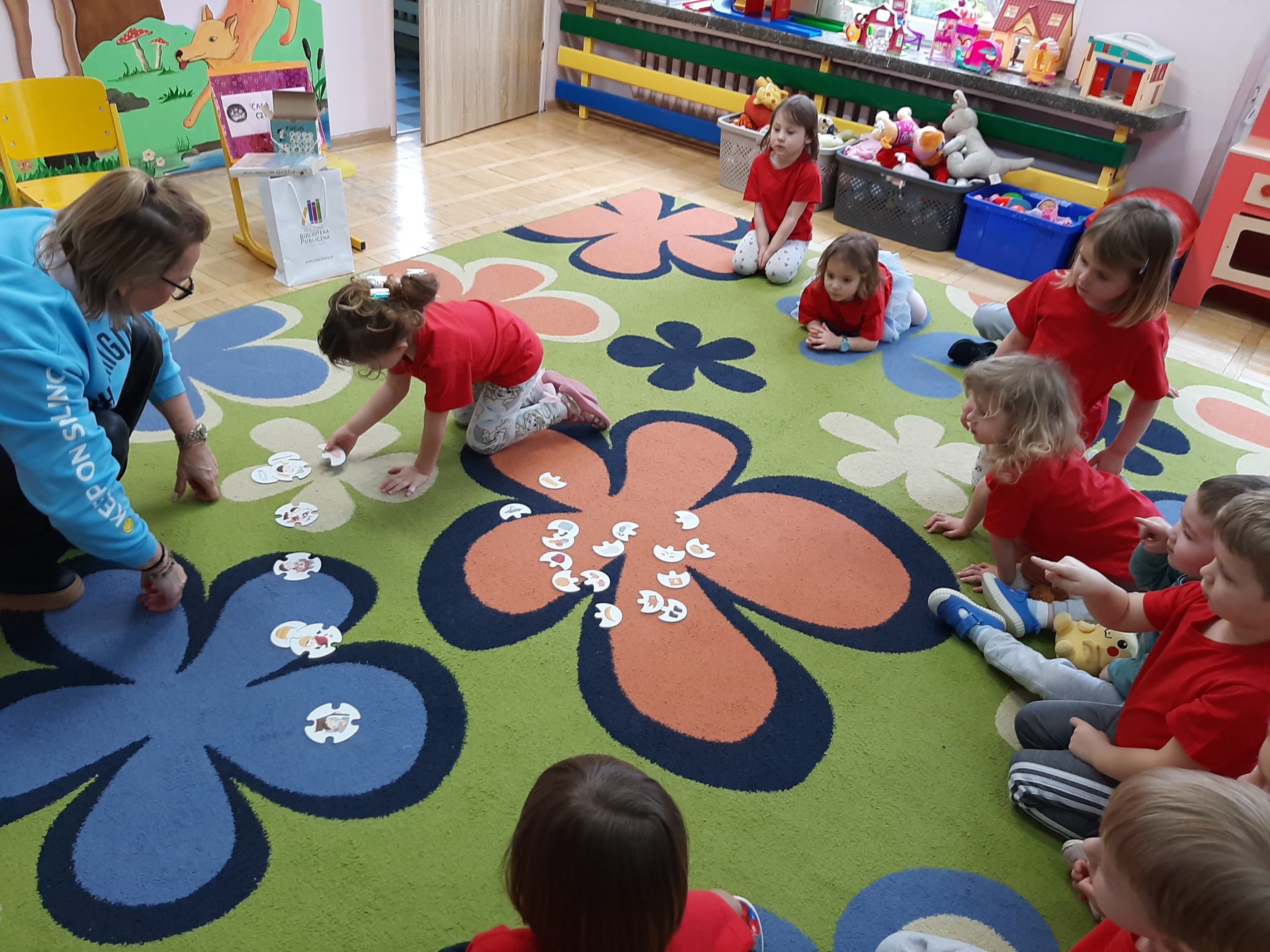 Ciekawy prosty tekst z elementami humoru oraz edukacyjne puzzle zachęciły do aktywnego udziału w zajęciach. Niepostrzeżenie, a zarazem w bardzo atrakcyjny sposób wprowadziliśmy dzieci w świat tak ważnej dla rozwoju komunikacji werbalnej.