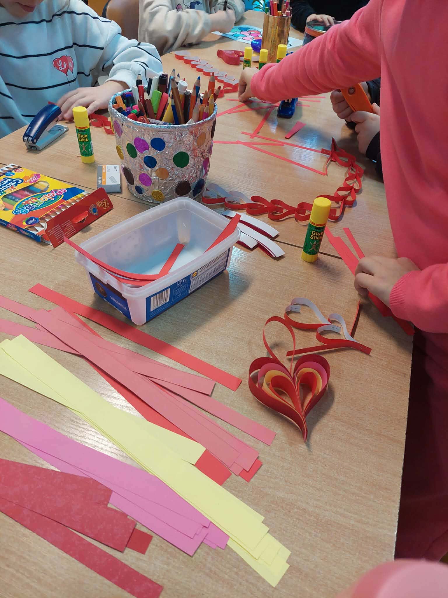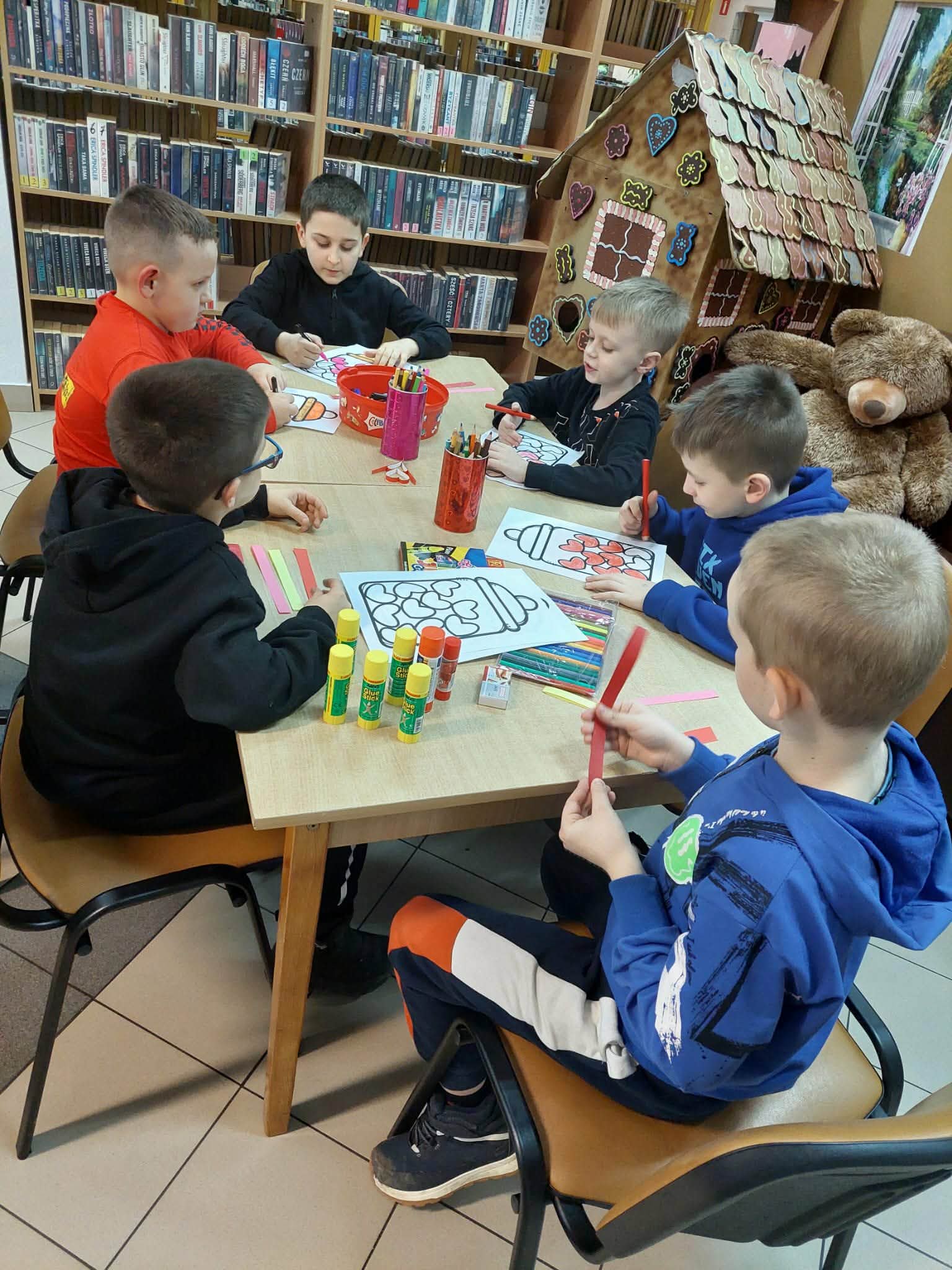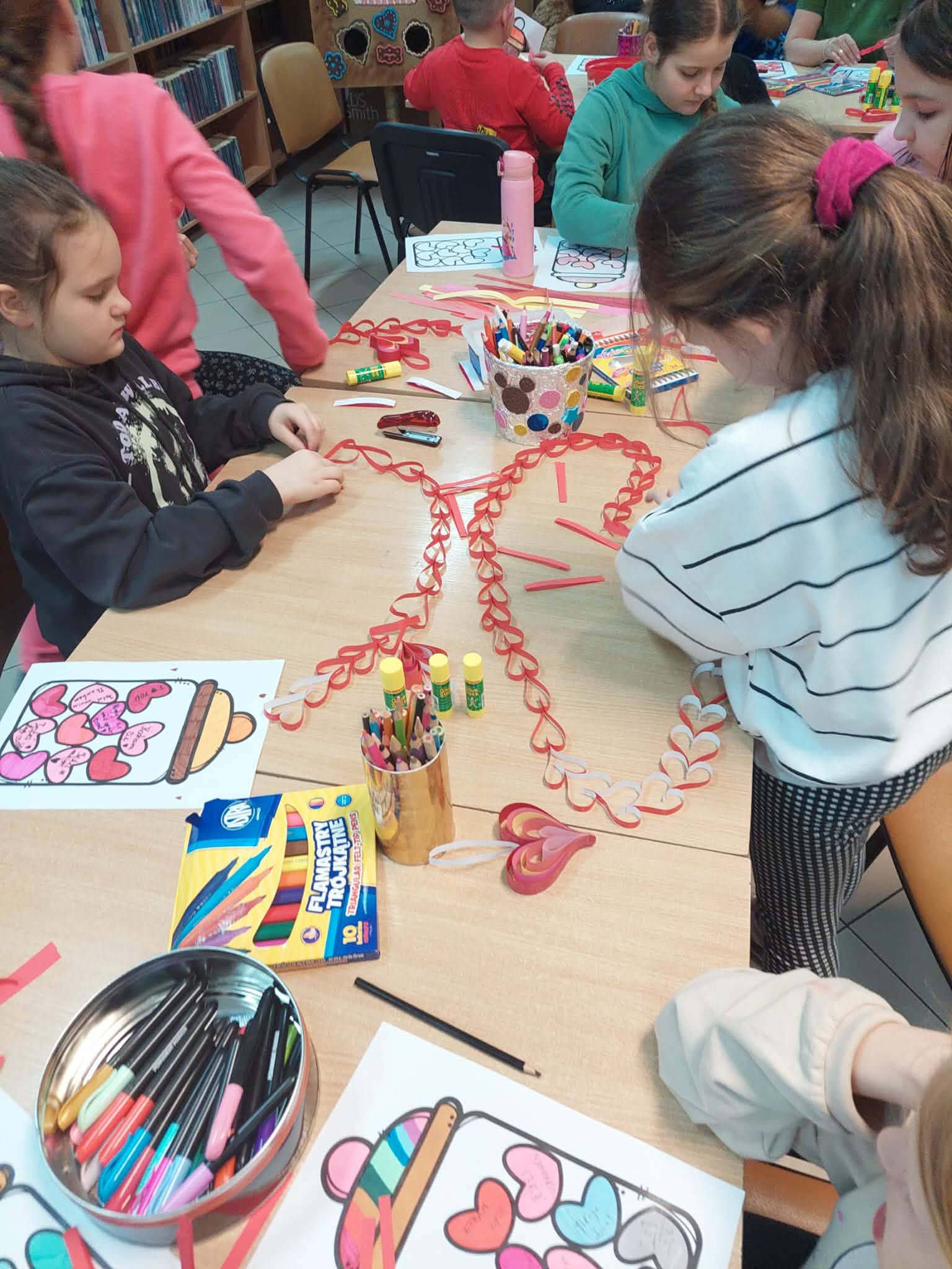W piątkowe popołudnie w filii 10 MBP im. J. Pilcha w Kielcach odbyły się walentynkowe warsztaty, w których wzięły udział dzieci z Placówki Wsparcia Dziennego - Ognisko Wychowawcze z ul. Marszałkowskiej w Kielcach. Podczas warsztatów dzieci tworzyły łańcuchy serc, przestrzenne przywieszki serduszka oraz słoje pełne kuponów miłości i serdeczności. Nie zabrakło również walentynkowej gimnastyki, która dodała energii i mnóstwo radości naszym gościom. Dziękujemy za wspólnie spędzony czas - było twórczo, radośnie i bardzo „serduszkowo”.