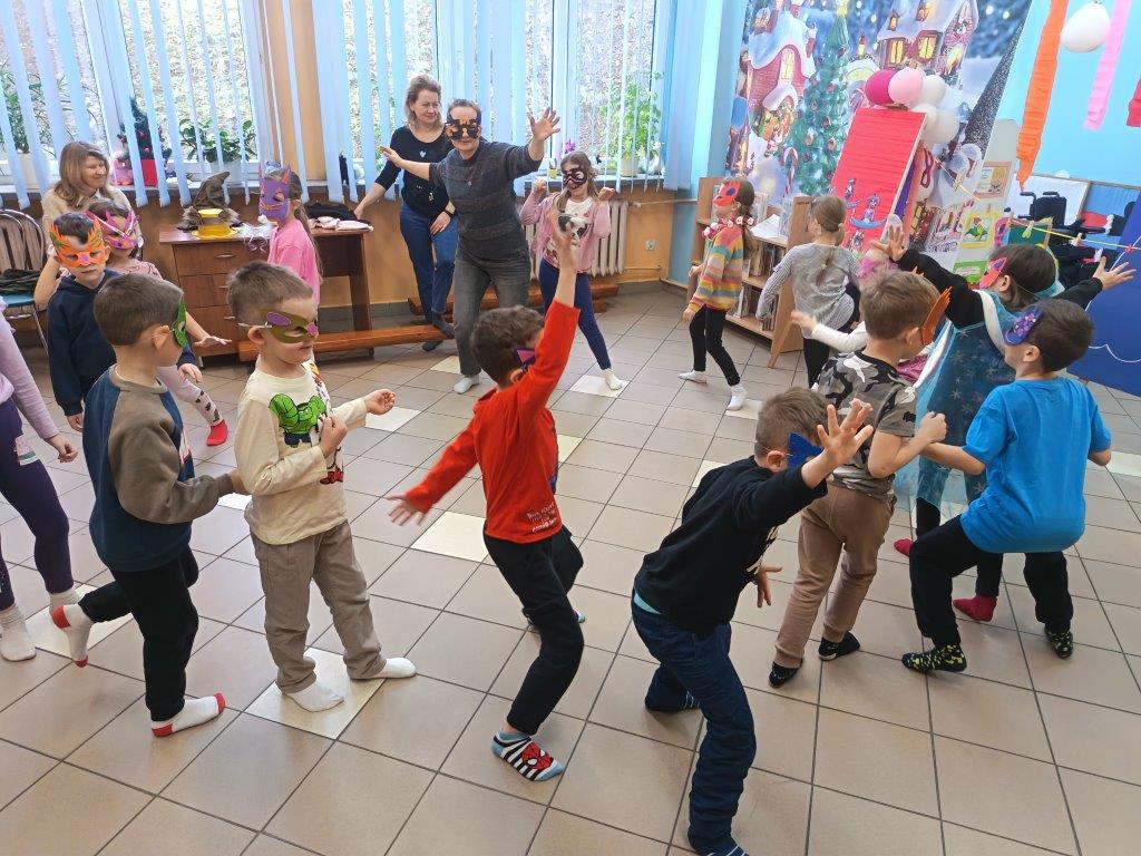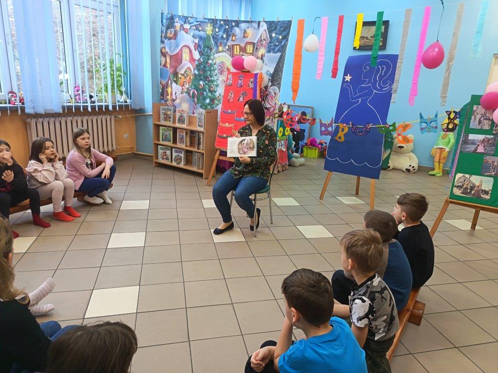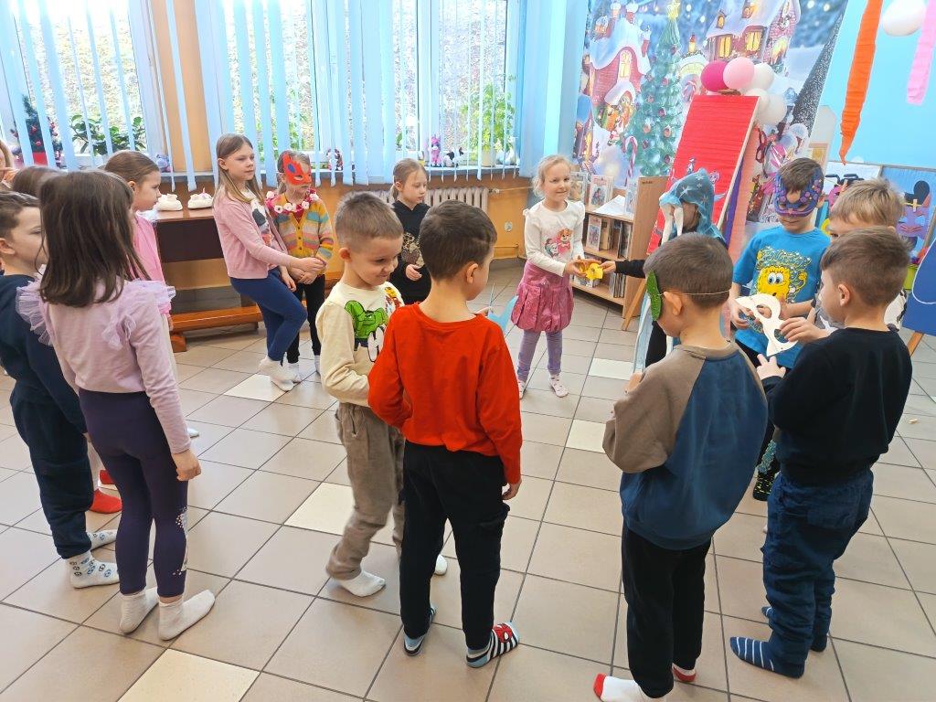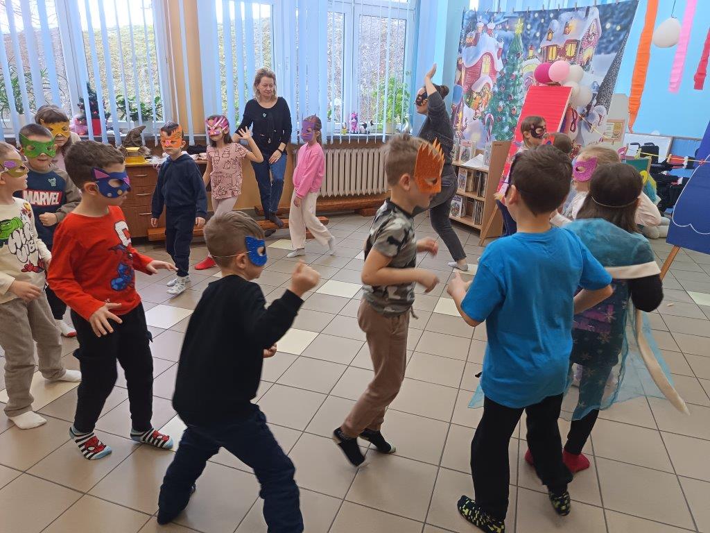 Karnawał to czas zabawy, a dzieci mogą bawić się wszędzie - także w bibliotece. Udowodniła to grupa "Misiaczki" z PS 19, która 6 lutego odwiedziła Filię 11. Na wstępie zajęć przedszkolaki opowiadały, jak wygląda karnawał w Polsce, a od nas dowiedziały się, jakie zwyczaje karnawałowe kultywuje się w Wenecji. Następnie nasi goście wysłuchali książki z serii "Martynka" - było to opowiadanie pt. "Mój królewicz". Wraz z główną bohaterką przenieśliśmy się do Wenecji, gdzie właśnie obchodzono hucznie karnawał i gdzie dziewczynka poznała tajemniczego królewicza uciekającego przed groźną bandą. Po wysłuchaniu opowiadania dzieci odpowiadały na zagadki, a następnie... przystąpiliśmy oczywiście do zabaw tanecznych. Dzieci losowały śmieszne nakrycia głowy i maski, grały balonami, a przede wszystkim tańczyły, bo przecież TRWA KARNAWAŁ.