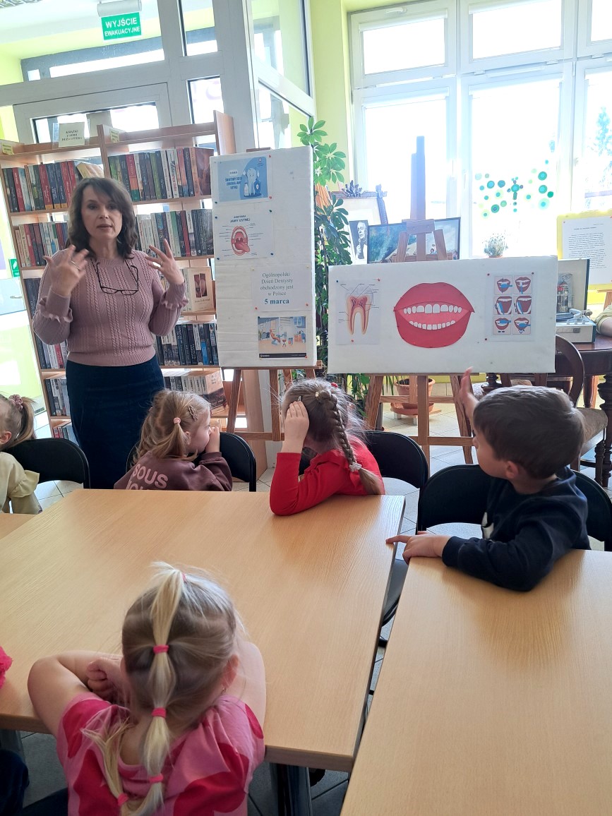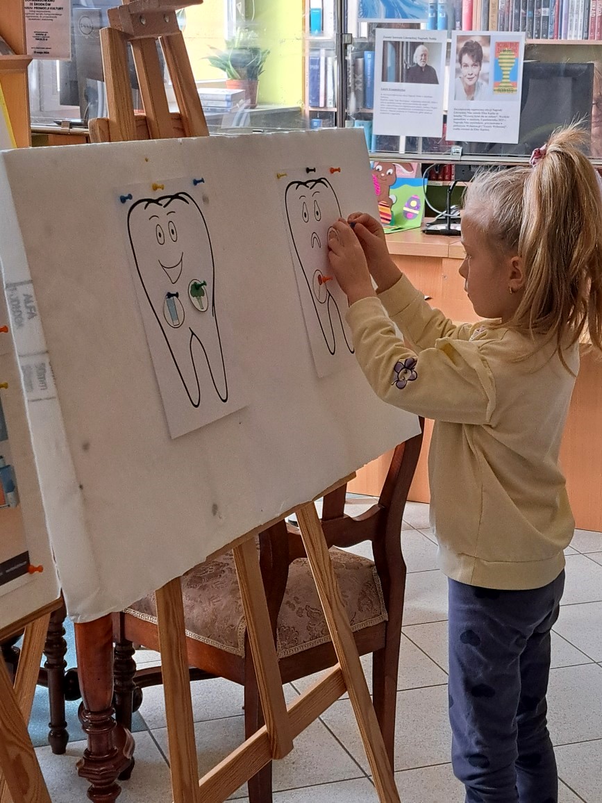 W marcu mamy dwa nietypowe medyczne święta - Ogólnopolski Dzień Dentysty obchodzony w Polsce 5 marca, a 20 marca Światowy Dzień Zdrowia Jamy Ustnej. Z tej to okazji 19 marca zawitała do nas grupa "Motylków" z filii PS nr 2 z ul. Sowiej. Wspólnie dokonaliśmy klasyfikacji żywności na produkty zdrowe i niezdrowe dla uzębienia. Kółeczka przedstawiające artykuły spożywcze dzieci musiały odpowiednio przymocować na tablicy z „uśmiechniętym” lub „smutnym” ząbkiem.