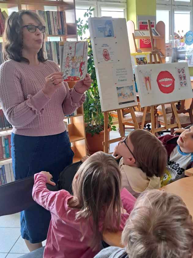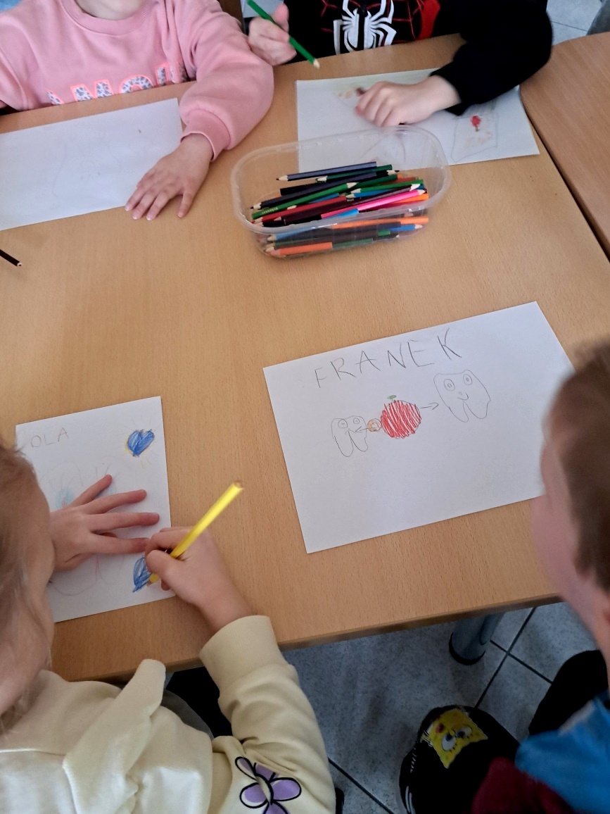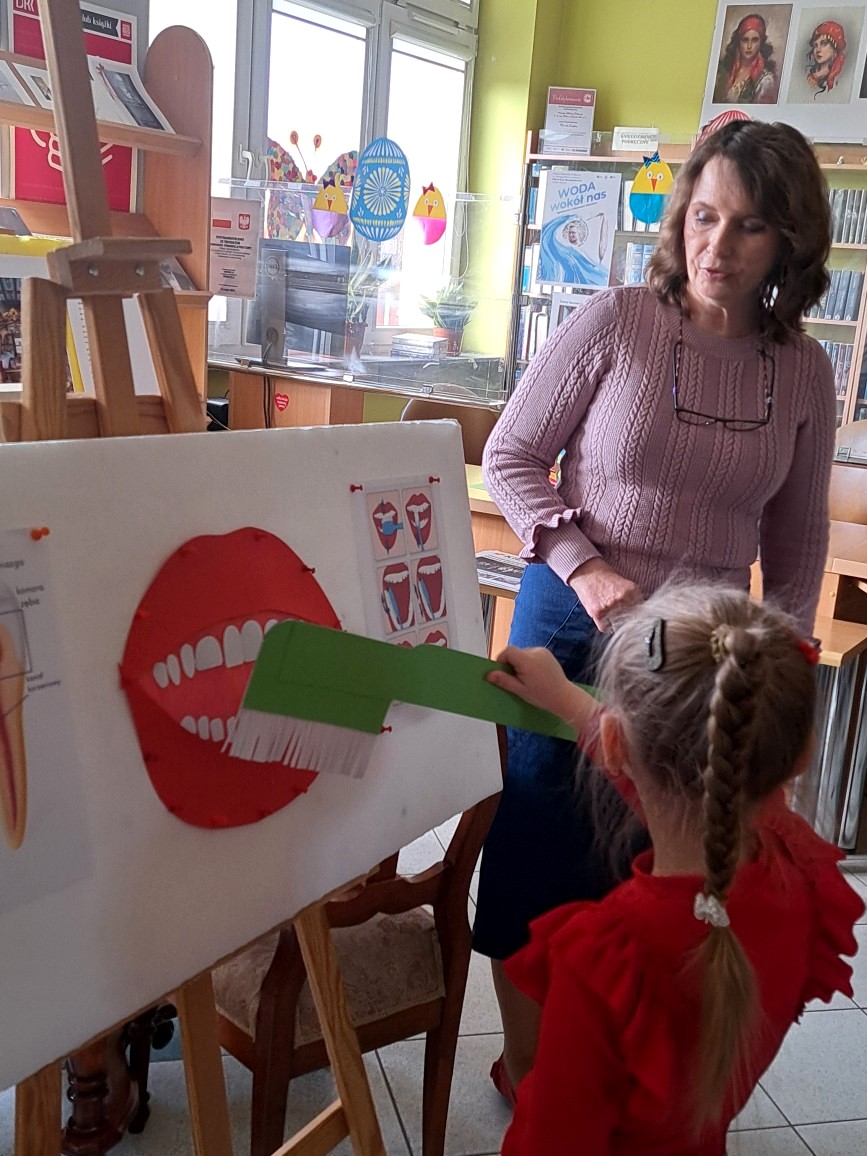 Starszaki znają i lubią książki z serii "Mądra Mysz". W jednej z części przygód o Zuzi nasza urocza bohaterka odwiedziła dentystę. Dzieci oglądając prezentowane ilustracje opowiadały o tym, jak wyglądały ich doświadczenia w gabinecie stomatologicznym. Przy pomocy przygotowanych rekwizytów z papieru - szczoteczki i jamy ustnej, przedszkolaki prezentowały prawidłowe sposoby mycia zębów. Na zakończenie spotkania „Motylki” malowały obrazki związane z prawidłowymi nawykami stomatologicznymi i zdrowym jedzeniem.