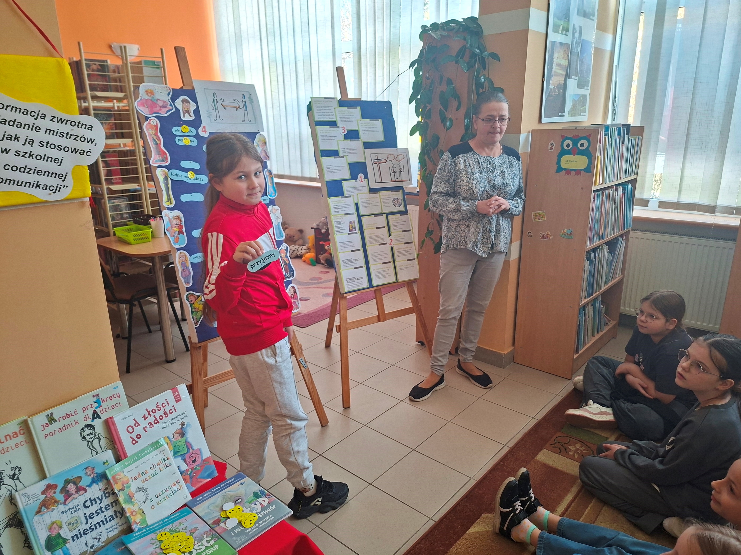 Pierwsze koty za płoty – pora na kolejne starcie – tym razem z emocjami, jakie towarzyszą informacji zwrotnej. Odpowiedź to nie tylko słowa, mimika, czy gesty – to przede wszystkim emocje, które im towarzyszą. Każdy z nas codziennie coś czuje – czasem jesteśmy szczęśliwi, czasem smutni, a innym razem zdenerwowani. Ważne jest, abyśmy umieli rozpoznawać to, co czujemy i potrafili o tym otwarcie mówić. Aby ułatwić to naszym gościom zaprosiliśmy ich do wspólnej zabawy. Biblioteka zamieniła się w scenę. Pojawiali się aktorzy i role związane z losowo wybranymi słowami. Słowa te to owe informacje zwrotne. Każdemu towarzyszyły emocje – zadaniem było ich odgadnięcie. Jak poradzili sobie młodzi miłośnicy języka? Powiemy jedno – doskonale! Od dziś wiedzą, że informacja zwrotna to nie krytyka, ale pomocna dłoń, która pozwala stawać się lepszym.