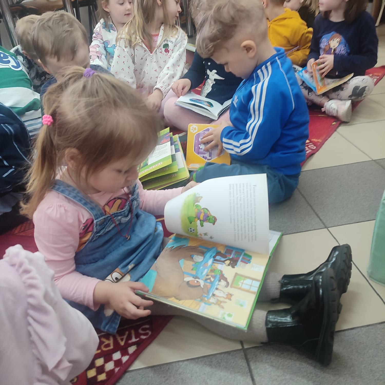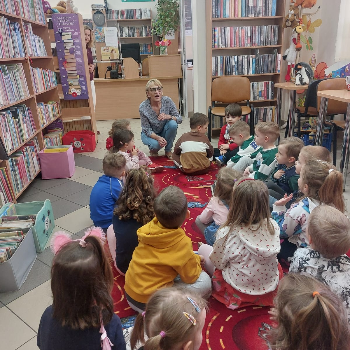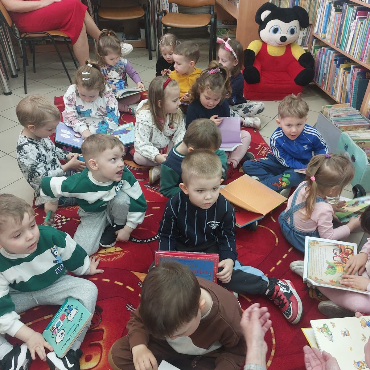 Pierwsza wizyta przedszkolaków w bibliotece była wyjątkowa. W słoneczny, ciepły dzień dzieci przyszły spacerem, pełne ciekawości i energii. Promienie słońca wpadały przez duże okna, tworząc przytulną atmosferę zachęcającą do odkrywania książek. Na początku bibliotekarka opowiedziała dzieciom, jak należy zachowywać się w bibliotece i pokazała kolorowe półki pełne bajek. Przedszkolaki z zainteresowaniem oglądały książeczki, wybierały swoje ulubione i słuchały głośnego czytania. „Kamyczek w bibliotece” wzbudził wśród nich ogromne zainteresowanie. To był dzień pełen radości, nowych doświadczeń i pierwszych kroków w świecie książek.