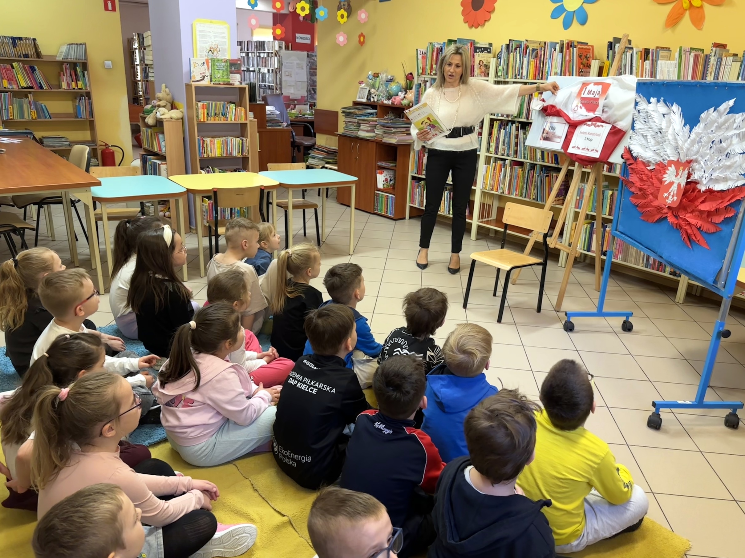 29 kwietnia, wspólnie z klasą „O”a rozmawialiśmy o tym, dlaczego początek maja jest dla Polaków wyjątkowy. Dzieci poznały polskie symbole narodowe i dowiedziały się, jak należy dbać o flagę. Wspólnie wyjaśniliśmy sobie pojęcie "ojczyzna" i wytłumaczyliśmy, dlaczego świętujemy 1 maja, 2 maja, a także rocznicę uchwalenia Konstytucji 3 Maja. Na zakończenie odbył się konkurs układania puzzli z symbolami narodowymi.